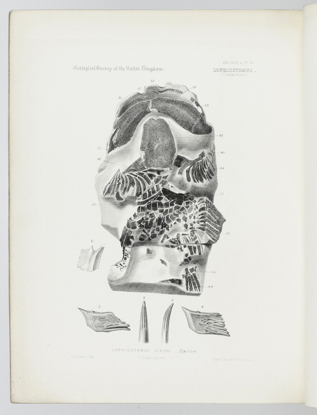 A rare, uninterrupted series, from the start. Mostly dealing with sea urchins, trilobites and fish. Well-illustrated. The work was published in issues, with new pagination to each plate. The number of pages for each plate varies between two and 12. The preface is by Henry de la Beche, the descriptions are nearly all by John William Salter (1820-1869), and include new species. The British naturalist and palaeontologist Edward Forbes (b. 1815) died in 1854. Cat. BM(NH) lists only the first five parts under his name. In total, 13 parts were issued up to 1866 - this is about two-thirds of the total published. Uncut. With very wide margins. We have seen copies in 8vo format, which are no match. Soiling to wrappers. Rear wrapper of part VIII, and front wrapper of part IX lacking, several wrappers detached, but otherwise a very good, unmarked set. Cat. BM(NH) Supplement, p. 334. Not in Ward and Carozzi.