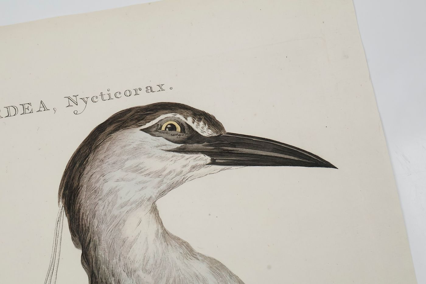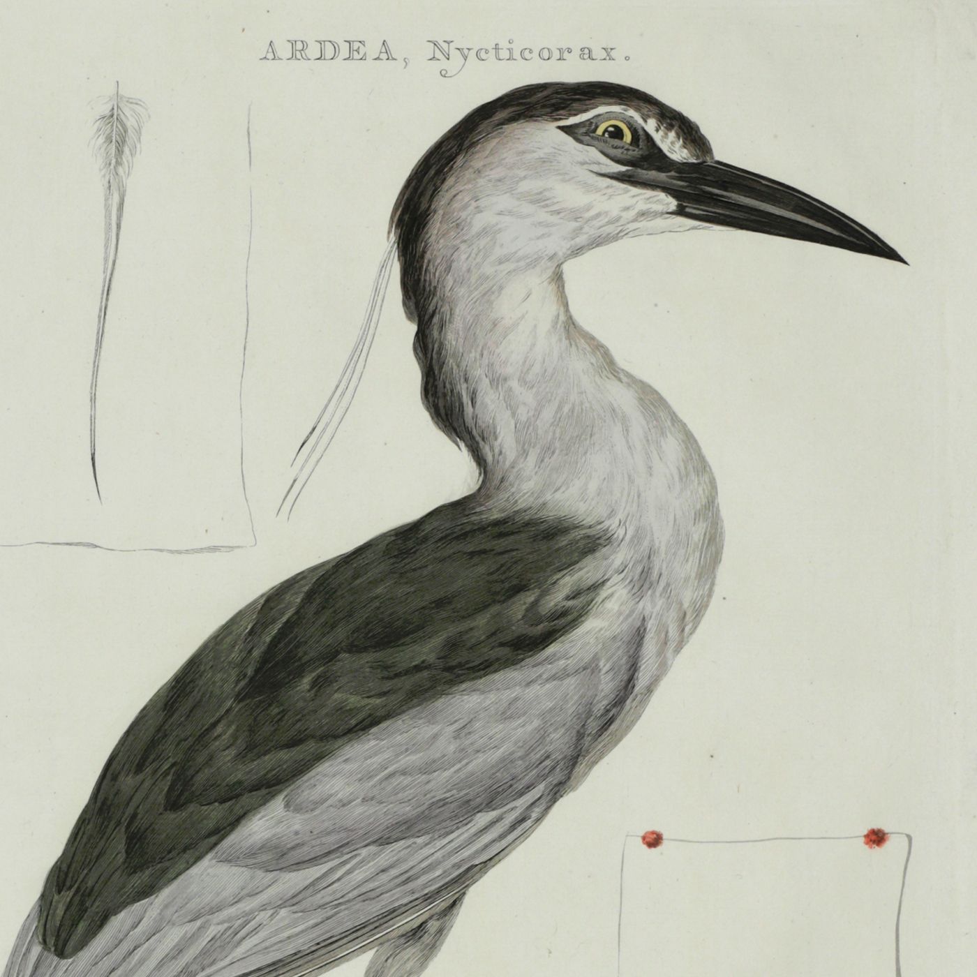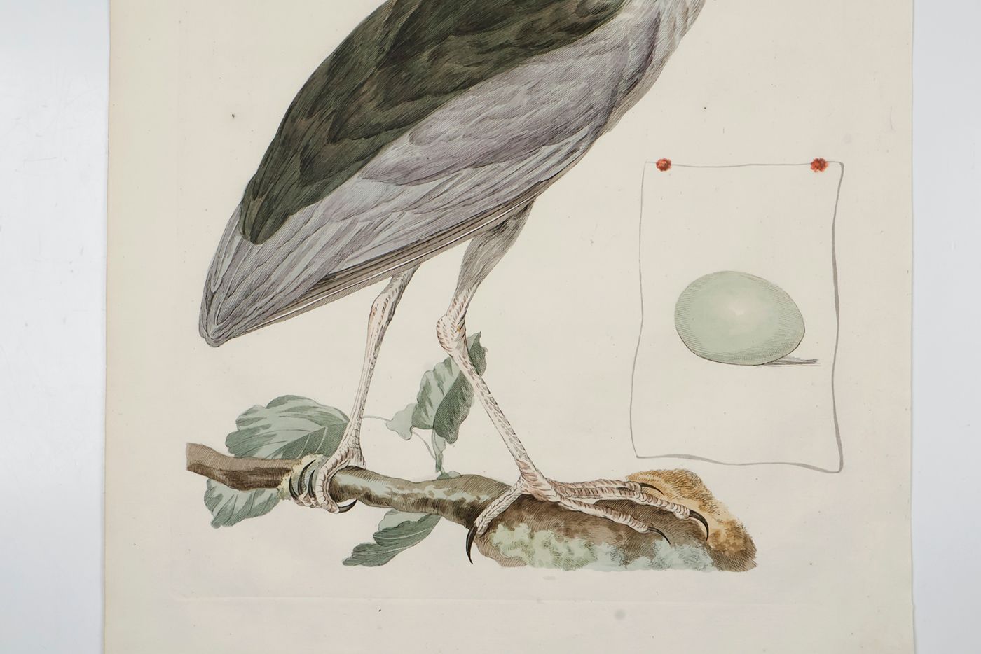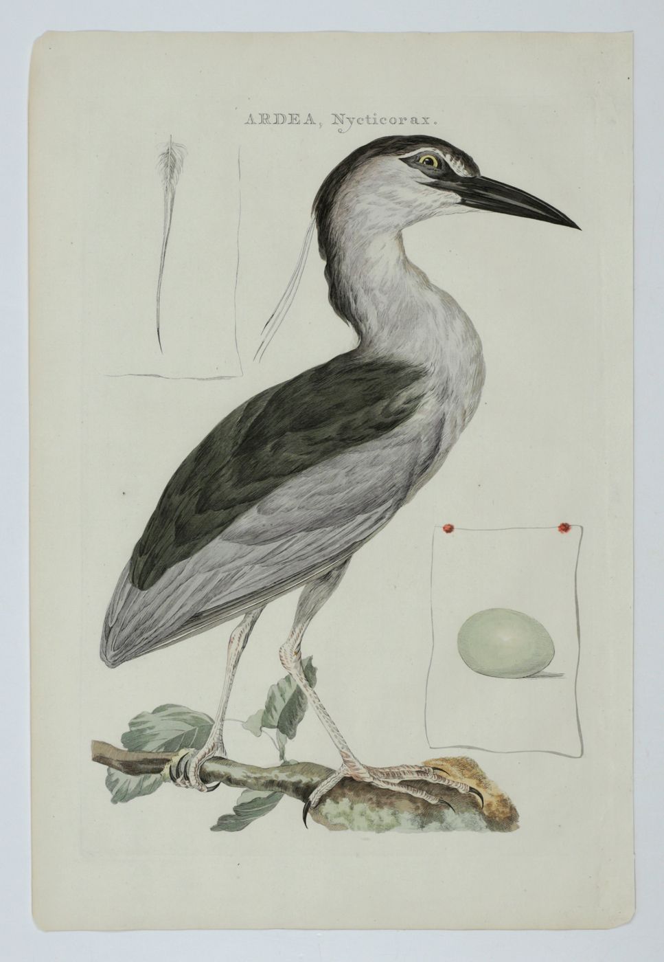Amsterdam, Jan Christiaan Sepp, 1770. Single sheet, large folio (52.3 x 35.8 cm). Printed surface 44.2 x 30.0 cm. Hand-coloured copper-engraved plate of Nycticorax nycticorax (L.) and its egg.