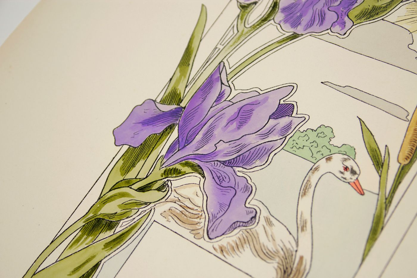 An excellent original Art Nouveau ‘poster’, with beautifully coloured irises. Possibly a design for a mirror or folding screen. The Viennese firm, Bier & Schöll - situated in the Tegetthoffstrasse - specialized in applied art, painting supplies and publishing, and was active from the late 1800s until the 1920s. A 1900 advertisement stated Grösstes Specialwarenhaus der Monarchie · für Malerei jeder Art, Brandmalerei-Apparate, Laubsägerei, Photographie, Kerb- und Lederschnitt sowie alle Dilettantenarbeiten · Bier & Schöll, Wien, I., Tegetthoffstrasse Nr. 9. [Largest special department store in the monarchy for painting of all kinds, pyrography apparatus, fretwork, photography, wood cutting and leather cutting as well as all amateur hobbies]. After 1915 the name was changed to Richard Bier. A very attractive, fine, large plate, and a very rare - if not unique - item. Slight, marginal fraying and minimal soiling; otherwise very good, clean. Not in Schneider-Henn, Ornament und Dekoration.