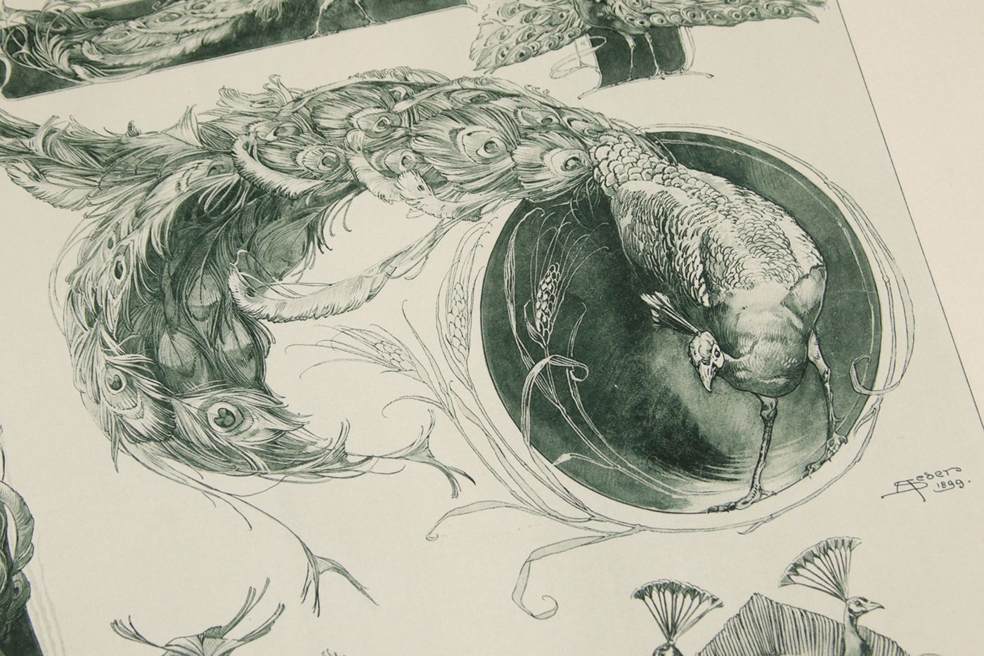 A very rare plate from Anton Johann Nepomuk Seder's Das Thier [ l'Animal - The Animal], with the finest and most stunning plates of Art Nouveau book design. It is hard to underestimate the beauty and importance of this work by the famous German Art Nouveau painter and art professor, who lived from 1850 to 1916. Each plate from this work is a true highlight of artistic design and absolutely breathtaking. Seder's work had many followers in the Art Nouveau and Art Deco movements and afterwards; original individual plates are still highly in demand. The quality of this lithograph is absolutely first class. Some minimal creasing to the top and left edge; a few tiny spots. Otherwise, an exceptionally well-preserved print in excellent condition. Schneider-Henn, Ornament und Dekoration, 200.