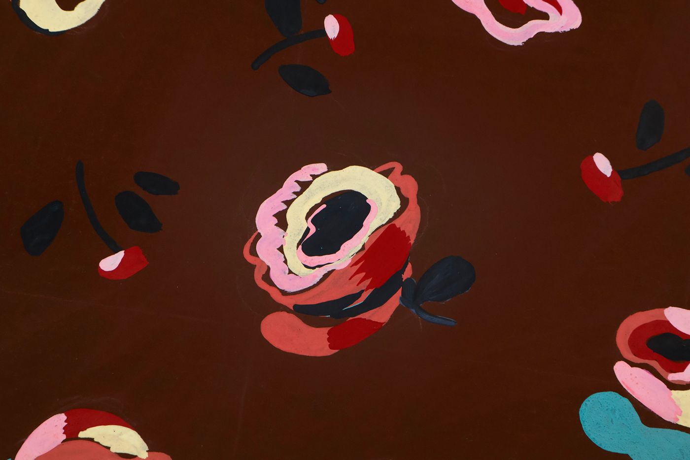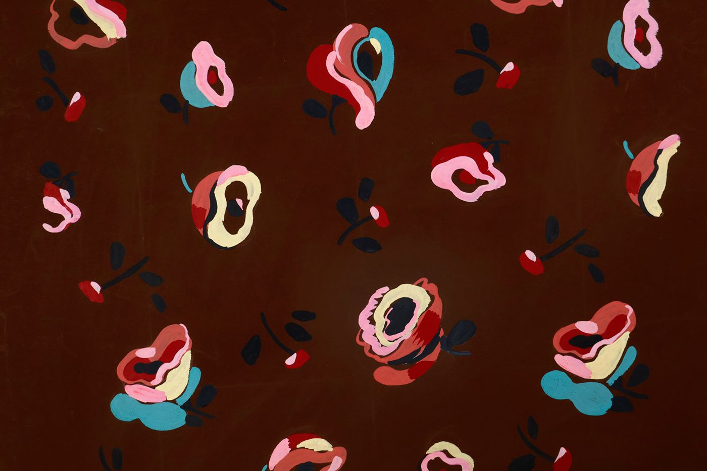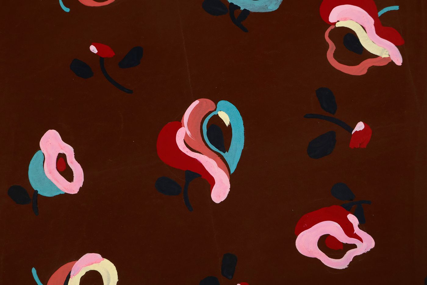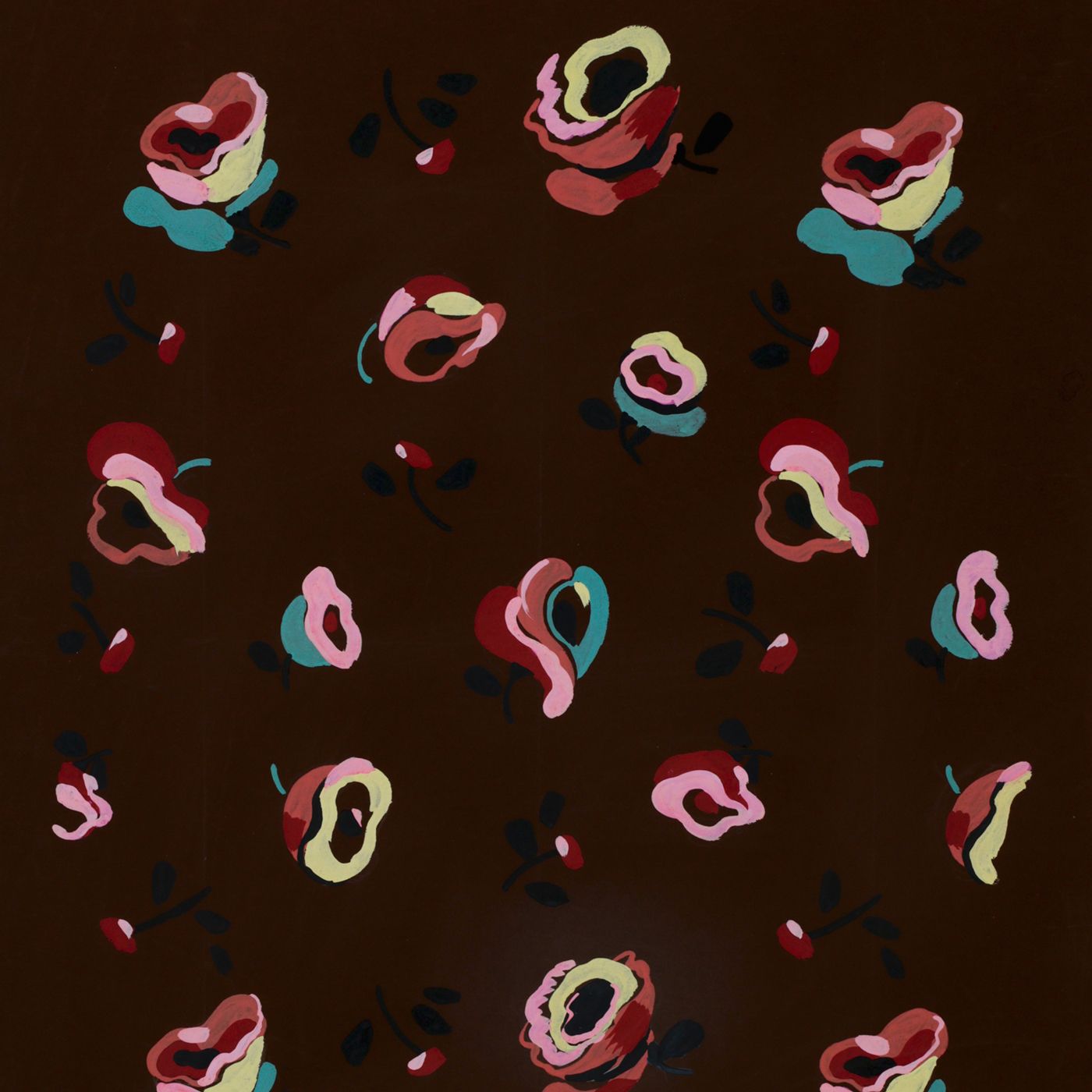 The French firm of Travard was a major designer of wallpaper and textile used for curtains and furniture. Their designs made during the 1920's, rank among the most beautiful Art Deco designs. The designers used various templates in their compositions, and a wide variety of motifs and colours. This one shows almost hallucinating fruits in red, brown, pink, and yellow, with green stems and leaves. Travard blind-stamp in the lower right corner. Some small, marginal damp-stains, as well as a few short tears and chips near the edges; otherwise, fine, the colouring fresh and bright.