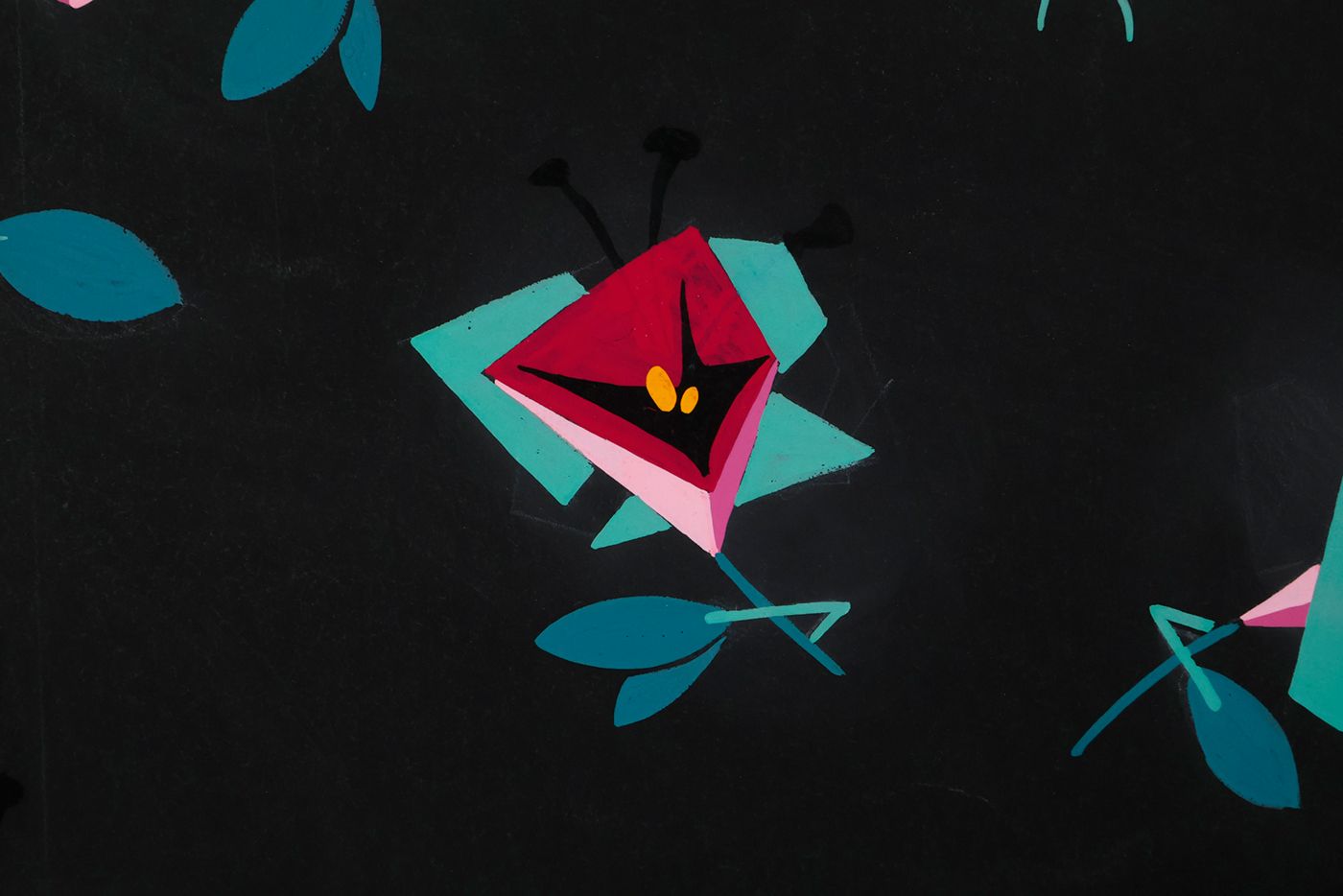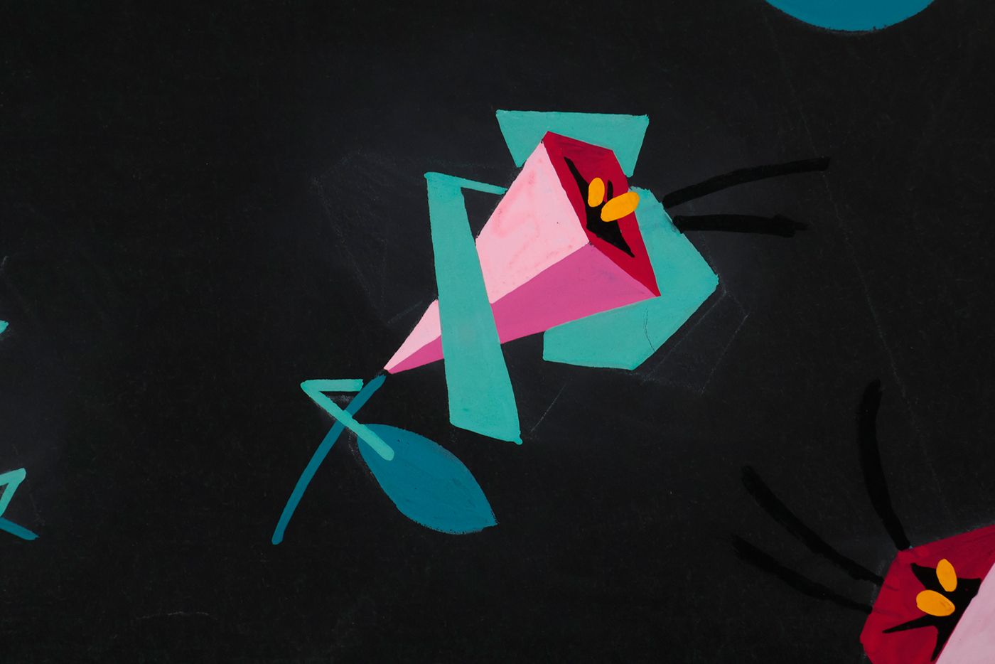 The French firm of Travard was a major designer of wallpaper and textile used for curtains and furniture. Their designs made during the 1920's, rank among the most beautiful Art Deco designs. The designers used various templates in their compositions, and a wide variety of motifs and colours. This one shows "cubist" flowers in pink, purple, yellow and green, on black paper. Travard blind-stamp in the lower right corner. Four pinpoint holes in the margins, some marginal creasing, and chipping, otherwise fine, the colouring fresh and bright.