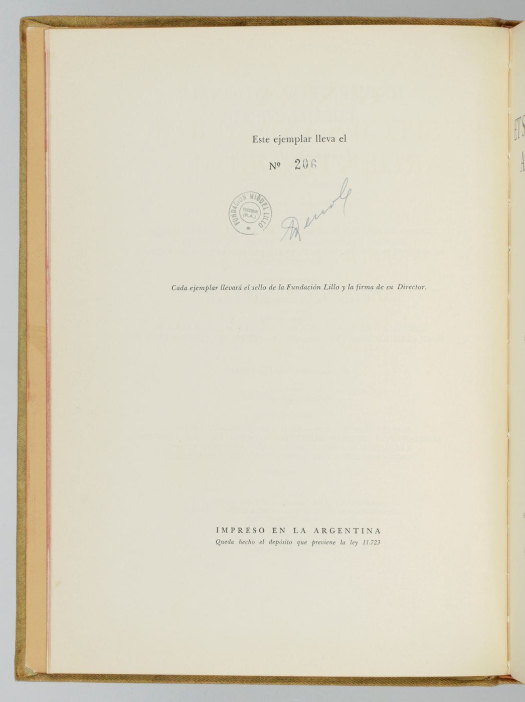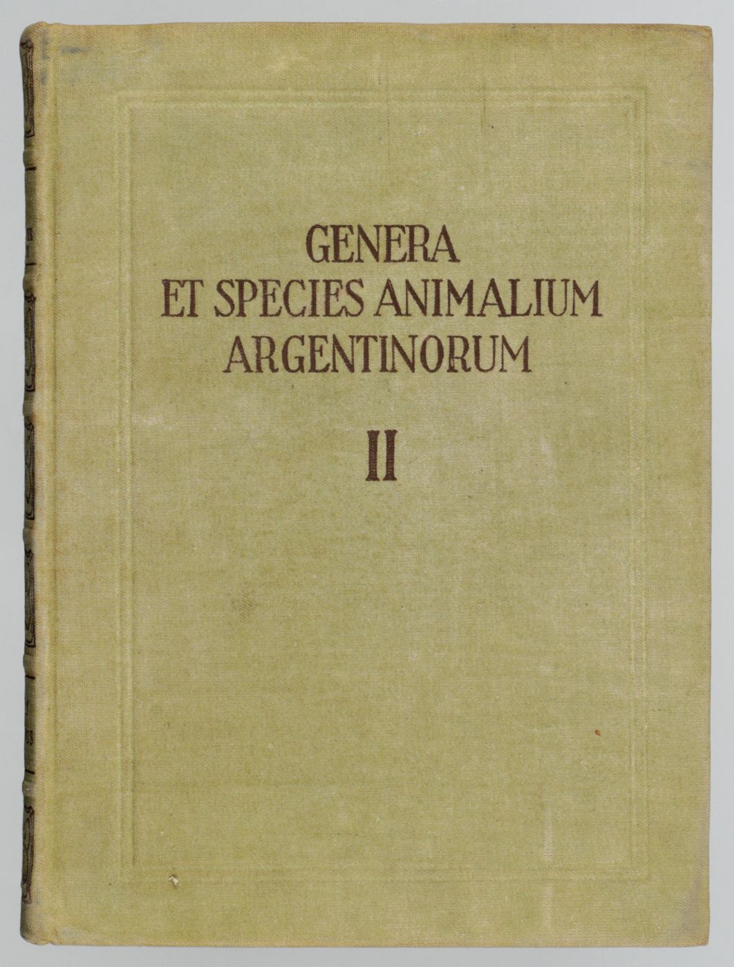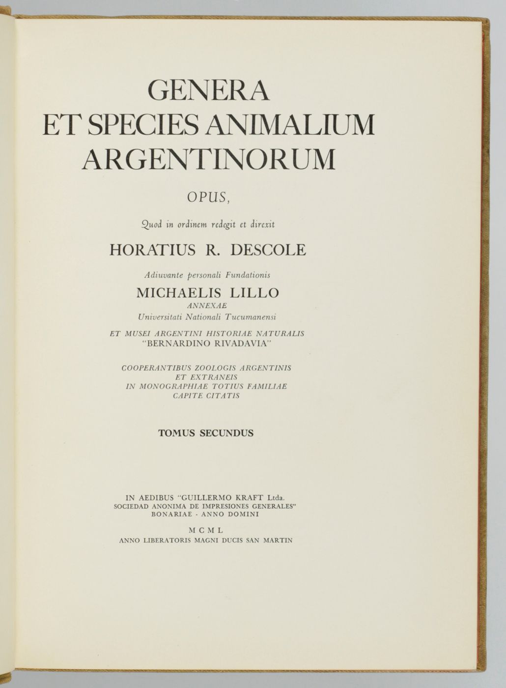 Bonariae (Buenos Aires), G. Krafft, 1950. Large 4to (35.3 x 26.3 cm). Several title and dedication pages, 388 pp.; 26 plates (of which 12 in full colour). Original embossed and printed cloth. Pictorial endpapers. Edges red.
