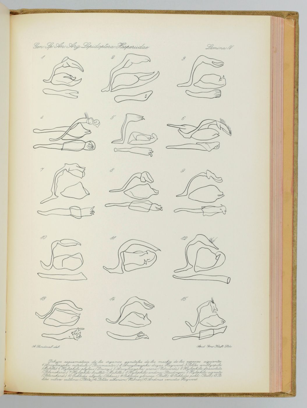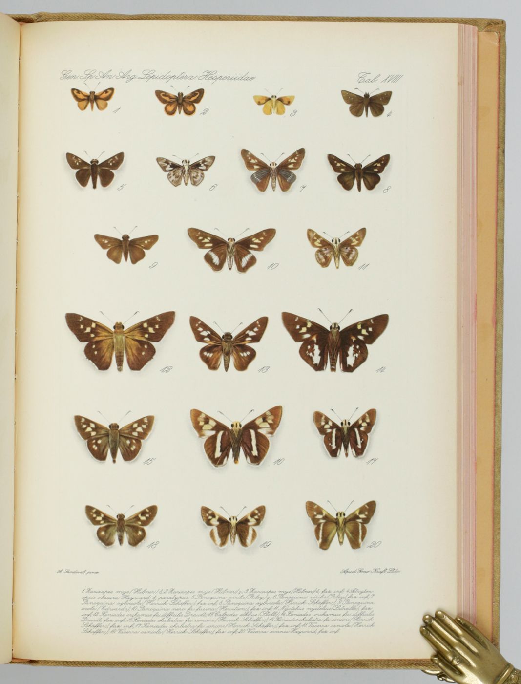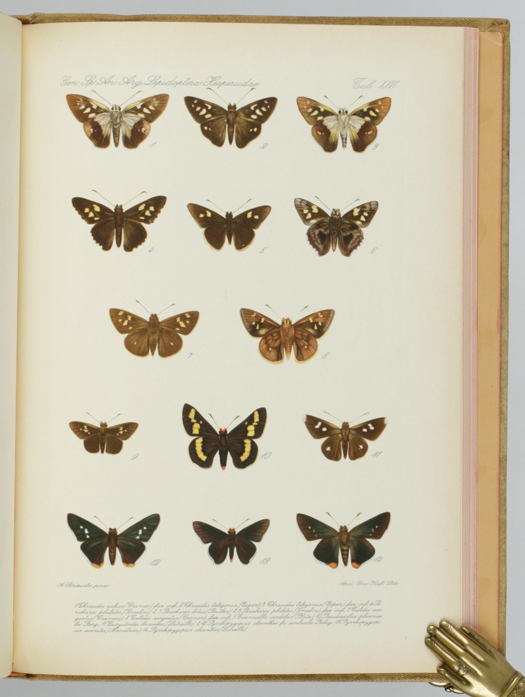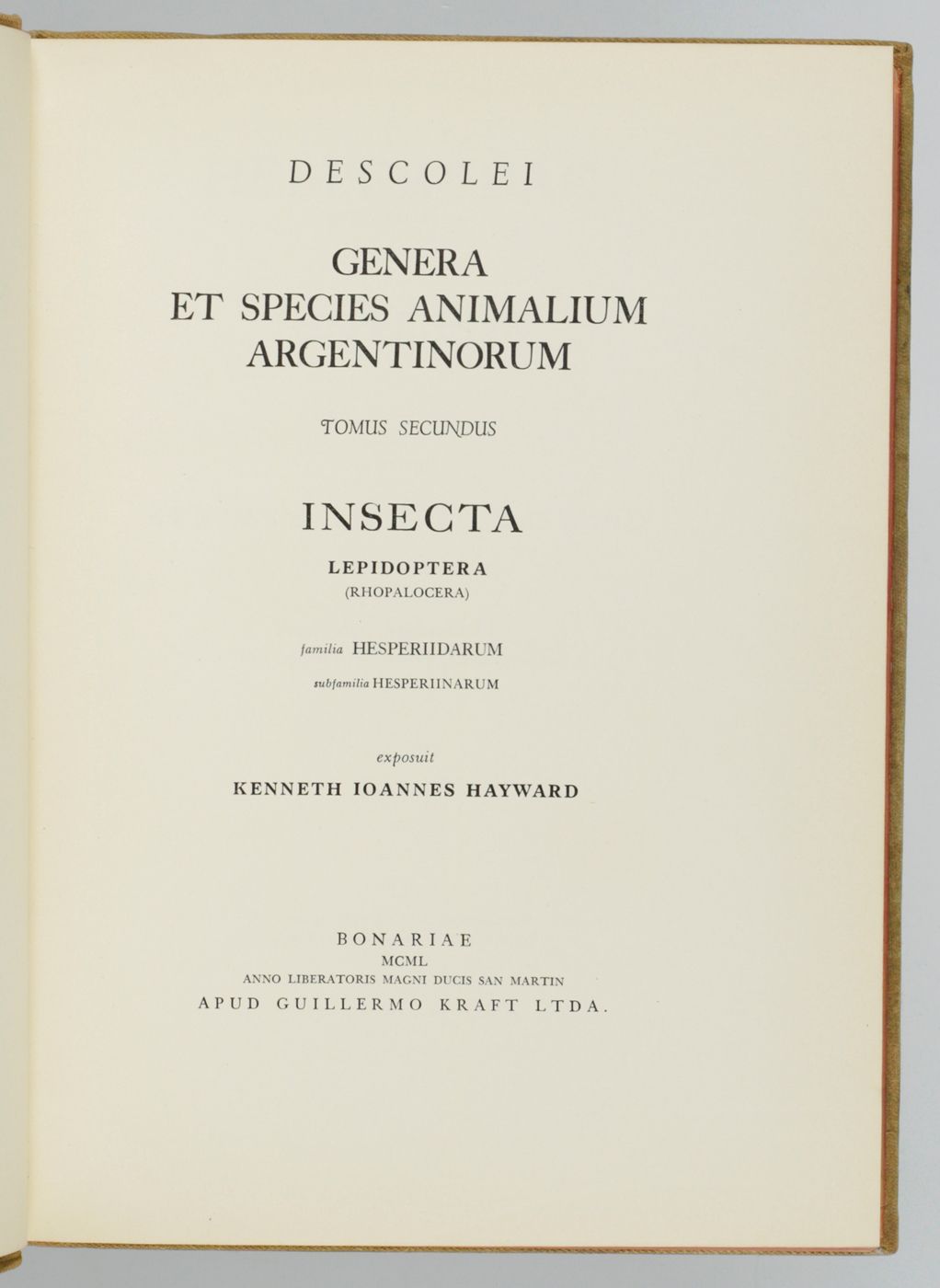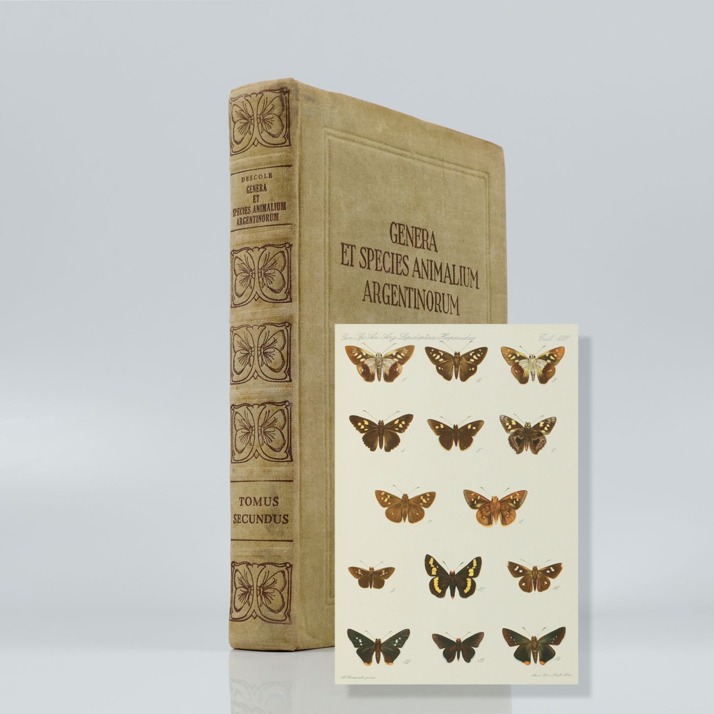 The most important and by far the most beautiful illustrated work on the Rhopalocera of South America, published in a 19th century style. This copy is ample proof of how regrettable it is that such works are no longer issued. This Part II, like Part I deals with Hesperiidae, but Part II is on the subfamily, Hesperiinae. The original descriptions of the species treated are repeated in full (in their original languages, i.e., not translated). Only 1,000 numbered (stamped and signed by the editor, Descole) copies were printed by Guillermo Krafft, after drawings of various artists. This is copy number 206. Today all parts are very difficult to obtain. A third and fourth part were published much later, in 1964 and 1967 and are not included as well. A fine clean copy.