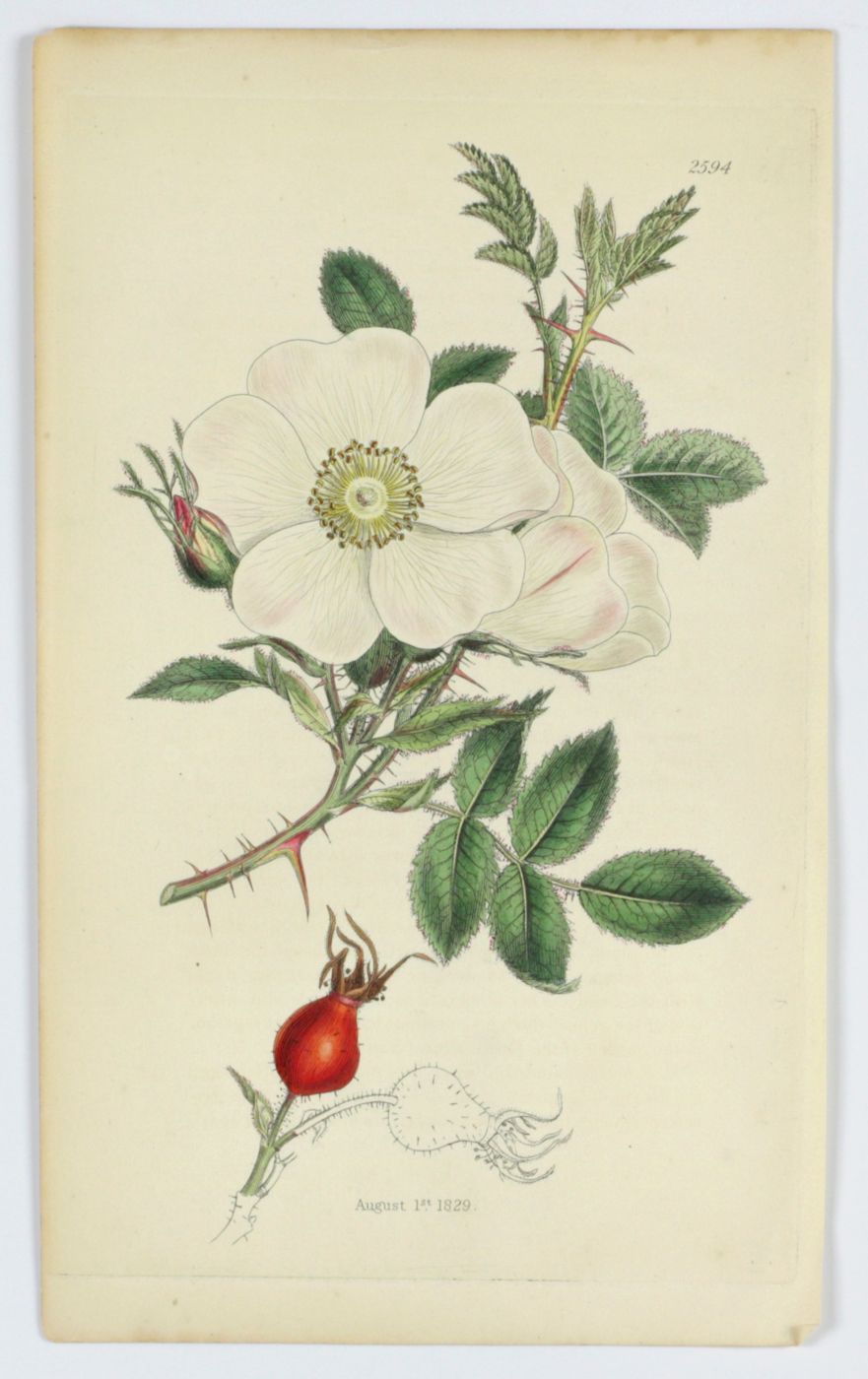 This is a collection of four copper engravings of fine wild, European roses. The plates were published in the long-running series "English botany; or coloured figures of British plants", started in the 18th century and gradually expanded. The present plates are dated 1829 and 1837, and numbered 2594, 2595, 2601 [709**], and 2707 [705*]. One plate with a pale pinkish smudge on the lower half; some marginal creasing and soiling, but otherwise a very nice set. Nissen BBI, 2225.