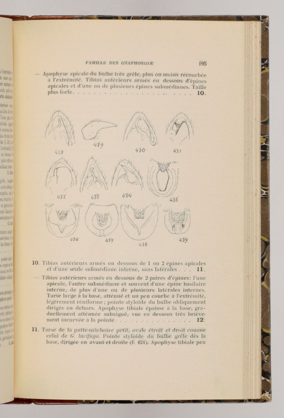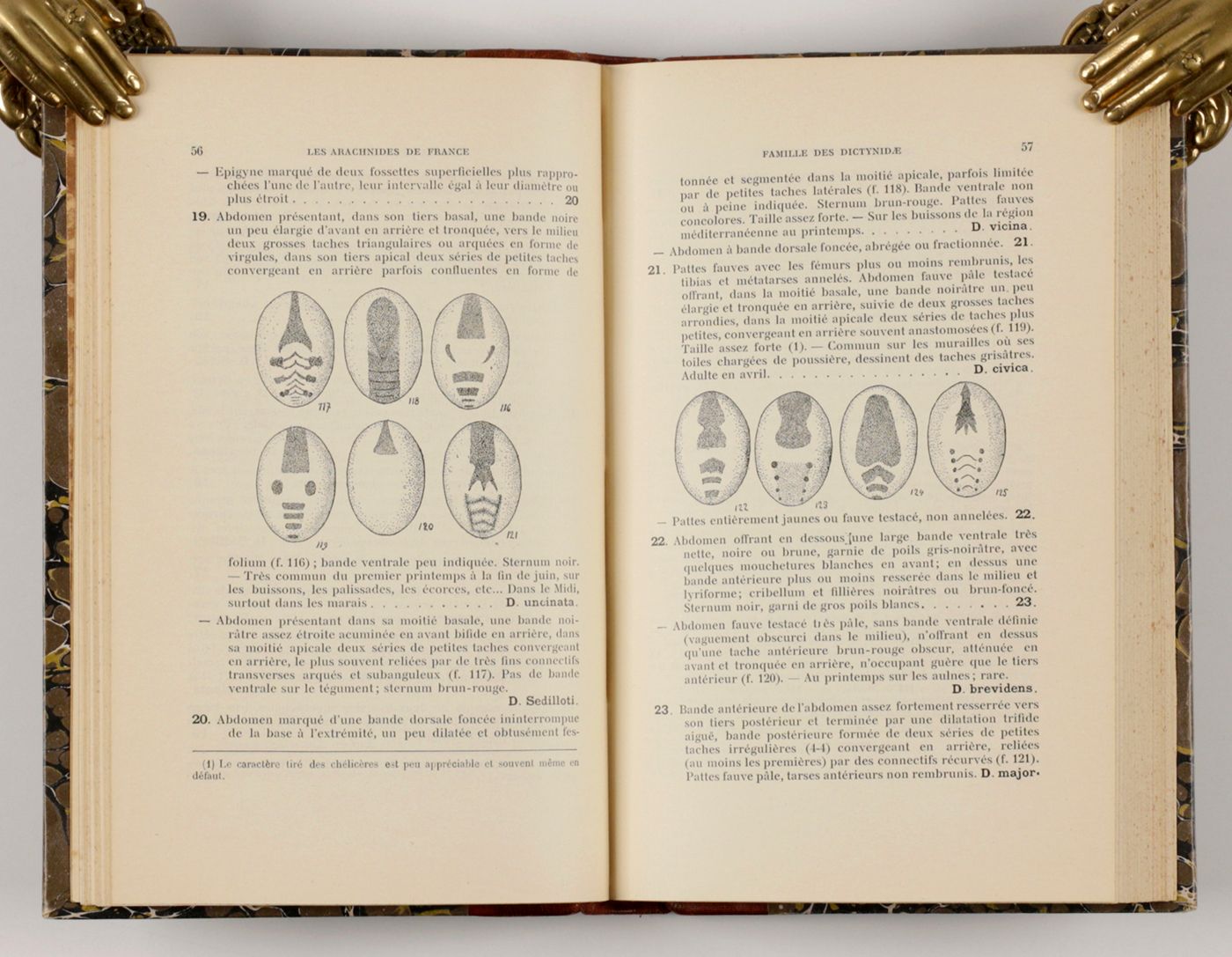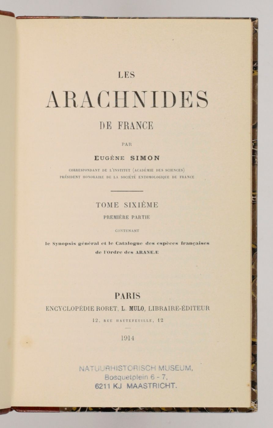 A very rare publication, especially when complete and well-bound, such as this set. Published over a very long time. Volume 6 was not published until after Volume 7, which dealt with minor arthropod groups. Volume 6 was to be devoted to families that had not yet been treated in Volumes 1 - 5, and to a general supplement. The author, the French arachnologist Eugène Louis Simon (1848-1924), had near completed a huge manuscript including all groups not covered, as well as many updates on those published earlier. As pointed out by the editors in their postscript, due to the delay in publication, "Simon, constantly improving his work, realized the need to rework it all, [re-] classified according to the main lines that he had established in the meantime. And it was then that, anxious not to leave a gap in his first work, he conceived the idea of devoting Volume VI, not yet published, to the publication of this manuscript. This conception is in some respects regrettable, because it leads to confusion: this is why we wish to specify that Volume VI constitutes, in reality, a separate work, which is in itself a complete study of the spiders of the French fauna", whereas, initially, Simon merely envisioned a descriptive part of a few families not yet covered, and an index. Simon managed to publish the first part (ten years before his death). With the second part, published 12 years later, the French entomologists and arachnologists Lucien Berland (1888-1962) and Jean Baptiste Louis Fage (1883-1964) took over, editing and publishing the other four volumes. We found no auction records of complete copies, nor are there any on the internet. Stamp in the top margin of the half-titles, otherwise clean, unmarked, as new. Bonnet, pp. 584-585. Not in Nissen ZBI.