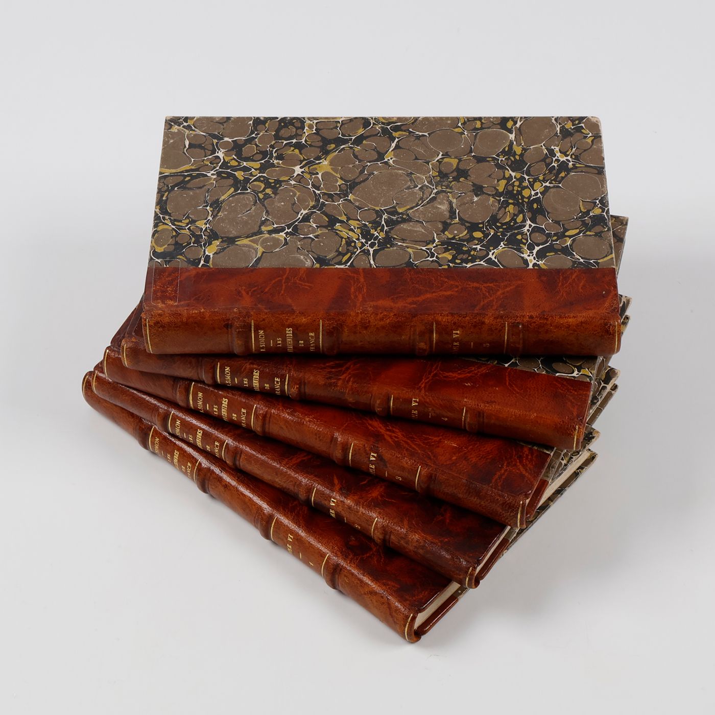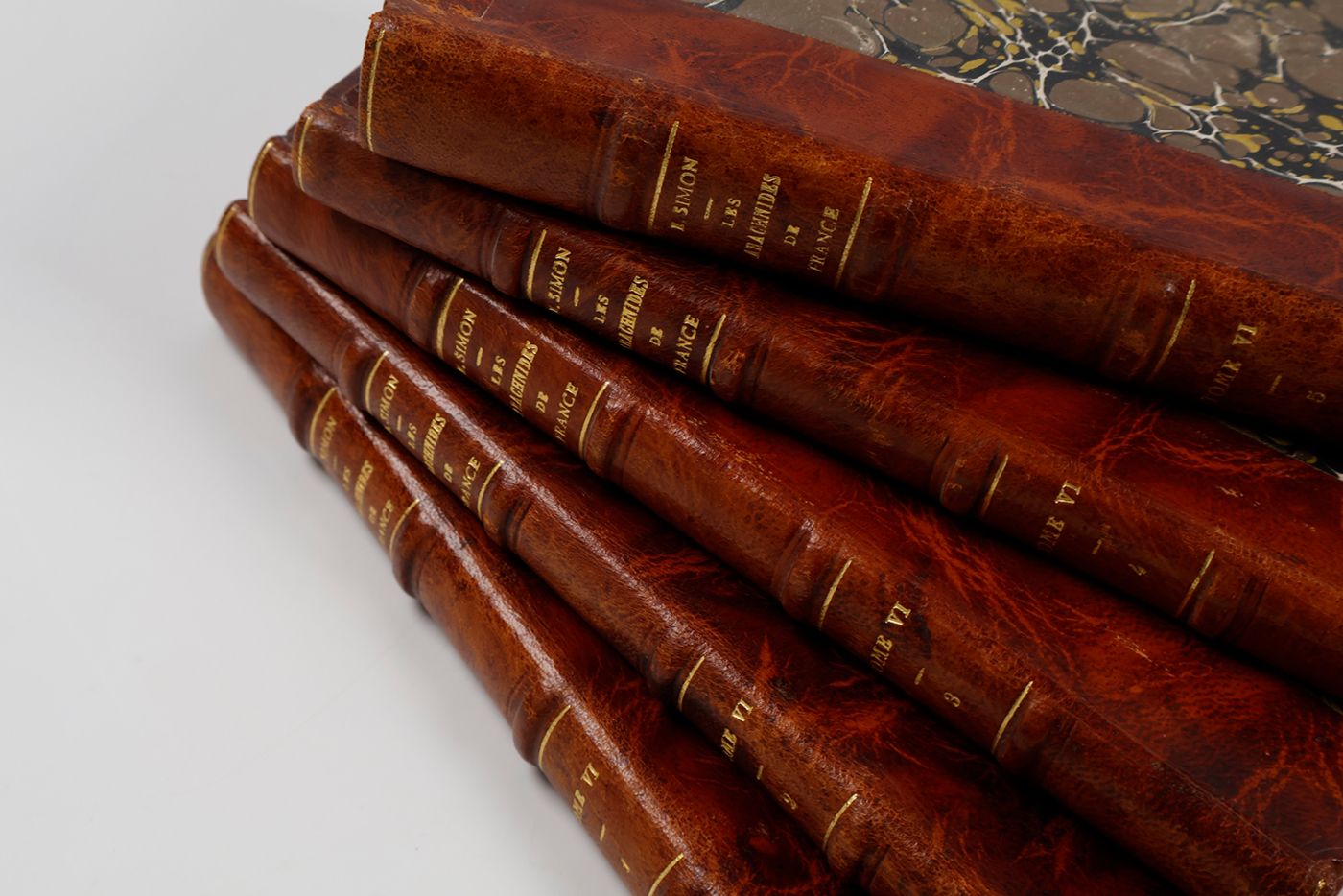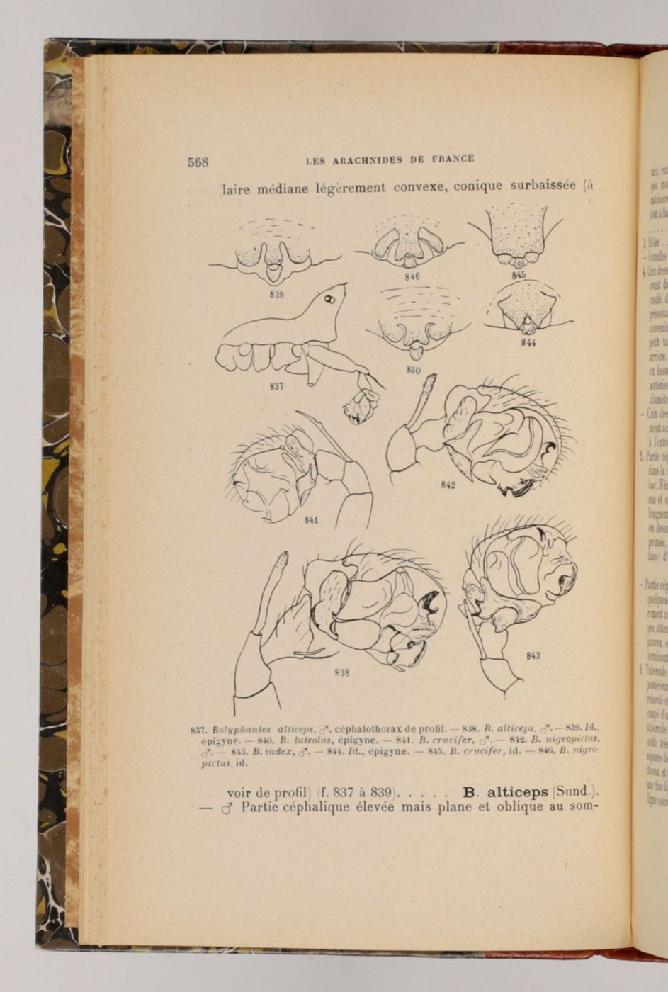 A very rare publication, especially when complete and well-bound, such as this set. Published over a very long time. Volume 6 was not published until after Volume 7, which dealt with minor arthropod groups. Volume 6 was to be devoted to families that had not yet been treated in Volumes 1 - 5, and to a general supplement. The author, the French arachnologist Eugène Louis Simon (1848-1924), had near completed a huge manuscript including all groups not covered, as well as many updates on those published earlier. As pointed out by the editors in their postscript, due to the delay in publication, "Simon, constantly improving his work, realized the need to rework it all, [re-] classified according to the main lines that he had established in the meantime. And it was then that, anxious not to leave a gap in his first work, he conceived the idea of devoting Volume VI, not yet published, to the publication of this manuscript. This conception is in some respects regrettable, because it leads to confusion: this is why we wish to specify that Volume VI constitutes, in reality, a separate work, which is in itself a complete study of the spiders of the French fauna", whereas, initially, Simon merely envisioned a descriptive part of a few families not yet covered, and an index. Simon managed to publish the first part (ten years before his death). With the second part, published 12 years later, the French entomologists and arachnologists Lucien Berland (1888-1962) and Jean Baptiste Louis Fage (1883-1964) took over, editing and publishing the other four volumes. We found no auction records of complete copies, nor are there any on the internet. Stamp in the top margin of the half-titles, otherwise clean, unmarked, as new. Bonnet, pp. 584-585. Not in Nissen ZBI.