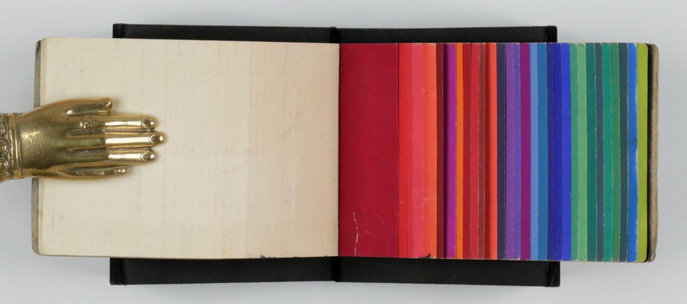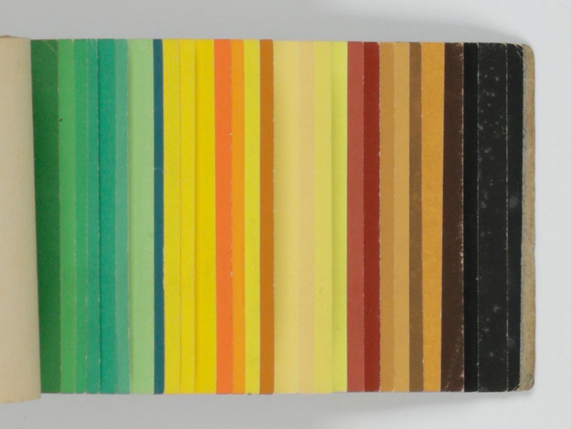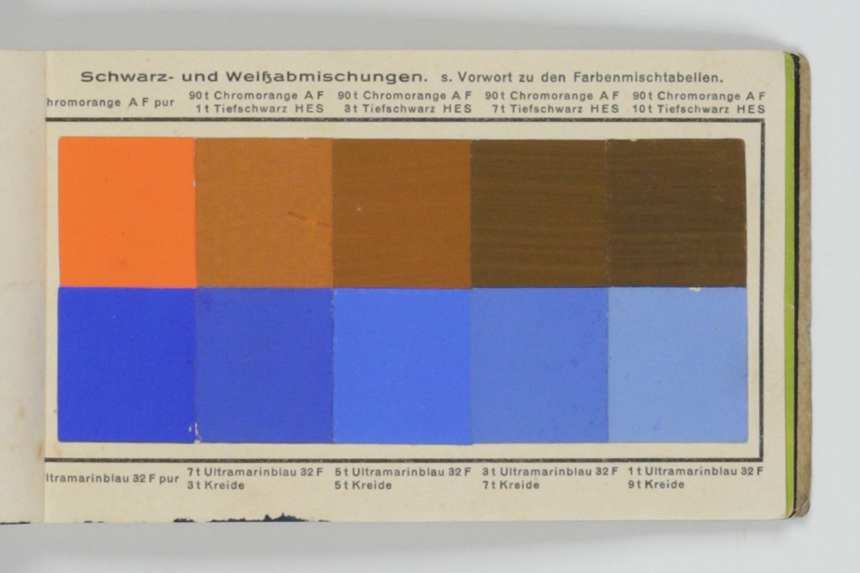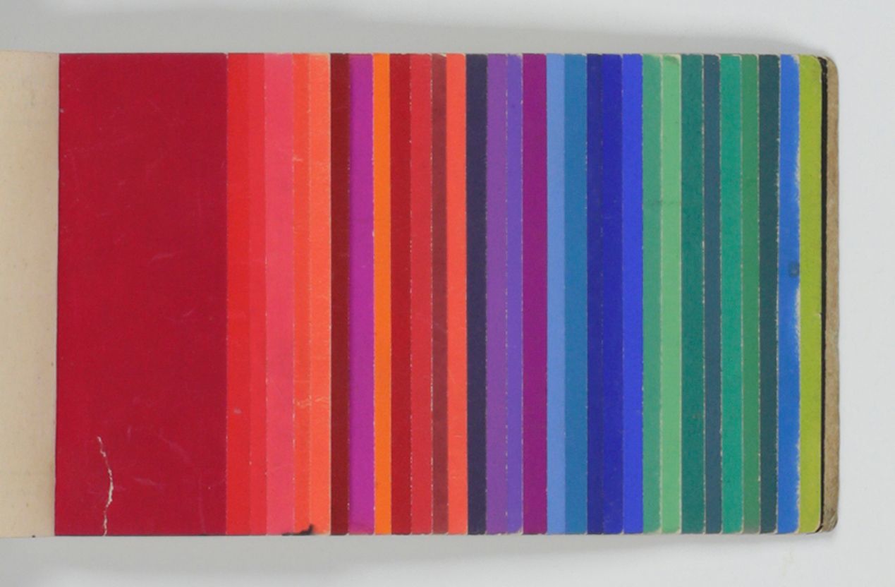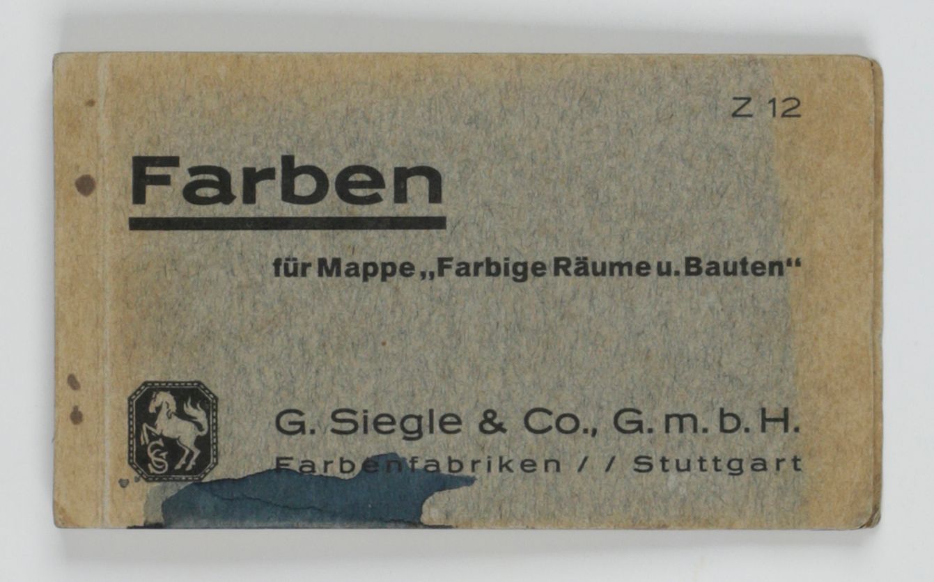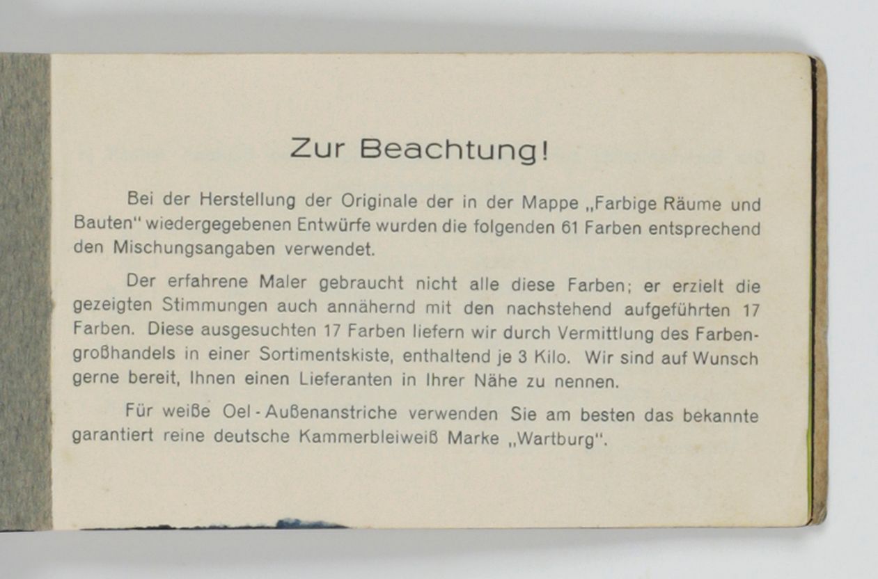 Stuttgart, G. Siegle, ca. 1929. Oblong folio (25.0 x 35.0 cm). 30 plates, numbered 1-30, each with one to three interior designs printed in colour, including silver and gilt. [AND] Very small oblong folio (8.1 x 14.0 cm). Title leaf, explanatory leaf; leaf with Schwarz- und Weißabmischungen (colour mixes), and 61 sheets of various lengths, each in a in different colour forming a complete spectrum.