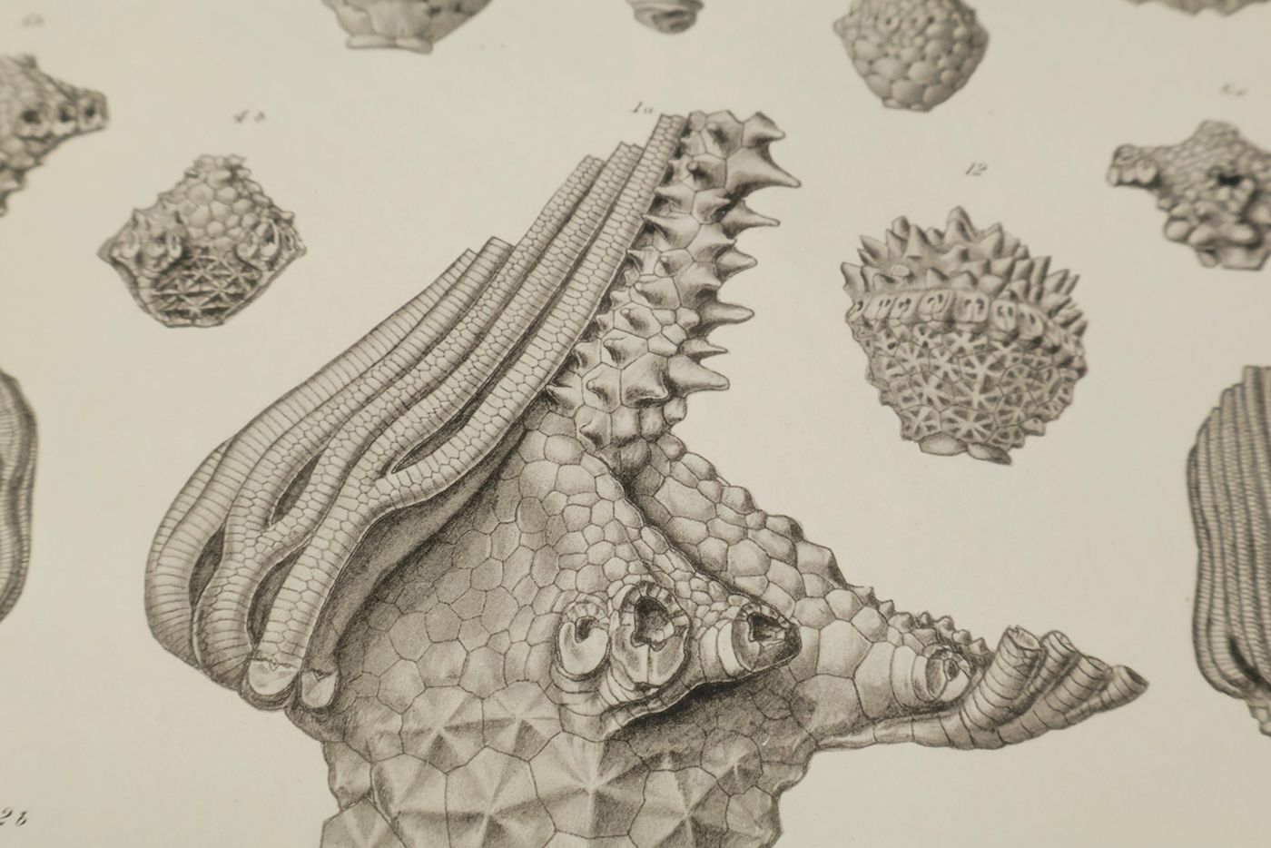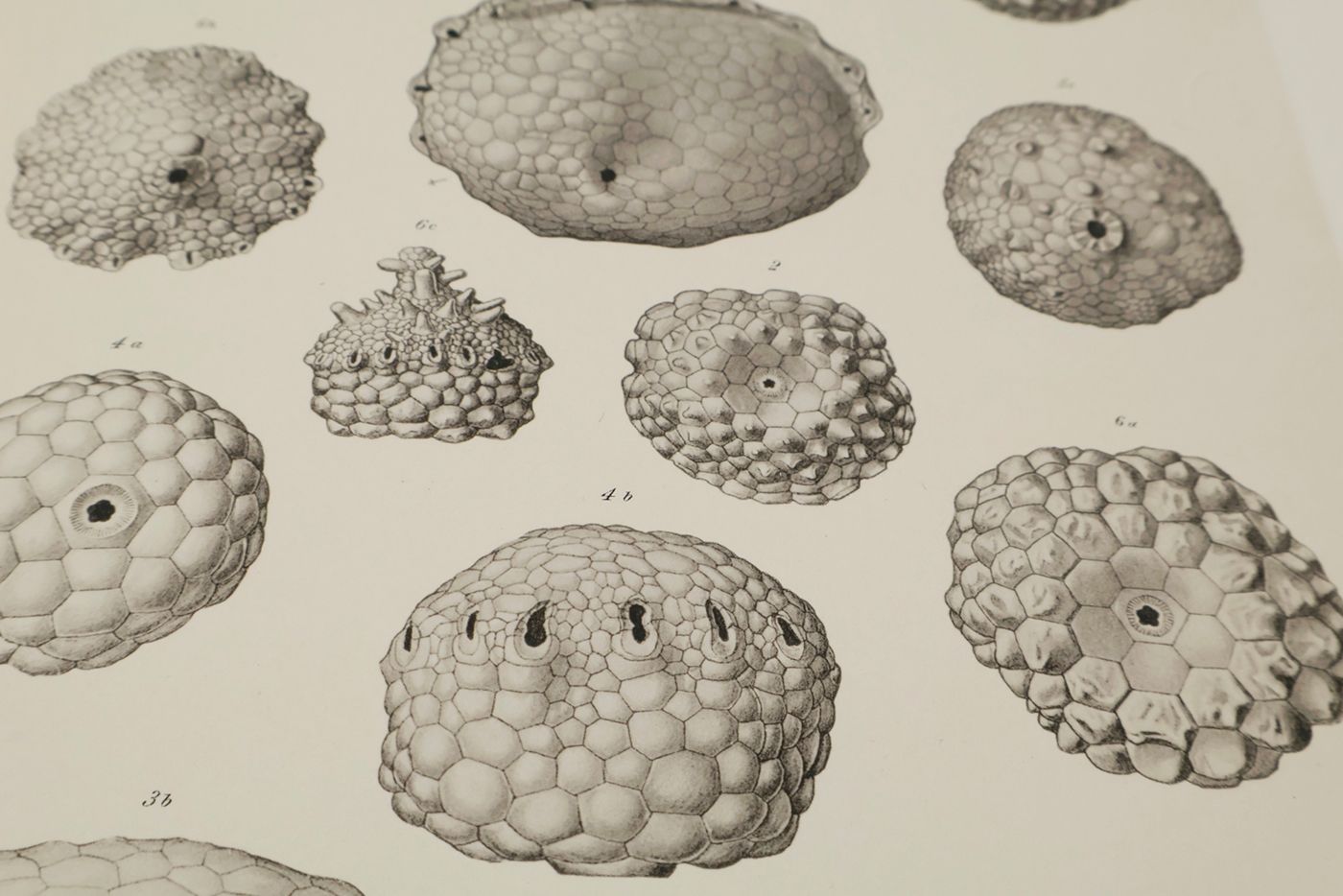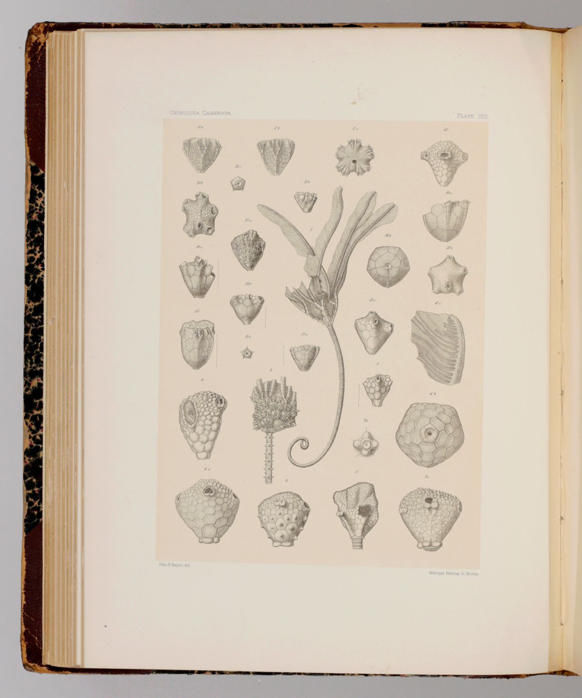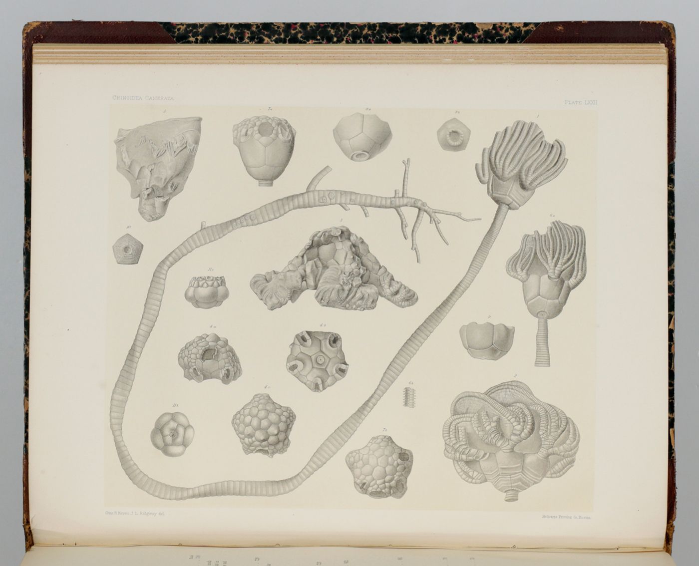 Very important and rare basic monograph on North American Crinoidea, very well illustrated after drawings by C. R. Keyes, lithographed by A. M. Westergren. It includes numerous new taxa. The work took three years to be printed and published. Meanwhile, first author, German-American palaeontologist Charles Wachsmuth (1829-1896) died after a long illness, and several species were formally named elsewhere, by other authors. Pictorial bookplate of the Samuel Hubbard Scudder Library of the Boston Society of Natural History on the front pastedowns; small blind-stamps of the society on front wrappers and titles, and their name in gilt on the lower spines. Some rubbing to the boards and spine feet. Blind-stamps to front wrappers and title pages; small, oval blind-stamps to a few plates. Otherwise a very good, clean, complete set. We found only one auction record, dating from 1964! Cat. BM(NH) 5, p. 2244. Not in Nissen ZBI.