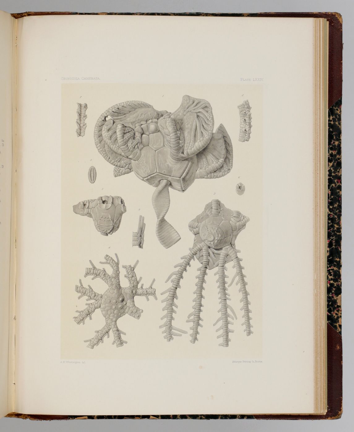 Cambridge, MA, Museum of Comparative Zoölogy, 1897. In three volumes. Large 4to (two text volumes) and folio atlas (34.7 x 27.0 cm). ii, 359, [359-837 pp. 83 very fine tinted lithographed plates with explanatory text leaves. Uniform contemporary half morocco over marbled boards. Spines with four raised bands and gilt title. Original printed wrappers bound in.