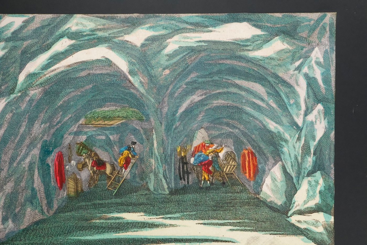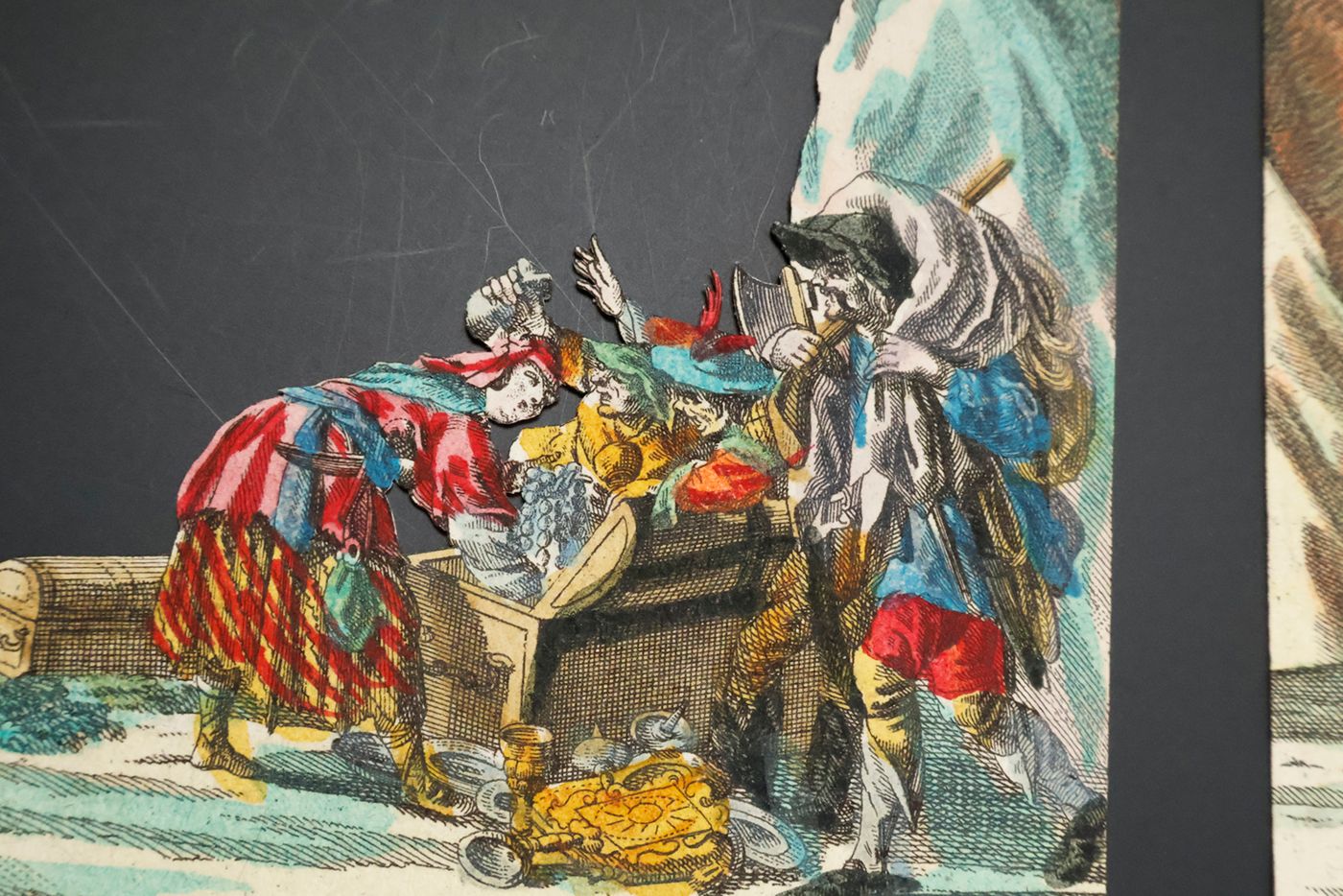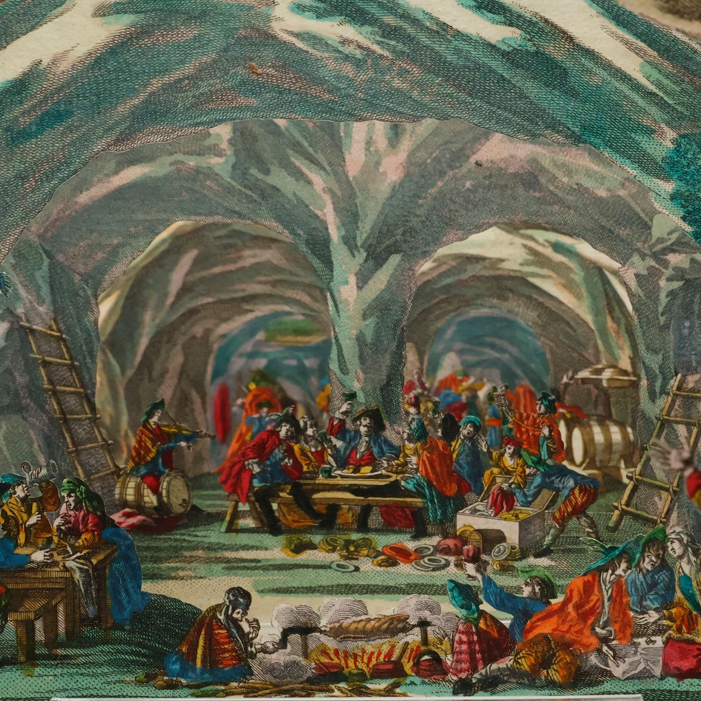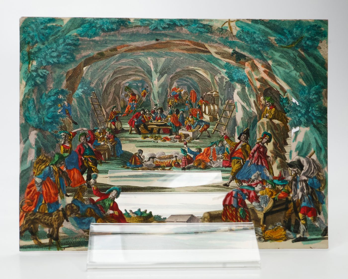 A rare view into a den of thieves, having a jolly good time. Given the age and subject, we assume that this item was produced by the Augsburg firm of M. Engelbrecht. "Martin Engelbrecht (1684-1756), a native of Augsburg was the son of a colour merchant. He began his career as an artist by the attachment to a local publishing house but had by 1708 moved to Berlin where he was engaged in the designs after Eosander von Goethe of the Silberbüfett im Ritterall at Berlin and of a porcelain cabinet in Charlottenberg. Returning to Augsburg he was involved in illustrating a wide variety of works after various artist mainly on subjects connected with the decorative arts. However in 1711 Engelbrecht was again in Berlin working at a fine art publishers with his older brother Christian Engelbrecht (1672-1735). They decided to start their own independent publishing house at Augsburg in 1719 where they produce a wide variety of graphic works. It was with peepshows Martin Engelbrecht excelled having the unique position of no other publishing house or place of publication to compete against him. Engelbrecht was kept busy with the many other special graphics and employed two artists, Jeremias Wachsmuth (1711-1771) and Johann David Nessenthaler (1717-1766), to produce designs for the peepshows. Wachsmuth’s work can be found as early as 1731, and those by Nessenthaler starting from 1737. With Martin Engelbrecht's death in 1756 the business continued to thrive under the management of Engelbrecht's daughters and sons-in-law, and continued on well into the nineteenth century." (Marlborough Rare Books Catalogue, List XLV, 2009. pp. 33-34). First cardboard (which is the least detailed, and, e.g., without human figures) lacking. Interestingly, the six remaining cards are numbered 1-6 on the versos, in quite an old, perhaps contemporary hand. In very good condition.