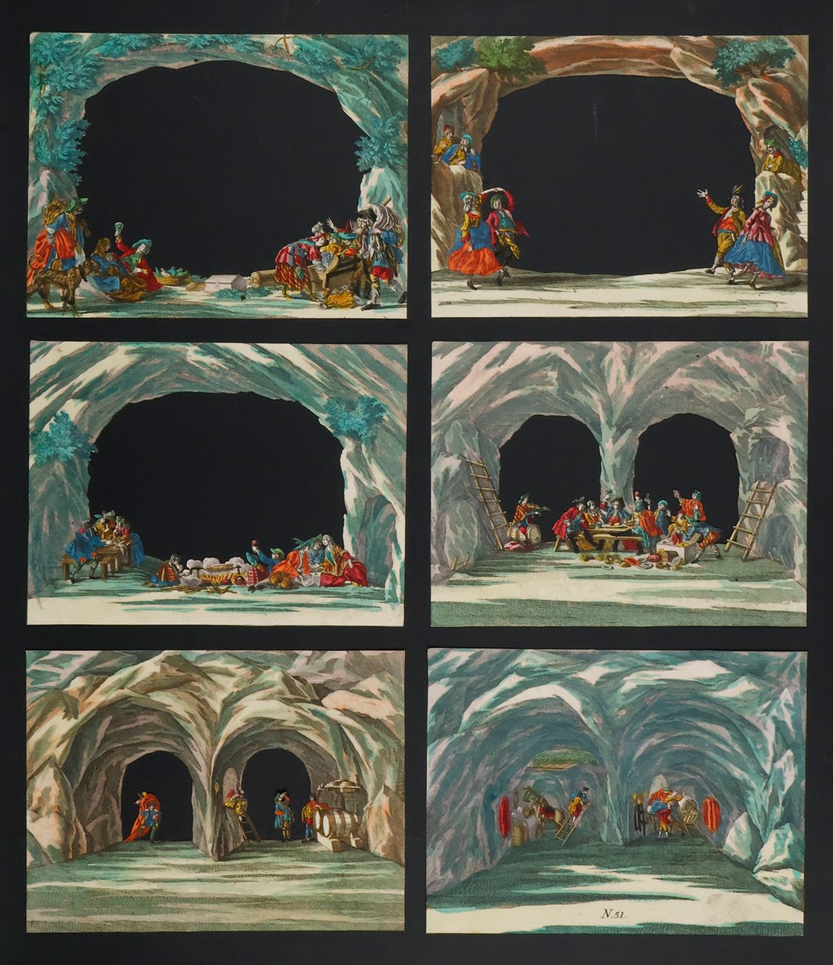 [Augsburg, M. Engelbrecht, [ca. 1750]. Six (of seven) large, oblong cardboard sheets (ca. 16.0 x 20.0 cm), with fine hand-colouring, being five cards with delicate cut-outs and one backpanel, together forming a single scene. Rear panel numbered, in print, N. 51 in the lower margin.