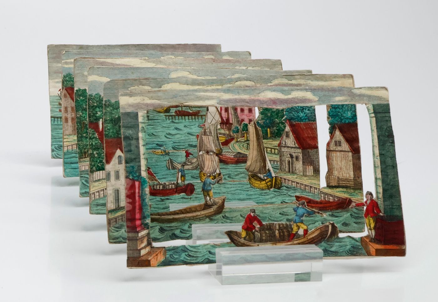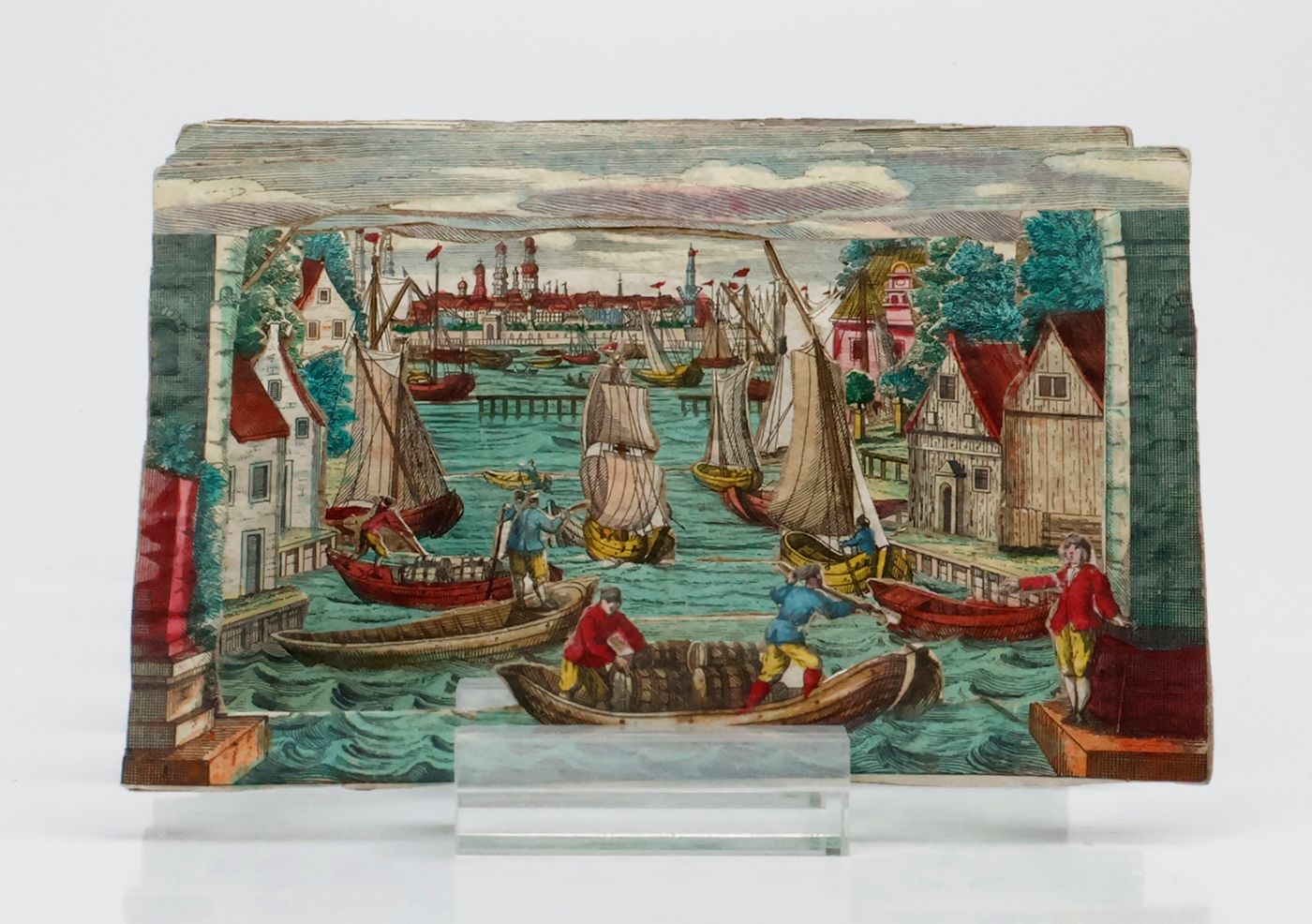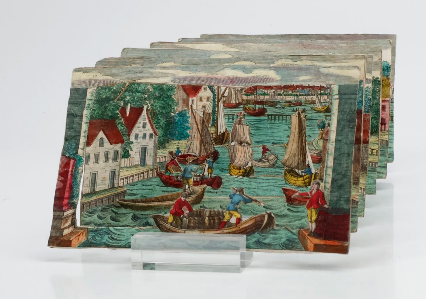 A wonderfully preserved, complete set of cards, with delicate cut-outs and hand-colouring. This peepshow consists of six cards which together form a view through a busy shipping river or canal, towards a fortified port, possibly Hamburg. Produced by the Augsburg firm of M. Engelbrecht. "Martin Engelbrecht (1684-1756), a native of Augsburg was the son of a colour merchant. He began his career as an artist by the attachment to a local publishing house but had by 1708 moved to Berlin where he was engaged in the designs after Eosander von Goethe of a the Silberbüfett im Ritterall at Berlin and of a porcelain cabinet in Charlottenberg. Returning to Augsburg he was involved in illustrating a wide variety of works after various artist mainly on subjects connected with the decorative arts. However in 1711 Engelbrecht was again in Berlin working at a fine art publishers with his older brother Christian Engelbrecht (1672-1735). They decided to start their own independent publishing house at Augsburg in 1719 where they produce a wide variety of graphic works. It was with peepshows Martin Engelbrecht excelled having the unique position of no other publishing house or place of publication to compete against him. Engelbrecht was kept busy with the many other special graphics and employed two artists, Jeremias Wachsmuth (1711-1771) and Johann David Nessenthaler (1717-1766), to produce designs for the peepshows. Wachsmuth’s work can be found as early as 1731, and those by Nessenthaler starting from 1737. With Martin Engelbrecht's death in 1756 the business continued to thrive under the management of Engelbrecht's daughters and sons-in-law, and continued on well into the nineteenth century." (Marlborough Rare Books Catalog, List XLV, 2009. pp. 33-34). The quality is certainly of the highest level. Numbered on versos in an old hand. Very slight rubbing to the edges, otherwise very good, clean. Rare.
