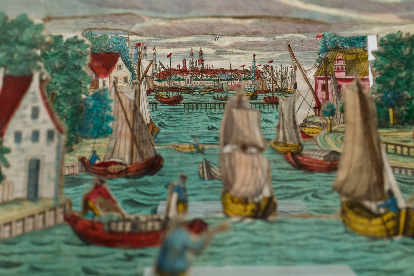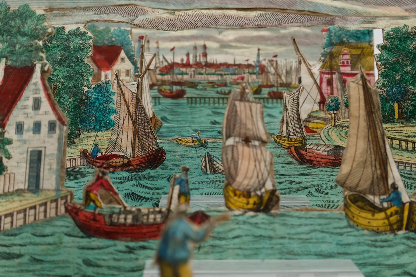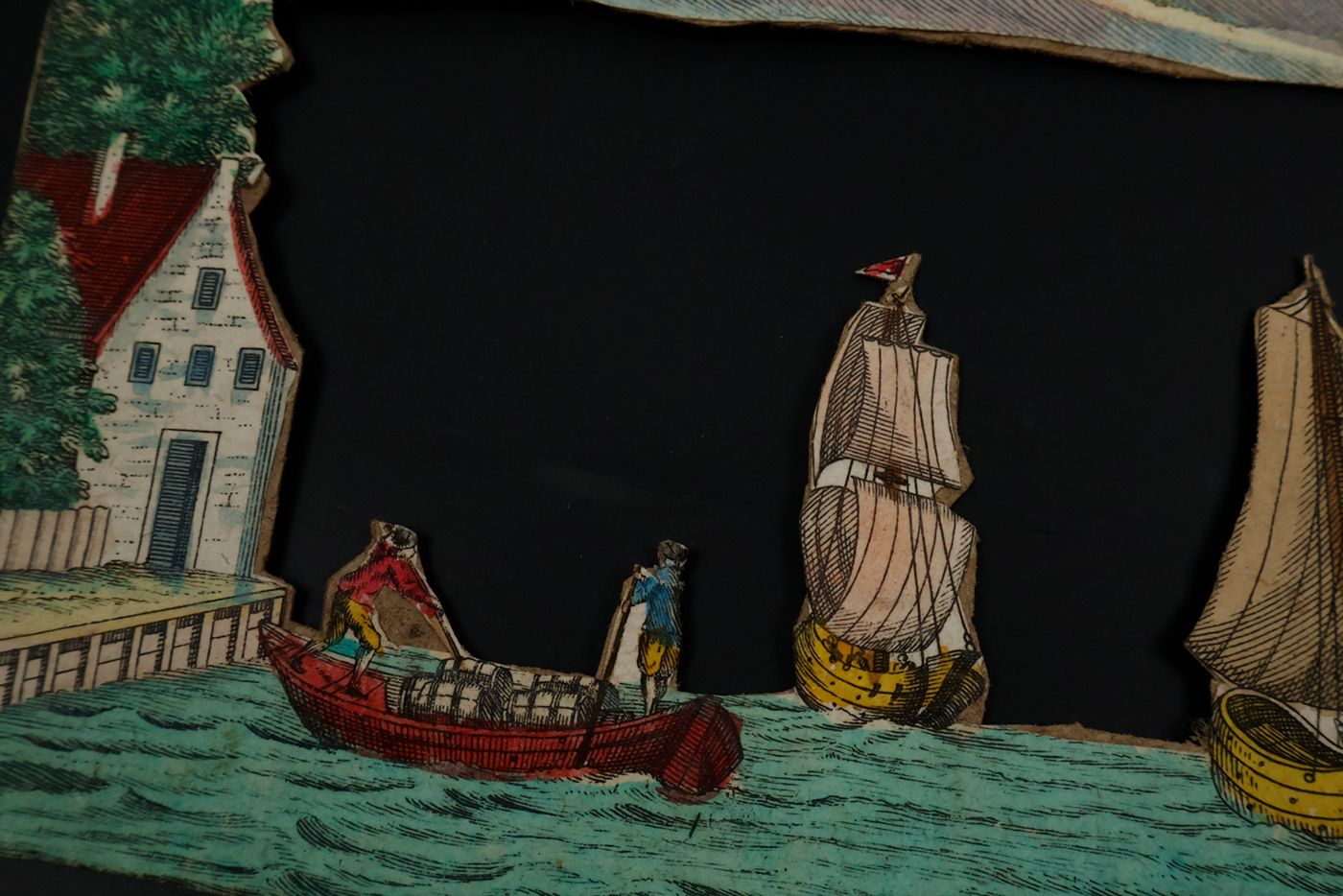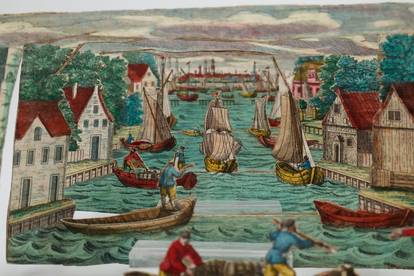 A wonderfully preserved, complete set of cards, with delicate cut-outs and hand-colouring. This peepshow consists of six cards which together form a view through a busy shipping river or canal, towards a fortified port, possibly Hamburg. Produced by the Augsburg firm of M. Engelbrecht. "Martin Engelbrecht (1684-1756), a native of Augsburg was the son of a colour merchant. He began his career as an artist by the attachment to a local publishing house but had by 1708 moved to Berlin where he was engaged in the designs after Eosander von Goethe of a the Silberbüfett im Ritterall at Berlin and of a porcelain cabinet in Charlottenberg. Returning to Augsburg he was involved in illustrating a wide variety of works after various artist mainly on subjects connected with the decorative arts. However in 1711 Engelbrecht was again in Berlin working at a fine art publishers with his older brother Christian Engelbrecht (1672-1735). They decided to start their own independent publishing house at Augsburg in 1719 where they produce a wide variety of graphic works. It was with peepshows Martin Engelbrecht excelled having the unique position of no other publishing house or place of publication to compete against him. Engelbrecht was kept busy with the many other special graphics and employed two artists, Jeremias Wachsmuth (1711-1771) and Johann David Nessenthaler (1717-1766), to produce designs for the peepshows. Wachsmuth’s work can be found as early as 1731, and those by Nessenthaler starting from 1737. With Martin Engelbrecht's death in 1756 the business continued to thrive under the management of Engelbrecht's daughters and sons-in-law, and continued on well into the nineteenth century." (Marlborough Rare Books Catalog, List XLV, 2009. pp. 33-34). The quality is certainly of the highest level. Numbered on versos in an old hand. Very slight rubbing to the edges, otherwise very good, clean. Rare.