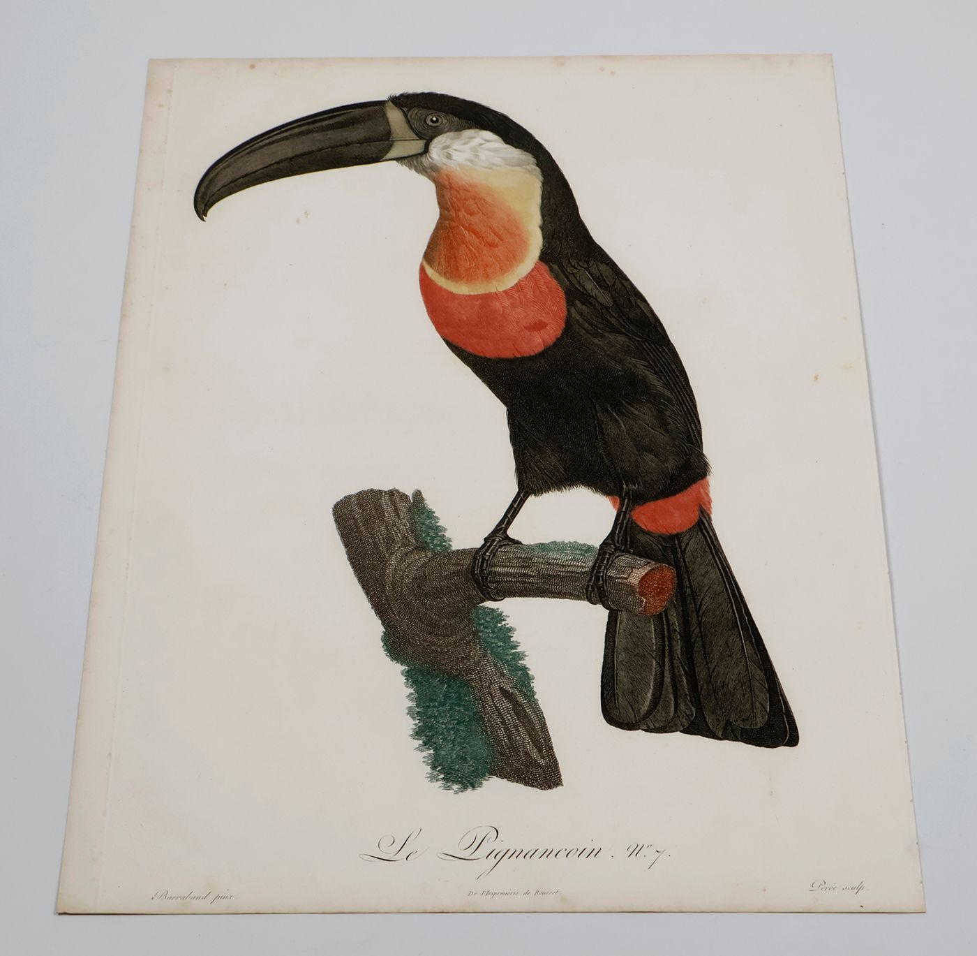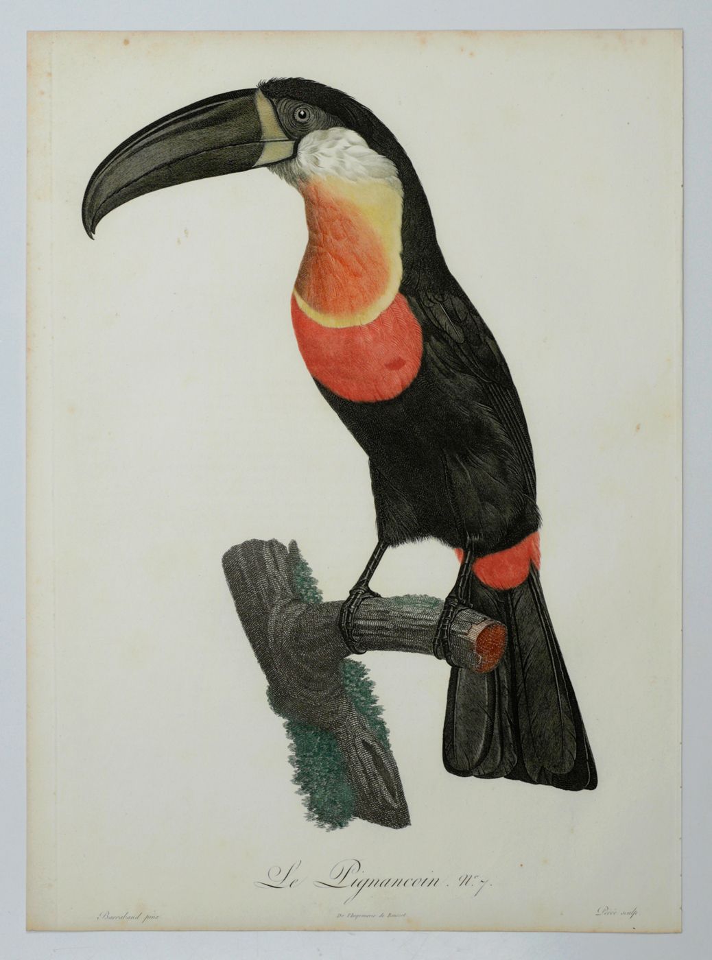 A fine, copper-engraved plate, in very good condition, of one of the world's most spectacular birds, the channel-billed Toucan. This original plate is the work of one of the period’s foremost bird illustrators, the French artist Jacques Barraband (1767-1809). Barraband's works are esteemed especially for their realism. Although his illustrations were based on mounted specimens, they were considered the most accurate made during the early 1800s. His birds are never stiff, nor are they artistic rather than accurate, as in, for example, the work of Audubon. The channel-billed Toucan from Neotropical rain-forests occurs from Trinidad south to Brazil and Colombia. Known by ornithologists as Ramphastos vitellinus, this specimen has a feather colour pattern resembling the Ariel Toucan, sometimes regarded as a separate species. Originally published in a work by the French explorer and ornithologist François Levaillant (1753-1824), Histoire Naturelle des Oiseaux de Paradis et des Rolliers, suivie de Celle des Toucans et des Barbus. Levaillant's book is known to be prone to foxing, but this plate forms a rare exception, with only some very minor spotting in the outer margins, otherwise, excellent, clean, the colours lively and bright. Anker, 304; Nissen IVB, 559; Ronsil, p. 298; Sitwell, p. 118; Zimmer, p. 393.