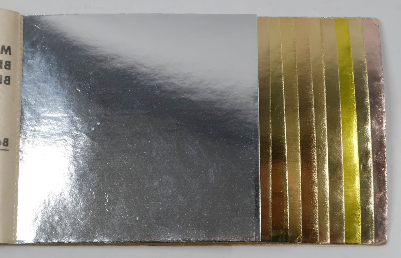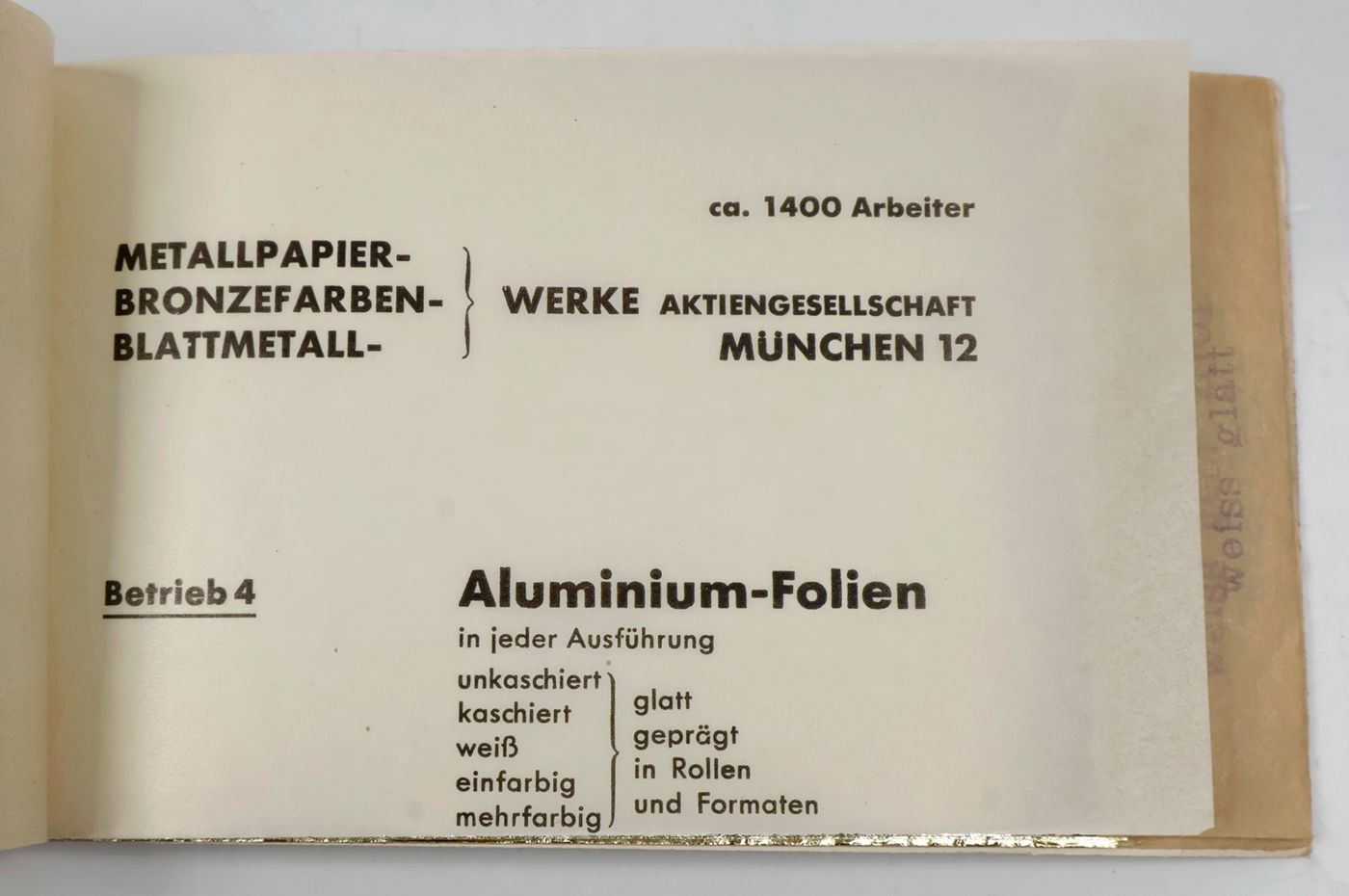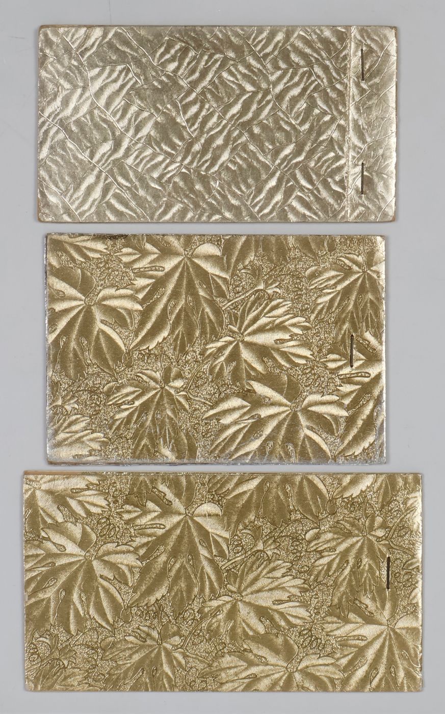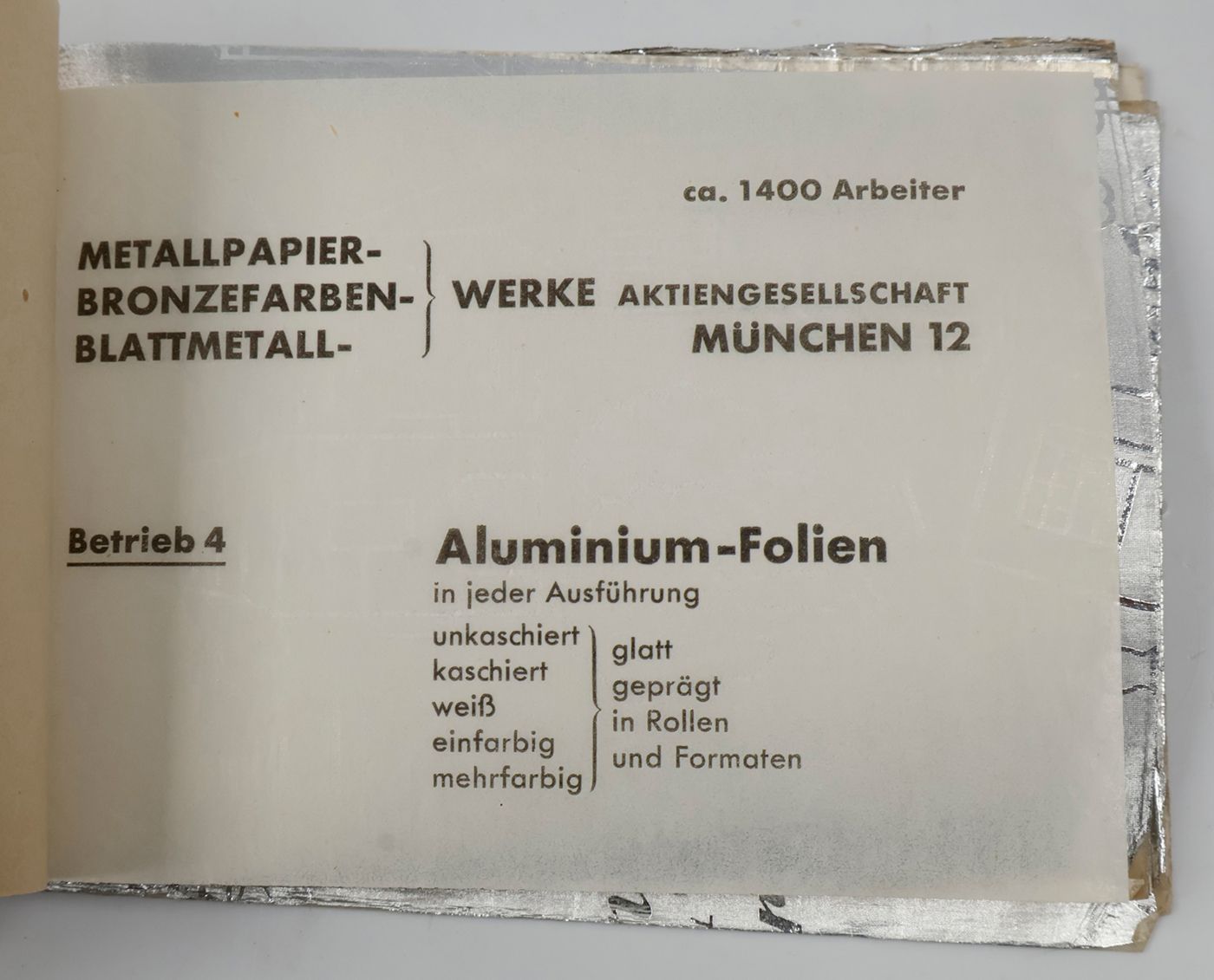 Munich, Metallpapier- Bronzefarben- Blattmetallwerke Aktiengesellschaft München, 1938. Three oblong booklets (8.0 x 14.6 cm; 9.1 x 16.4 cm, and 9.9 x 14.0 cm). Each with a title leaf and in total 39 aluminium foil leaves, each either in silver or gold, one with a different embossing, with brand names and logos (10), the others plain or geometrical patterns (29), and with tissue guards/interleaves with a catalogue numbers. All three stapled, with gilt, embossed covers, two with similar leaf-patterns, the other with a peculiar "fossil" pattern.