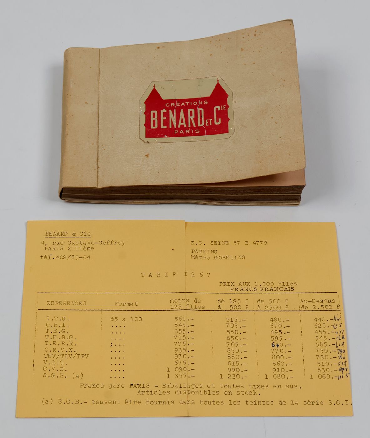 Paris, Bénard et Cie, [ca. 1968]. Oblong folio (11.3 x 16.3 cm). Title page, 102 paper samples. Stiff, patterned wrappers. Front wrapper with red and gilt label (with Bénard logo), mounted.