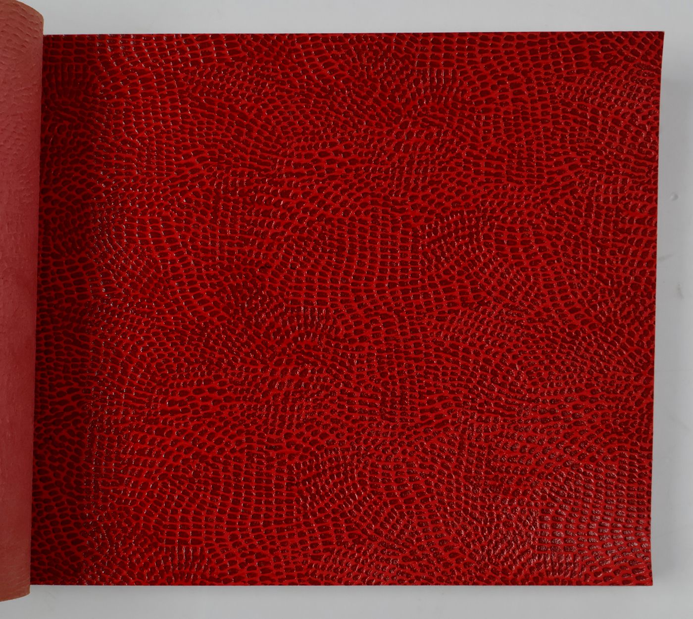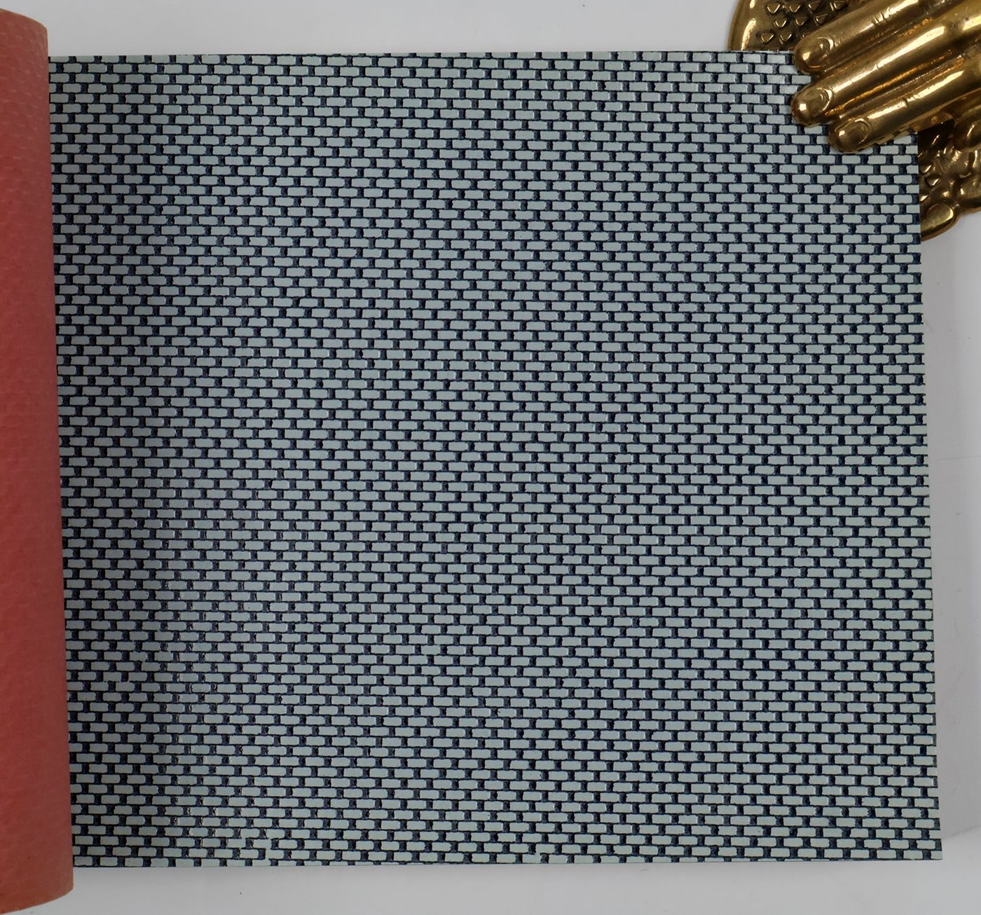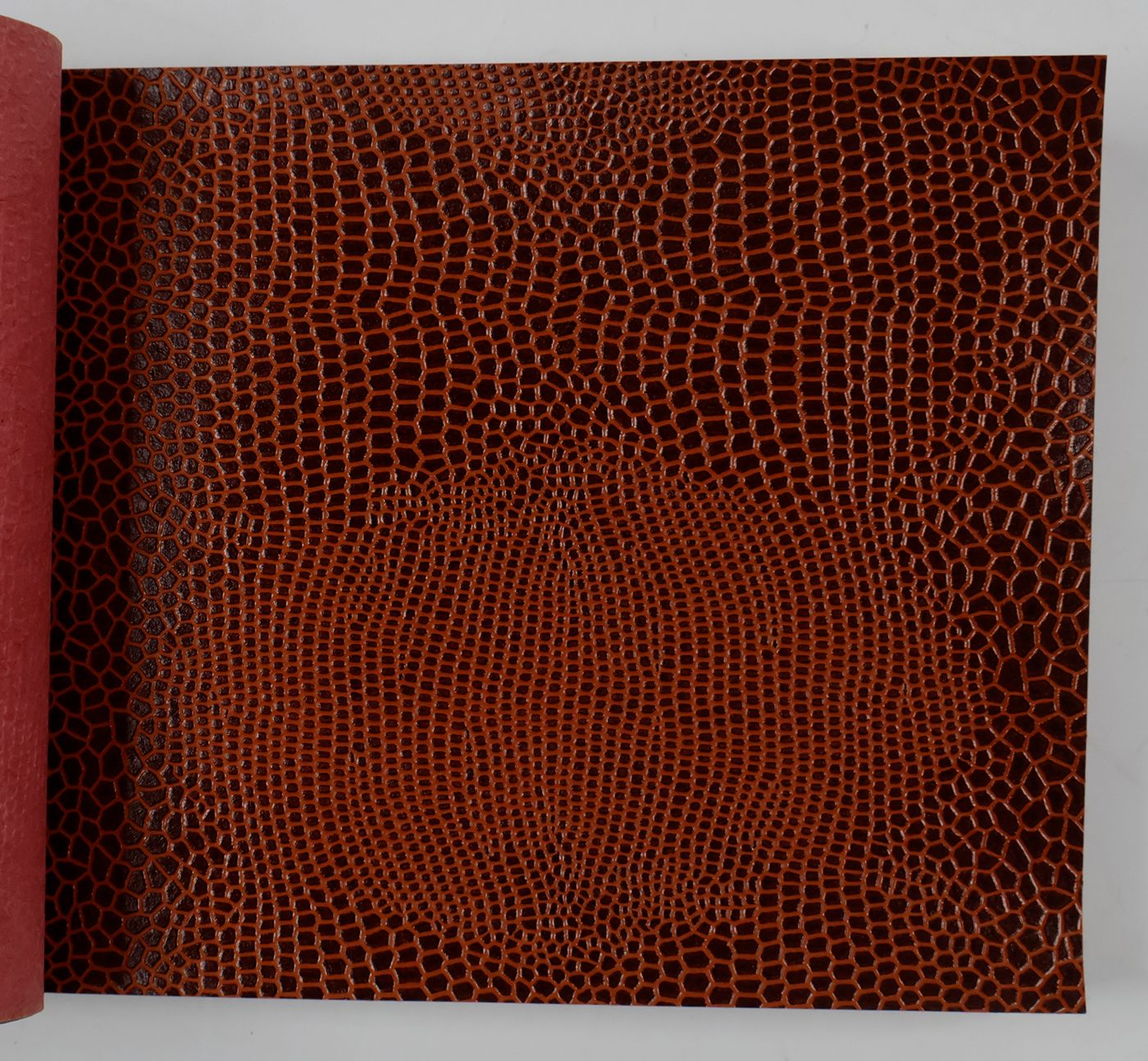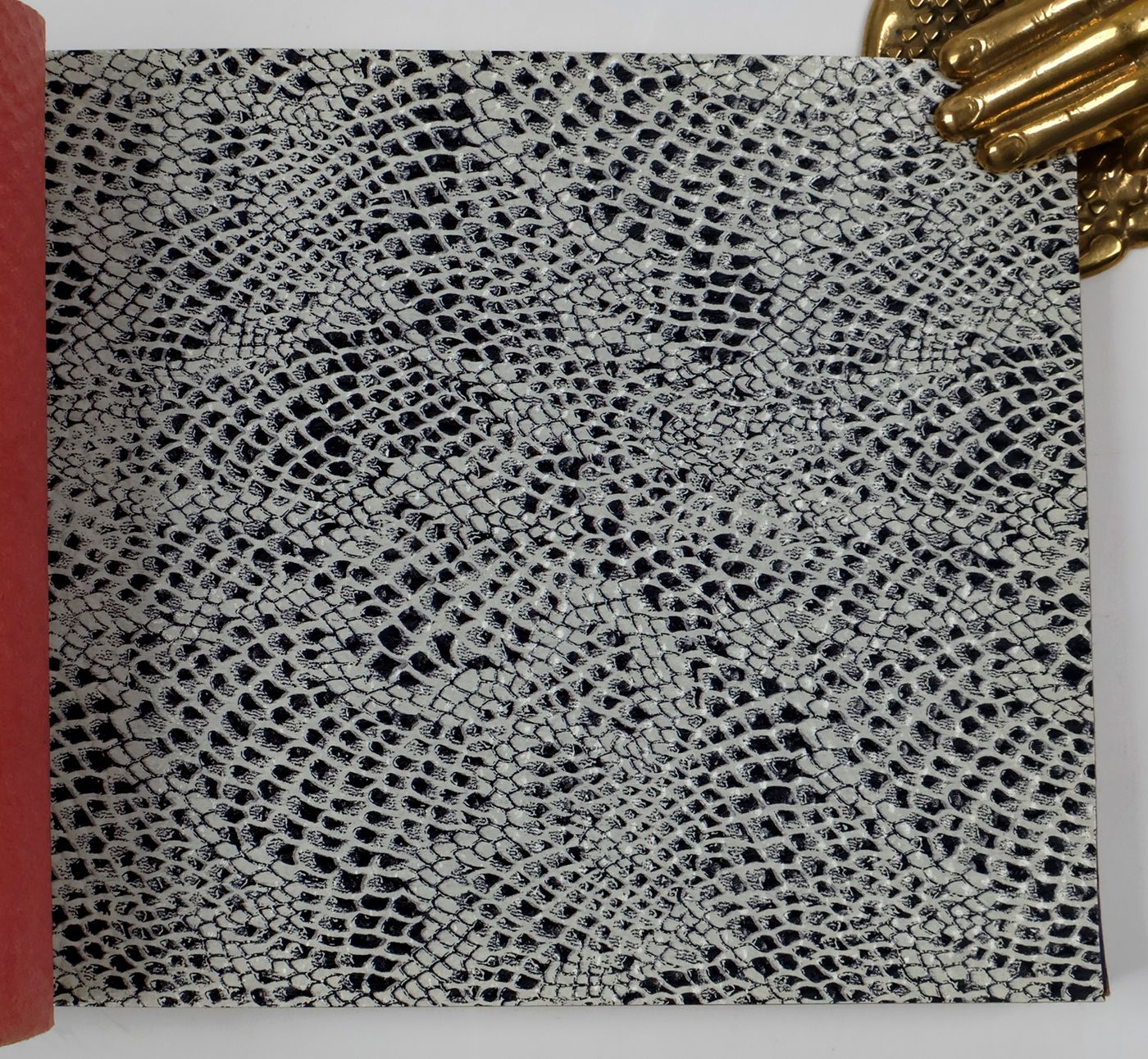 An unusual catalogue, of "Exclusive Designs", containing glossy paper samples (designs for wallpaper, book covers, etc.) chiefly showing reptile-skin patterns, brick-wall and pebbled patterns, and several other embossed patterns, in a variety of colours. The firm, Bénard, produced Gaufres, Indiennes, Micaces, Brocarts, Ors, en Rames ou en Bobines. Suédine, Velours, Cellodermes" [waffle fabrics, Indian prints, mica fabrics, brocades, gold fabrics, in rolls or spools. Suede, velvet, celloderm], this catalogue showing celloderm paper. Individual samples are printed in colour, monochrome, or gold. It is interesting to see the effect of different colours on the same graphic design. The samples are individually numbered (stamps on versos; numbers in a rather random order). Included: a cyclostat price list on yellow paper, recording size, minimal number of copies, etc., with some additions by hand. A very good, unmarked copy.