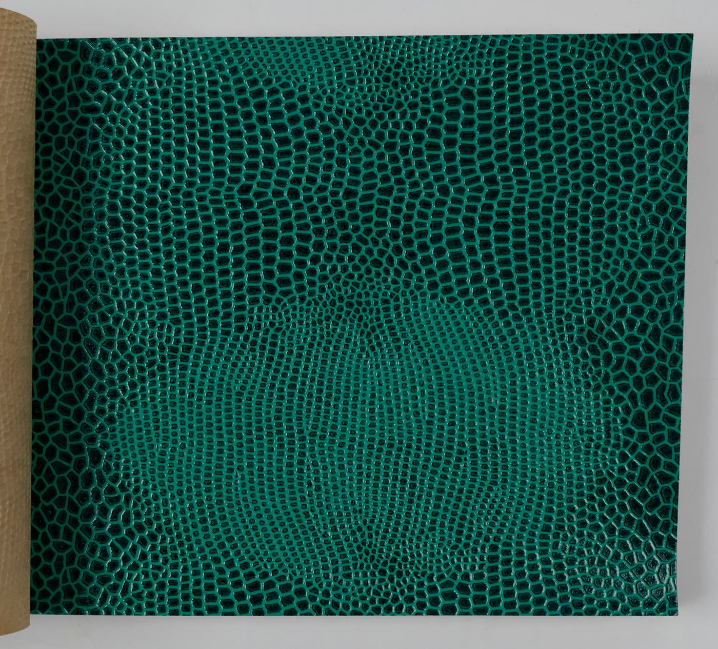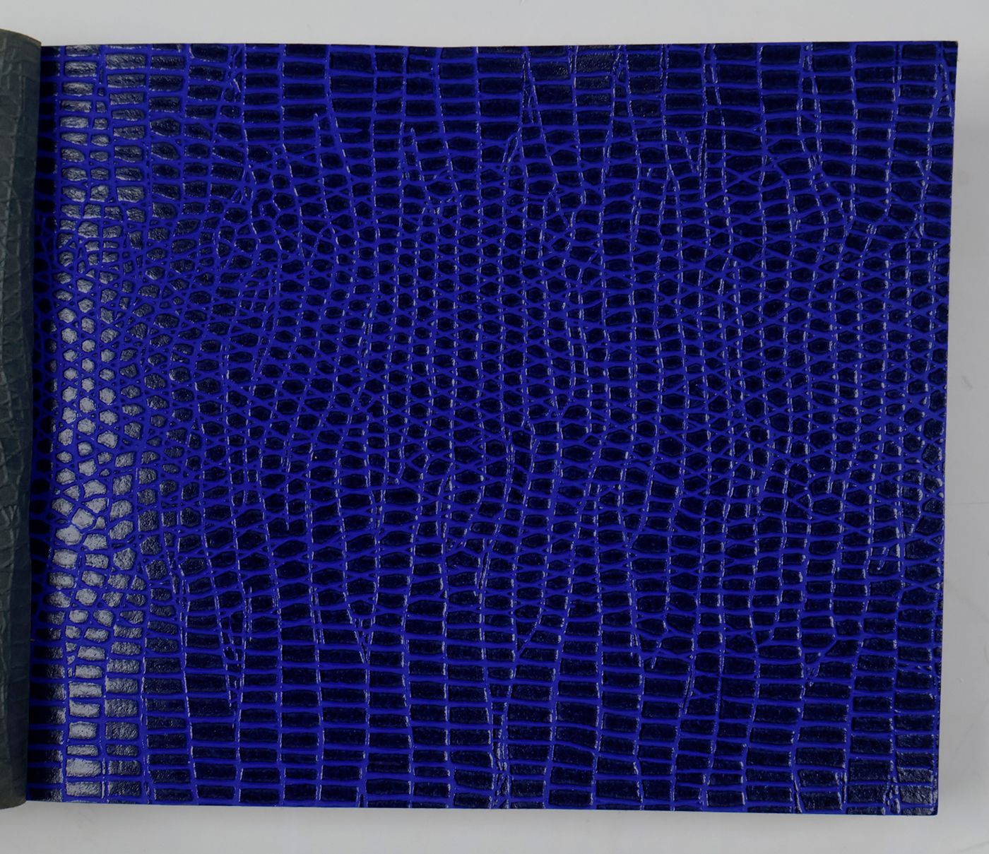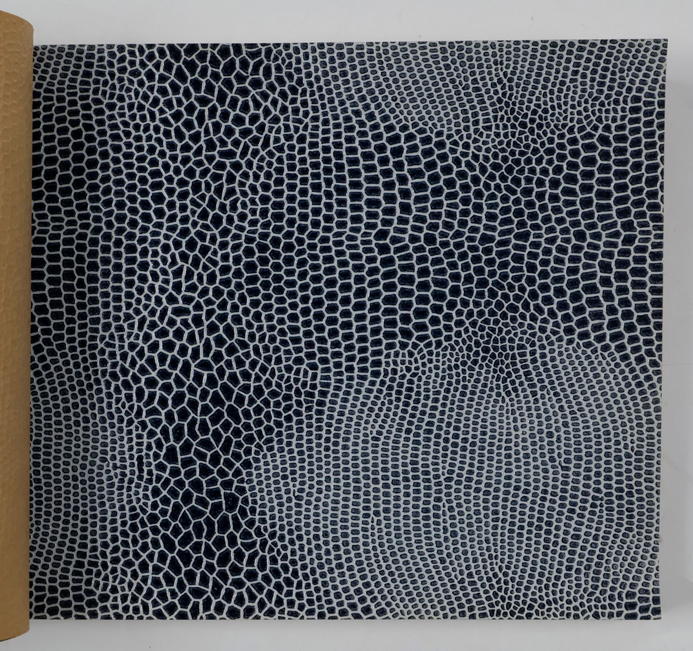 An unusual catalogue, of "Exclusive Designs", containing glossy paper samples (designs for wallpaper, book covers, etc.) chiefly showing reptile-skin patterns, brick-wall and pebbled patterns, and several other embossed patterns, in a variety of colours. The firm, Bénard, produced Gaufres, Indiennes, Micaces, Brocarts, Ors, en Rames ou en Bobines. Suédine, Velours, Cellodermes" [waffle fabrics, Indian prints, mica fabrics, brocades, gold fabrics, in rolls or spools. Suede, velvet, celloderm], this catalogue showing celloderm paper. Individual samples are printed in colour, monochrome, or gold. It is interesting to see the effect of different colours on the same graphic design. The samples are individually numbered (stamps on versos; numbers in a rather random order). Included: a cyclostat price list on yellow paper, recording size, minimal number of copies, etc., with some additions by hand. A very good, unmarked copy.