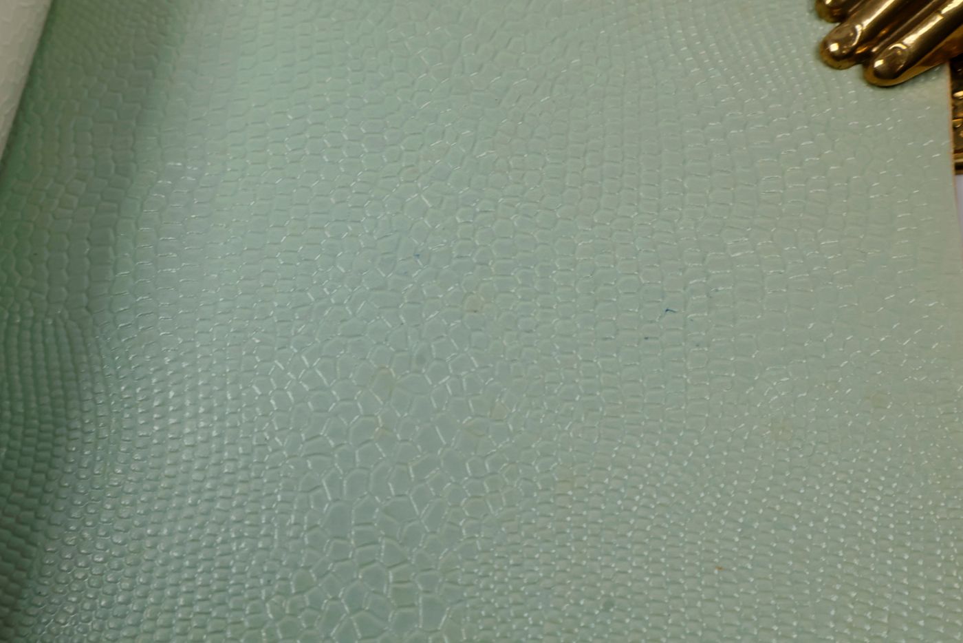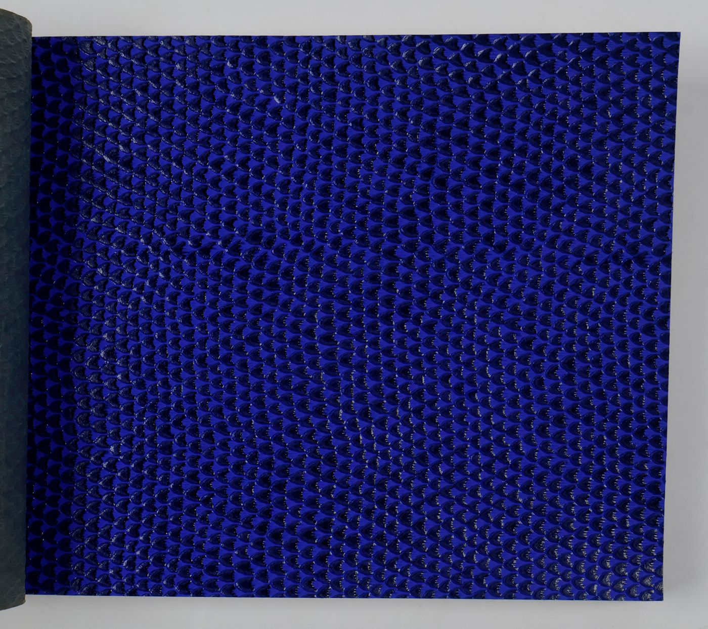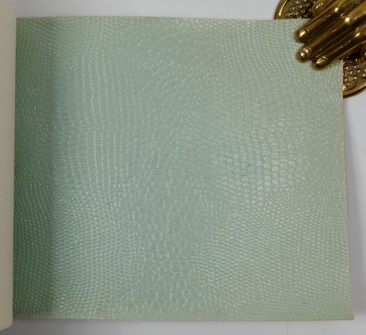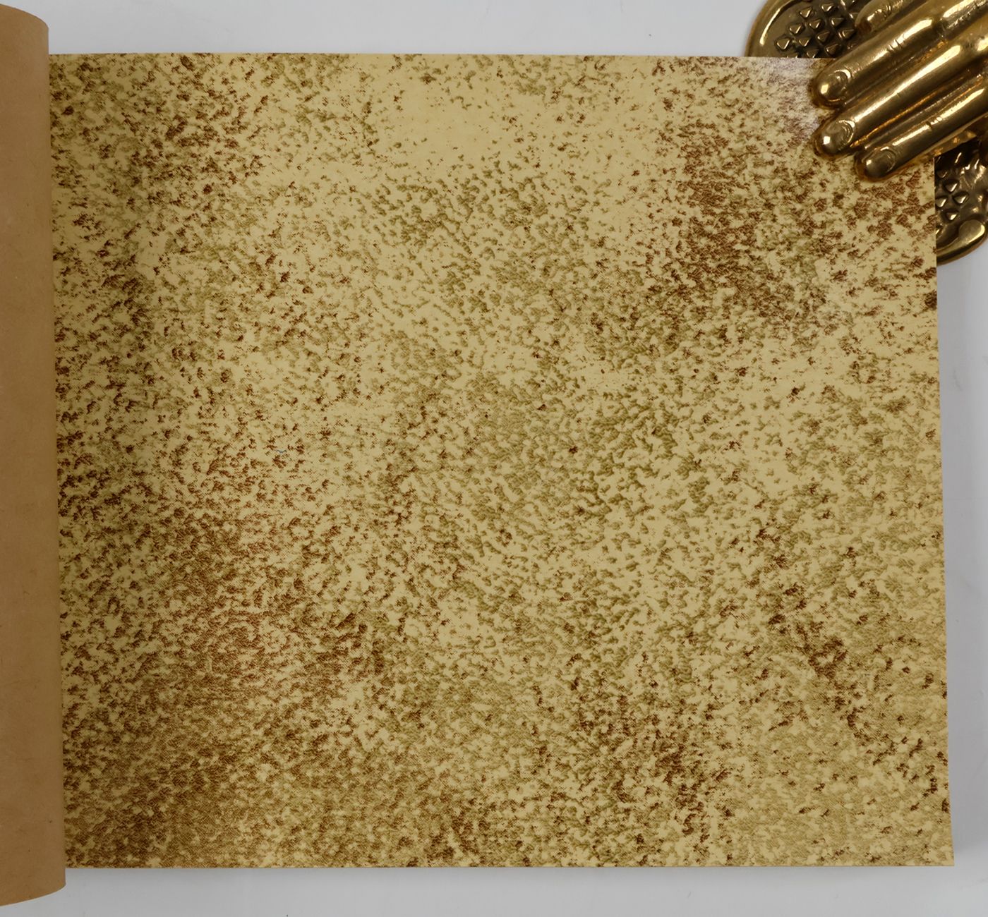 An unusual catalogue, of "Exclusive Designs", containing glossy paper samples (designs for wallpaper, book covers, etc.) chiefly showing reptile-skin patterns, brick-wall and pebbled patterns, and several other embossed patterns, in a variety of colours. The firm, Bénard, produced Gaufres, Indiennes, Micaces, Brocarts, Ors, en Rames ou en Bobines. Suédine, Velours, Cellodermes" [waffle fabrics, Indian prints, mica fabrics, brocades, gold fabrics, in rolls or spools. Suede, velvet, celloderm], this catalogue showing celloderm paper. Individual samples are printed in colour, monochrome, or gold. It is interesting to see the effect of different colours on the same graphic design. The samples are individually numbered (stamps on versos; numbers in a rather random order). Included: a cyclostat price list on yellow paper, recording size, minimal number of copies, etc., with some additions by hand. A very good, unmarked copy.