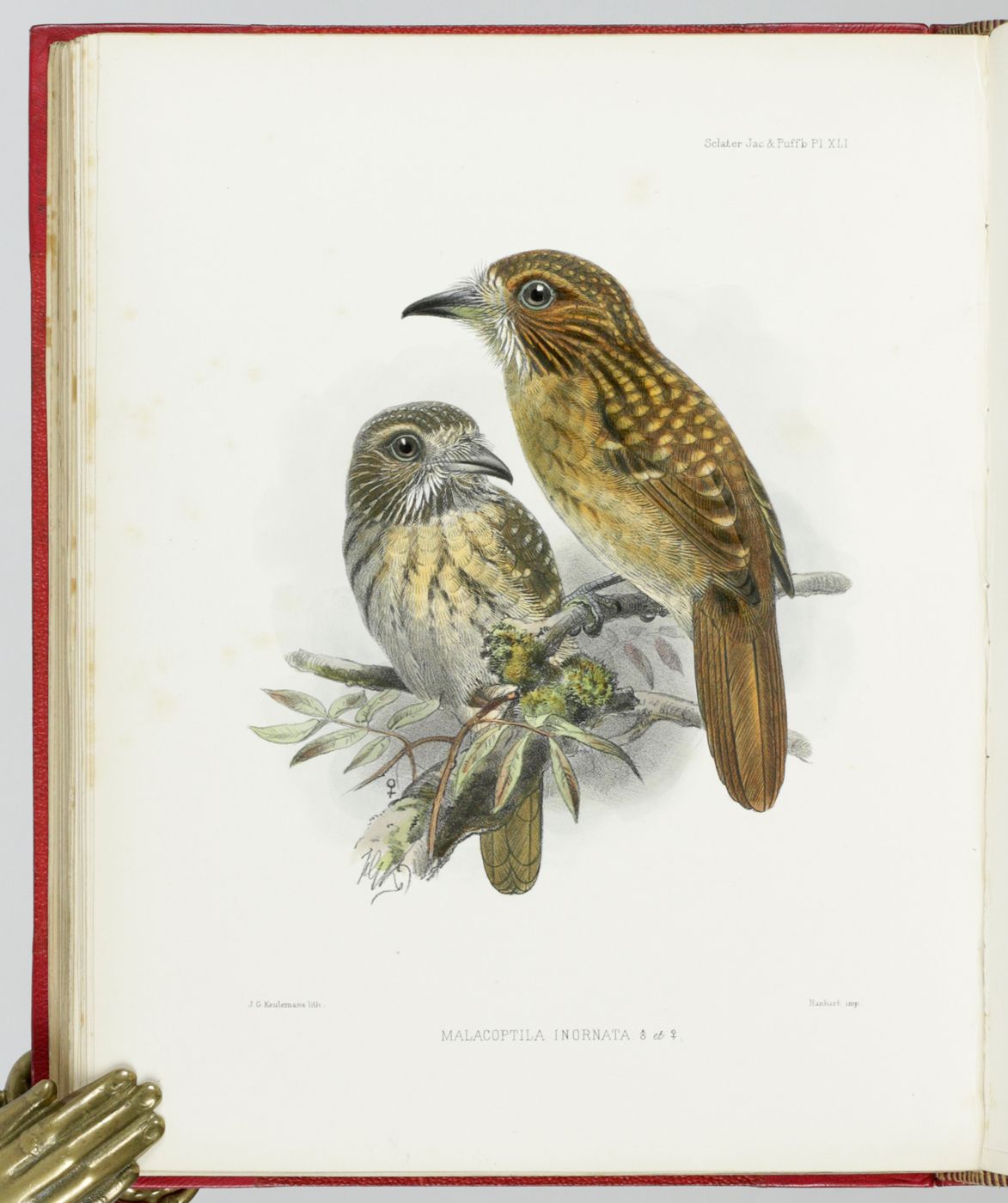 A work not only renowned for its scientific accuracy and wealth of (new) information, but above all for its astonishing illustrations. All "excellent" (Zimmer) plates are by the famous Dutch bird illustrator John Gerrard Keulemans (1842-1912). The text is by the renowned British zoologist (chiefly ornithologist) Philip Lutley Sclater (1829-1913). Both bird families occur only in South and Central America up to Mexico. Puffbirds get their common name from their fluffy plumage. The list of subscribers, present in all but the last (July 1882) wrappers, mentions between 37 and 46 individuals, societies, and institutional libraries (including one book dealer, presumably for a single customer). In the last instalment, a final list of 48 subscribers is present (dated July 1882). Provenance: armorial bookplate of the Anglo-British botanist and ornithologist Henry Rogers Broughton, 2nd Baron Fairhaven (1900-1973), mounted on the front pastedown. Light shelf wear, mostly to the front upper hinge; Plates 44 and 54 somewhat spotted, as are the adjacent text leaves; first and last blank and opposite blank free endpaper versos more extensively foxed; all other leaves clean, or only very mildly spotted. Anker, 451; Goode, G. B. (1896) The Published Writings of Philip Lutley Sclater, 15; Keulemans & Coldewey, " Feathers to Brush, the Victorian Bird Artist John Gerrard Keulemans"; Nissen IVB, 840; Zimmer, p. 561.