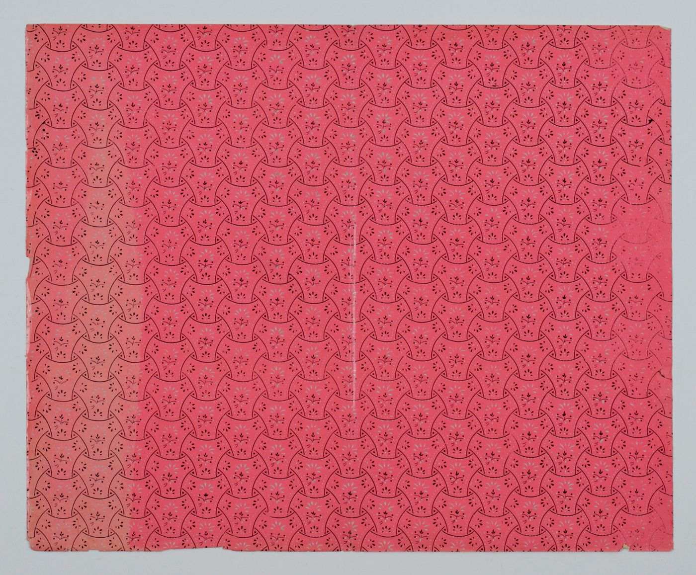 A nice set of finely colour-printed sheets. The result of a very long European tradition in paper printing. The subtle, floral patterns are quite attractive. The paper is quite thin, but not fragile. The origin of these prints is unclear - certainly European, and probably Italian, but we have not encountered anything quite similar before. One sheet with some faint discoloration. Median vertical fold, edges a bit uneven, with some fraying, and tiny chips and tears; these, however, only very close to the edges (one leaf a bit wrinkled near the edges), and otherwise very good: the printing strong.