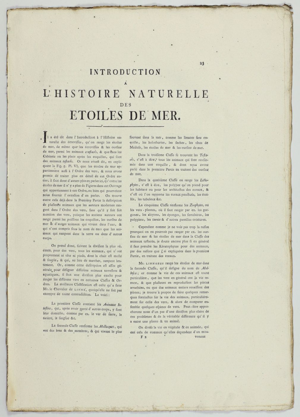 Delices de la nature ou choix de tout ce que les trois regnes de la nature renferment de plus digne des recherches d'un curieux, pour en former un cabinet ouvrage communiqué ci-devant au public par Georg Wolfgang Knorr célébre graveur de Nuremberg continué par ses héritiers avec les descriptions et remarques de Philippe Louis Statius Müller ... revû, corrigé et augmenté d'une préface par Mr. Jean Ernest Emanuel Walch ...traduit de l'allemand par Jaques Frederic Isenflamm. [etoiles de mer - starfish].