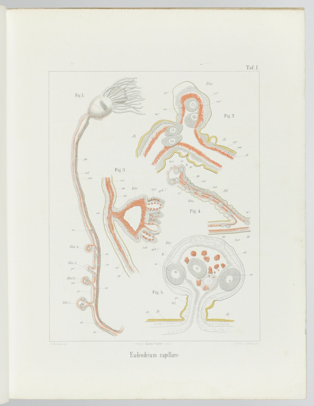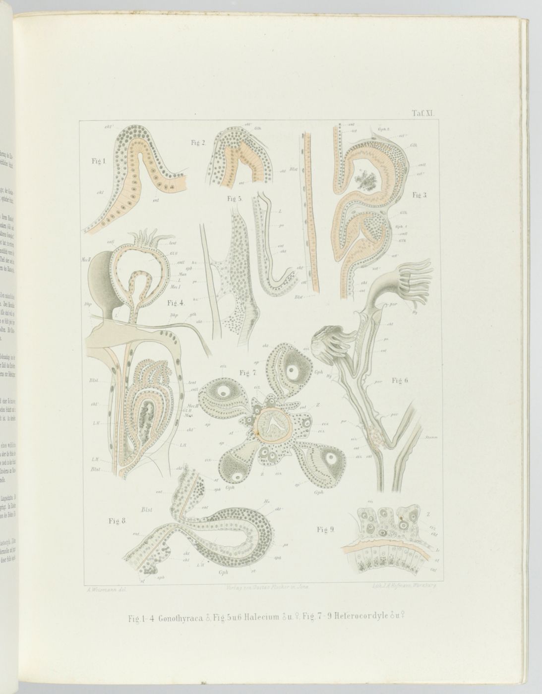 Jena, Gustav Fischer, 1883. In two volumes (text and atlas). 4to (35.4 x 27.2 cm). Title page, iii- xiii, 295 pp. [text volume]; title page, [i] p.; 24 chromolithographed plates with explanatory text leaves [atlas volume].