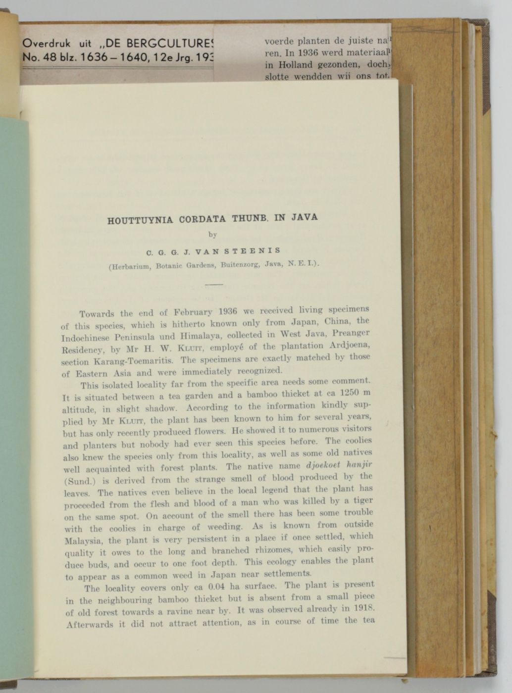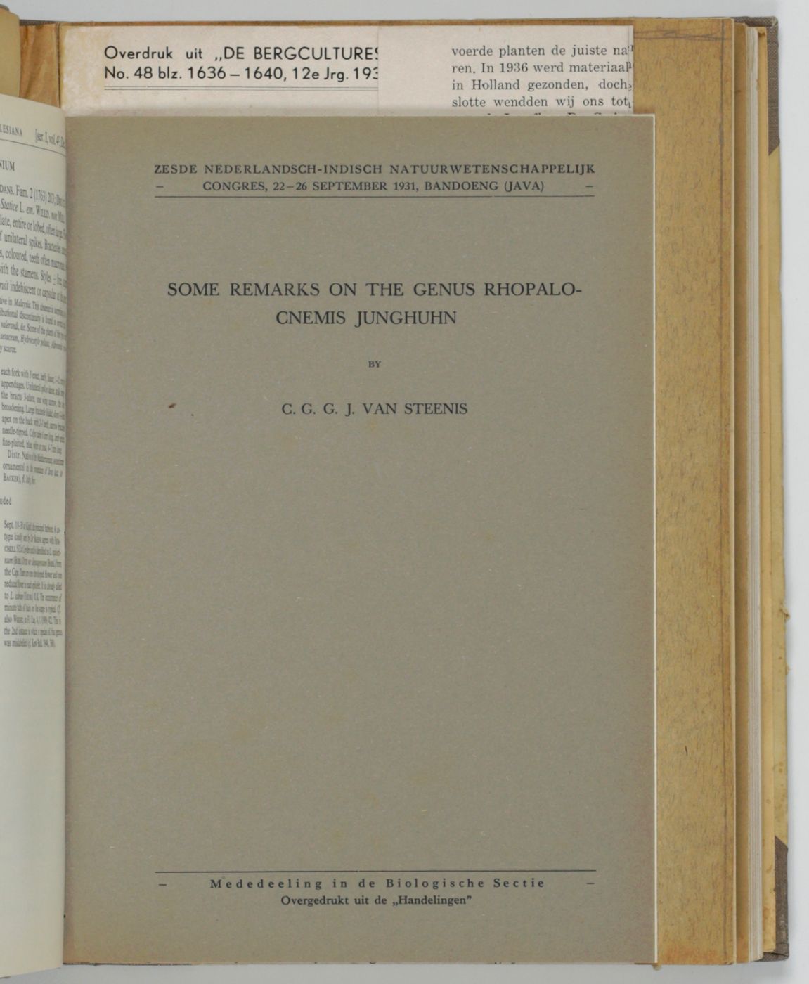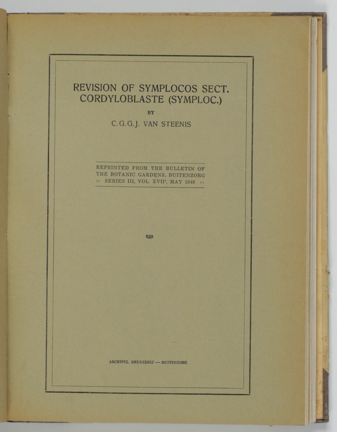 This is a unique three-volume set of the offprints of papers (co)authored by the renowned Dutch botanist Cornelis Gijsbert Gerrit Jan van Steenis (1901-1986), dealing principally with flora of the Malay Archipelago, in particular Java and other Indonesian islands. The three volumes are subdivided as follows: I. Floristiek - Plantensystematiek (floristics, plant systematics); II. Oekologie - Plantengeographie - Botanische Exploratie (Ecology, plant geography, botanical exploration); III. Biographie - Algemene Botanie (biographies, general botany). The last part includes obituaries. The papers vary in size; a few are a bit trimmed. Uniform library labels at each spine foot; cancelled library stamp on front free endpapers. Otherwise a very good, clean set. Some parts may be quite rare.