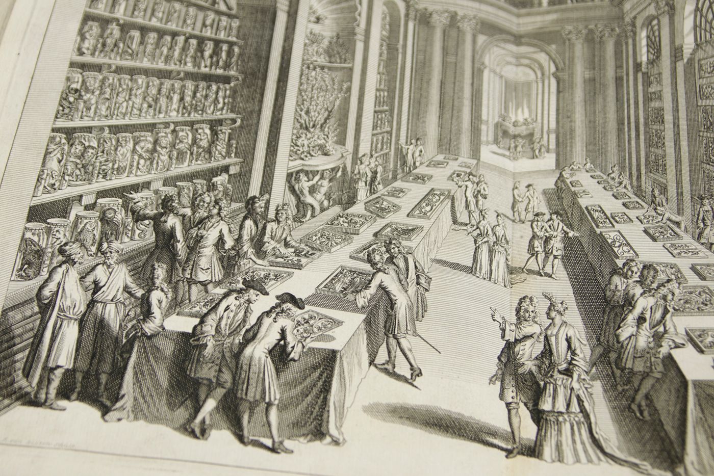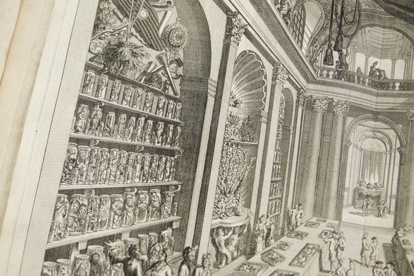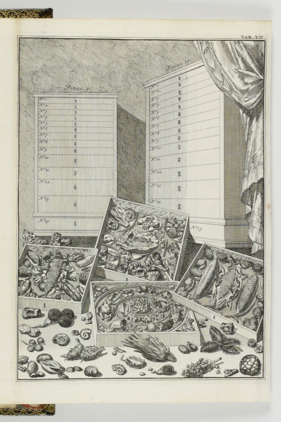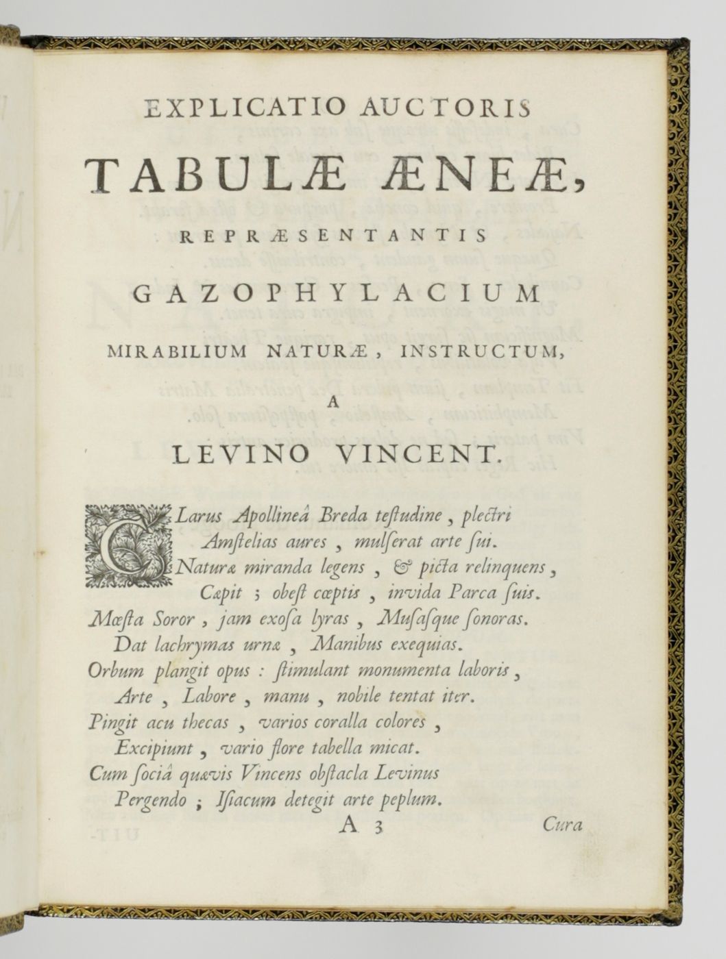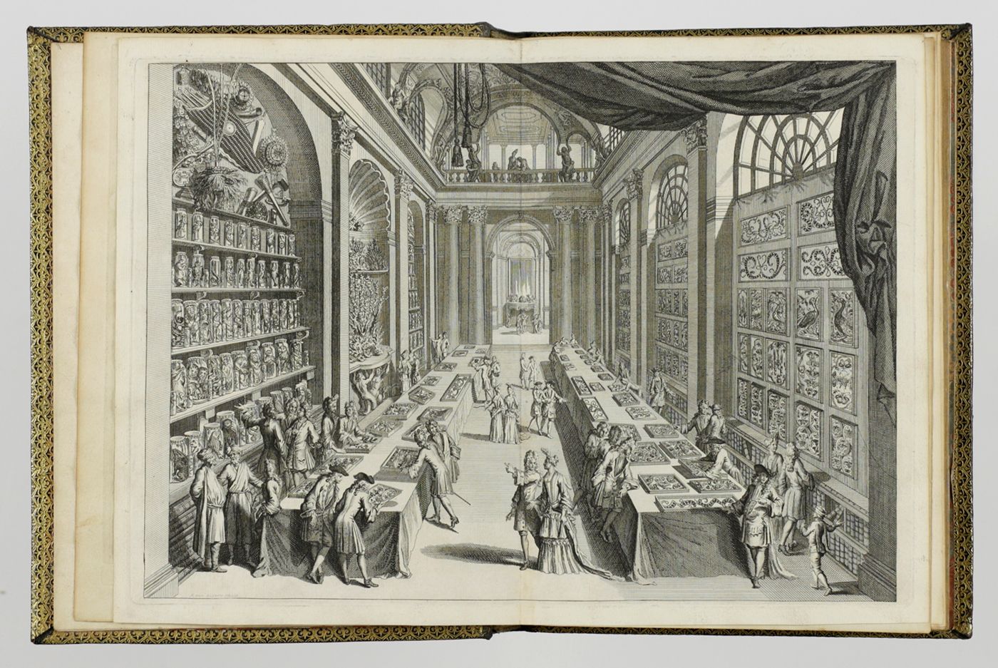 An extraordinary copy of this rarely-seen work by Levinus Vincent (1658-1727) in a spectacular contemporary binding. He "...was a rich Dutch designer and merchant of luxurious textiles, such as damask, silk and brocade. He was of the Anabaptist faith. He collected natural history objects (shells, insects, corals, birds, lizard and small mammals as wet preparations) artefacts (ethnographical items), paintings and drawings of flowers. The titles translate as: Miracle Show of Nature, opened in a brief description of the principal parts of the special rarities included therein; arranged and preserved by Levinus Vincent. [AND] The second part or continuation of Nature's Miracle Show, or a short description of bloodless, swimming, flying, crawling, and four-legged clawed egg-laying animals, and of shells, corals, sea shrubs, metallic and stone-turned things , etc. in very large numbers present in the cabinets of Levinus Vincent. Vincent and his wife, Joanna van Breda, took a lot of effort to present their collectables in a pleasurable and instructive spectacle. They ordered their shells and insects in elegant designs that resembled magnificent pieces of embroidery" (Wikipedia). He "considered it his task to create an order in the collection. He classified and catalogued insects, butterflies and shells, among other things. His collection could be visited. The entry price was two guilders in 1726: a substantial sum. Vincent saw nature as a reflection of God's omnipotence and, according to his own words, his collection had people turned to God because they were impressed by His ability" (website Stadsarchief Gemeente Amsterdam). Vincent "...aimed at the non-Latin-speaking public, printing the catalogue of his collection in both Dutch and French - Wondertooneel der Nature (Wonder Theater of Nature), giving details of all the objects on display. This catalogue sold for three guilder plus a tip or entrance fee of two guilder. He had fixed hours for its visitors. His visitor book (from 1705 to 1737) includes at least 3,500 entries, including Peter the Great. ... After the death of his second wife in 1715, he remarried a woman who did not like his collection or hobby. Vincent moved to the Hague, hoping to find a buyer for his cabinet among the town's many diplomats. He corresponded with such friends as James Petiver and Hans Sloane in England." (Wikipedia). Page numbering is somewhat confusing due to the presence of two unnumbered pages between the (also unnumbered) pages 8 (errata) and 9 of the second part. Binding and contents, except for an occasional small spot and a small chip in the lower outer corner of the rear endpaper, in a superb state. Once-in-a-liftetime copy. Nissen ZBI, 4254. Fearrington, Rooms of wonder, 96 (Lat. ed.).