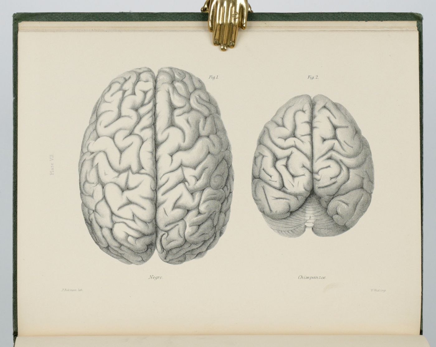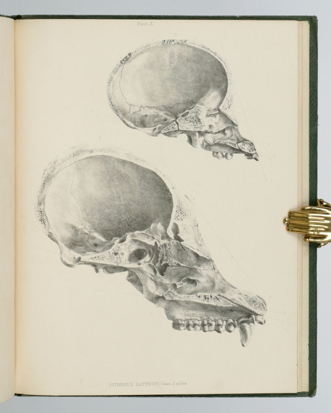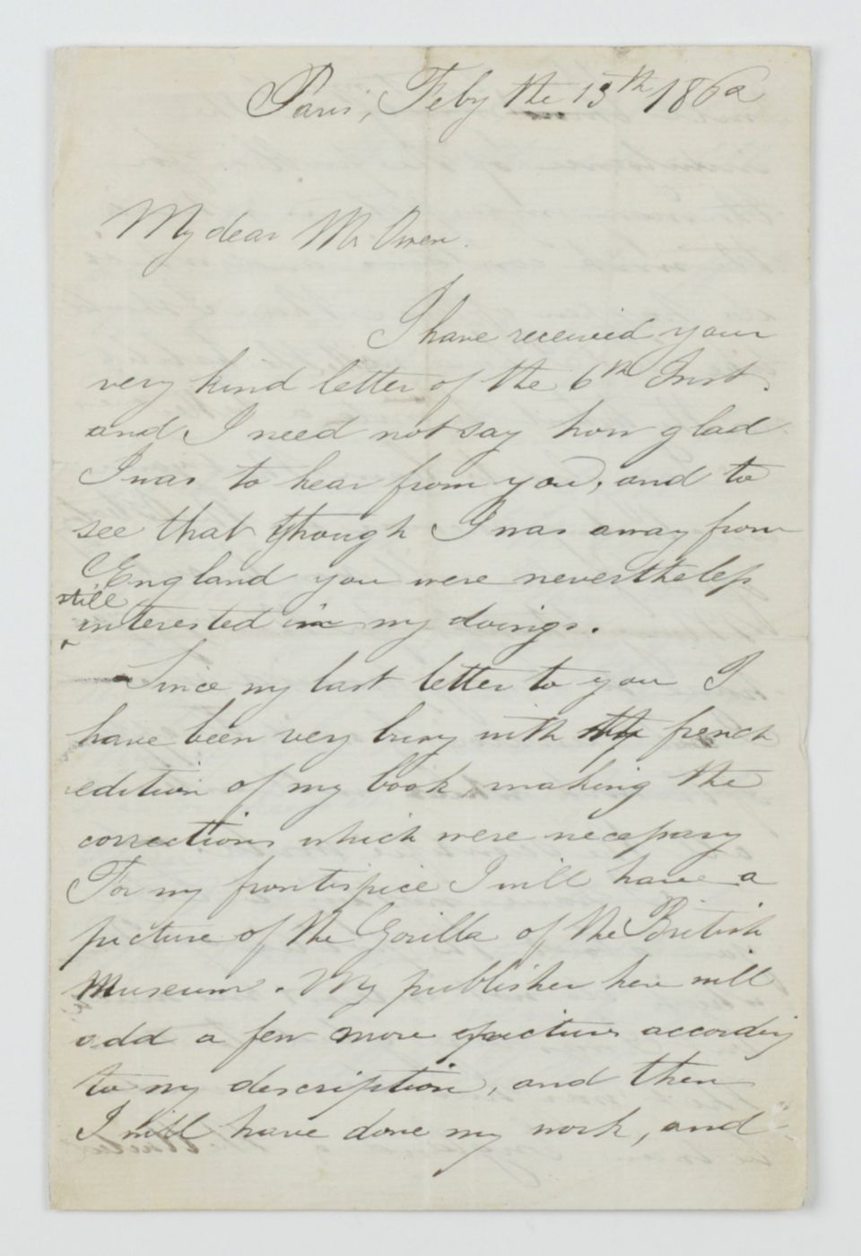 Written by the greatest comparative anatomist and osteologist of the 19th century, Richard Owen (1804-1892). The last plate, comparing the skeletons of the gorilla and man is larger, double-folded. The hand-coloured illustrations are by the renowned German-born natural history artist Joseph Wolf (1820-1899); the others by C. H. Ford, or F. Robinson. A dedication "to P. B. Du Chaillu from his friend the author" written in ink by Owen on the front free endpaper recto. Paul Belloni Du Chaillu (1831-1903) was a French-American traveller, zoologist, and anthropologist. He became famous in the 1860's as the first modern European outsider to confirm the existence of gorillas, and later the Pygmy people of central Africa. "His year of birth is variously given as 1831 (the consensus of modern scholars) 1835, or 1839. Accounts usually cite either Paris or New Orleans as his likely place of birth. A contemporary obituary quotes a statement made by Du Chaillu referring to 'the United States, my country by adoption, and ... France, my native land.' His entry in the 1901-1902 edition of Marquis Who's Who - which was based on information he supplied directly to the editors - says 1838 in New Orleans. His grave marker identifies his place of birth as Louisiana, and the year as 1839. Edward Clodd, Du Chaillu's friend, told the story differently in his memoirs. Clodd mentioned New York as another claimed location, but asserted that Du Chaillu's true birthplace was the French Indian Ocean island territory of Île Bourbon (now called Réunion). He further claimed that du Chaillu's mother was a mulatto woman. In 1979, historian Henry H. Bucher presented evidence to back Clodd's view, including records of Du Chaillu's father. Bucher argued that Du Chaillu, as a member of the European scientific community, would have tried to obfuscate or conceal the family history that would have labelled him a quadroon. In the 19th century atmosphere of scientific racism, great apes and Sub-Saharan Africans were often considered to both have small cranial capacity, and thus be innately unable to achieve civilization; Du Chaillu's credibility as a scientist and explorer would have suffered as a result. Indeed, comments in a letter by Du Chaillu's contemporary, the ethnologist of Africa Mary Kingsley, indicate that at least some scientists who thought poorly of Du Chaillu knew of his ancestry or other discrediting information about him" (Wikipedia). Ironically, Richard Owen was a leading figure among those who believed in the superiority of "white" Europeans over other races. Included: two letters written by Du Chaillu, viz., one to Owen, dated Feb[ruar]y the 13th 1861. In this four pp. letter we find the following quote: "I am glad to know that your concluding memoir on the osteology of the Gorilla will soon be out" However, in reality it would take another four years to be published. In this letter, Du Chaillu stated that he wanted to ask his publisher, John Murray, to send Owen a copy of his work, Explorations in Equatorial Africa (1861), which was the first to described the habitat and habits of the gorilla in great detail. read more