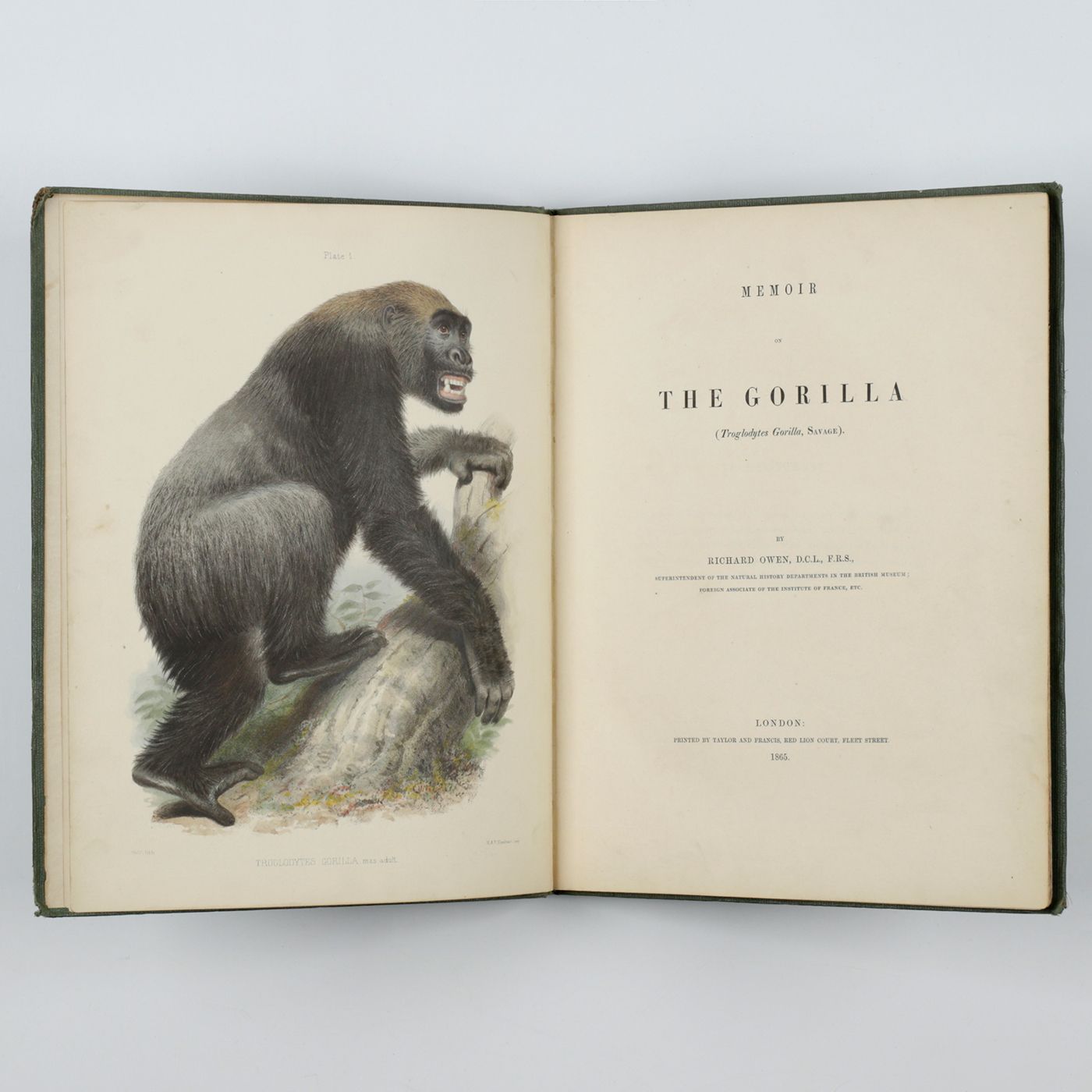 The other letter was directed to Murray himself, dated Oct 29 1861, stating that he forwarded his book on the Gorilla, as well a package with maps and drawings in order to hand these items over to Prof. Owen. Plate 1 acting as frontispiece. Rubbing to edges, the corners a bit abraded, otherwise fine. Cat. BM(NH) p. 1491; Nissen ZBI, 3037; Wood, p. 509. read less