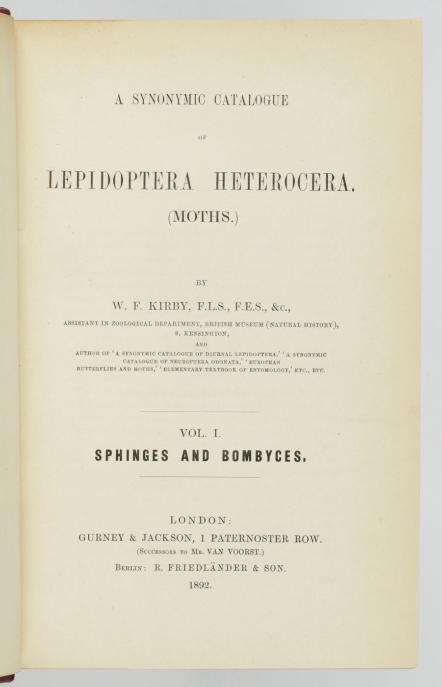 Written by the prolific British entomologist, folklorist and translator William Forsell Kirby (1844-1912). As a folklorist, Kirby influenced J. R. R. Tolkien. This rarely-seen work took 20 years to complete. It is of great taxonomic importance. A one-page Gurney & Jackson advert notes: "Containing the full synonymy of every species described up to May 1892". It was sold at a hefty sum of £2 2s. Provenance: an old private owner's stamp, "Dr. Laubenheimer", on a yellow endpaper - probably the German industrialist and amateur entomologist August Laubenheimer (1848-1904). Several neat, red underlinings and marginalia in a small hand, perhaps by Laubenheimer. Slight wear to spine cover; otherwise very good. Cat. BM(NH) p. 984; Horn-Schenkling II(2), p. 484.