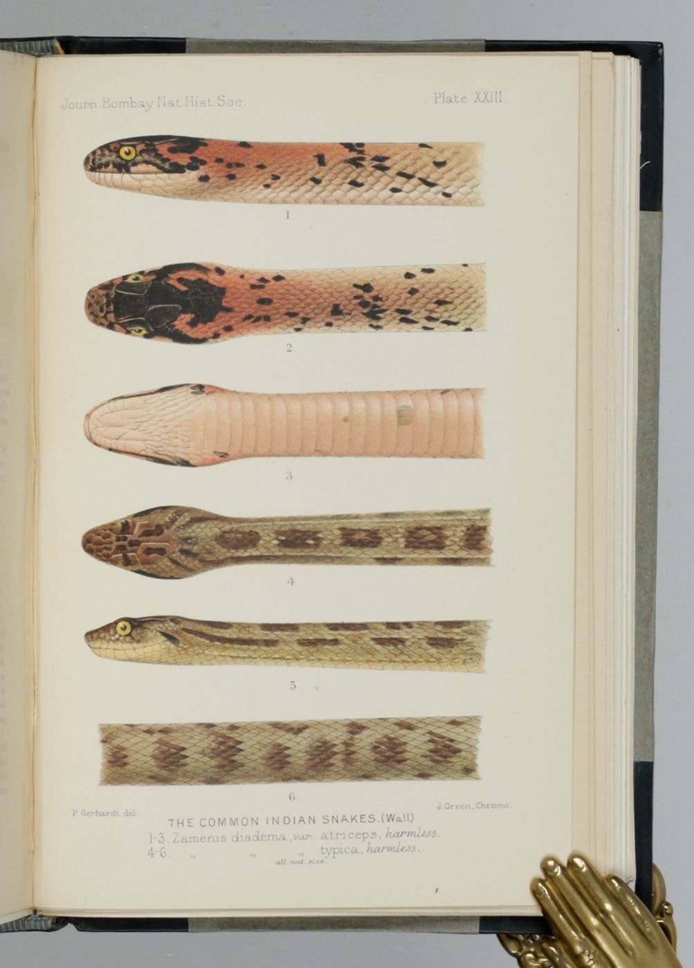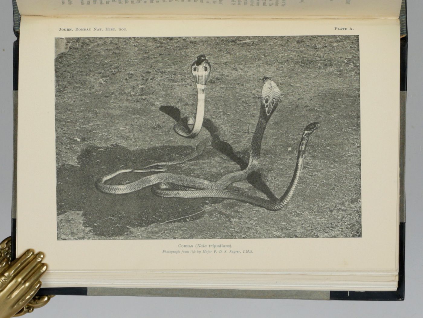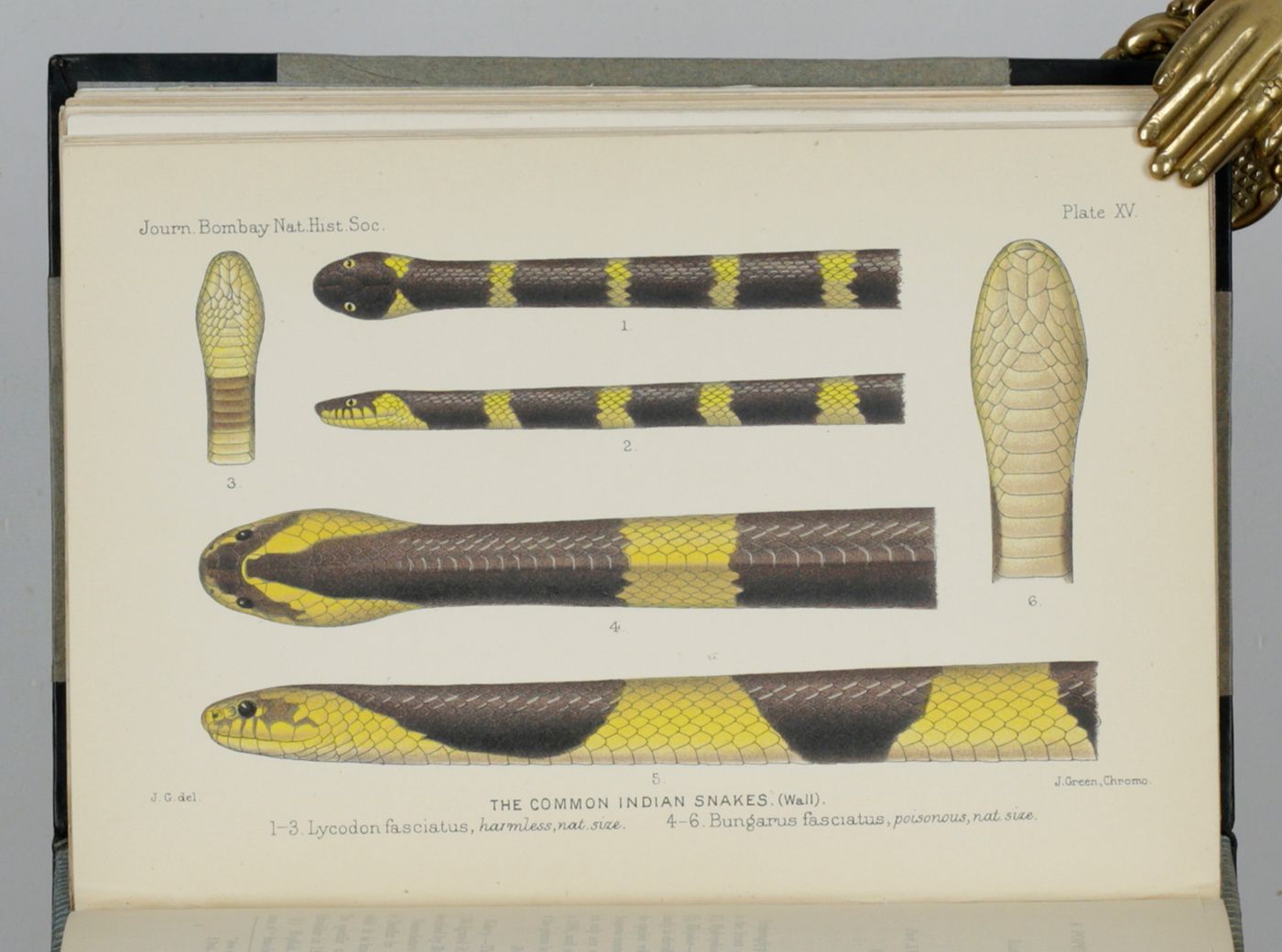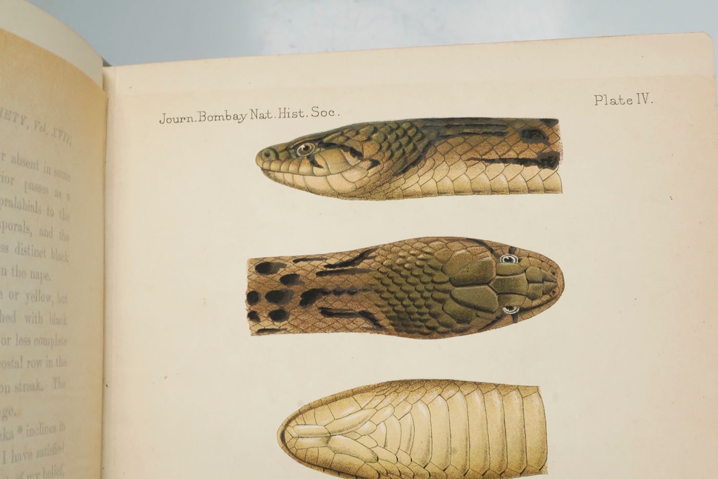 An exceedingly rare, complete copy of a paper published in 29 parts [numbered I-XXVIII, and XX continued] over a period of almost 14 years. The series contains two types of illustrations, besides a few text engravings, namely page-sized "plates" (fine, chromolithographed plates - usually tissue-guarded), and page-sized "diagrams" (engraved plates - some coloured). Both types have blank versos and are numbered separately - the full-colour plates consecutively throughout, the b/w "diagrams" only within an issue. There are three additional b/w plates, simply numbered "A" (in part XV), and A, B (in part XXI). The maps are either coloured or plain, and always with blank versos, except the one in part XIV, which, although partly coloured, is on a text page. The British naturalist Frank Wall (1868-1950) was exclusively interested in snakes. According to Adler he wrote about 215 papers over a 30-year period. "His first major work, issued in serial form, was A popular Treatise on the Common Indian Snakes. This ... unfortunately, was never reissued in book form" (Adler). Parts XXI and XXI "Continued", both on the cobra, were published before part XX, and erroneously numbered XX too. Bound in: one printed leaf of pink paper, relating to the the Cobra-section; and two printed slips relating to a delay in publishing of one of the plates. A few plates somewhat age-toned or spotted, one plate seriously restored, showing cracks, but backed with old paper. Text and plates mostly clean and unmarked. Fore and lower margins vary in size. In all a very good, complete copy of a great rarity. Adler I, pp. 71-72. Not in Nissen ZBI.