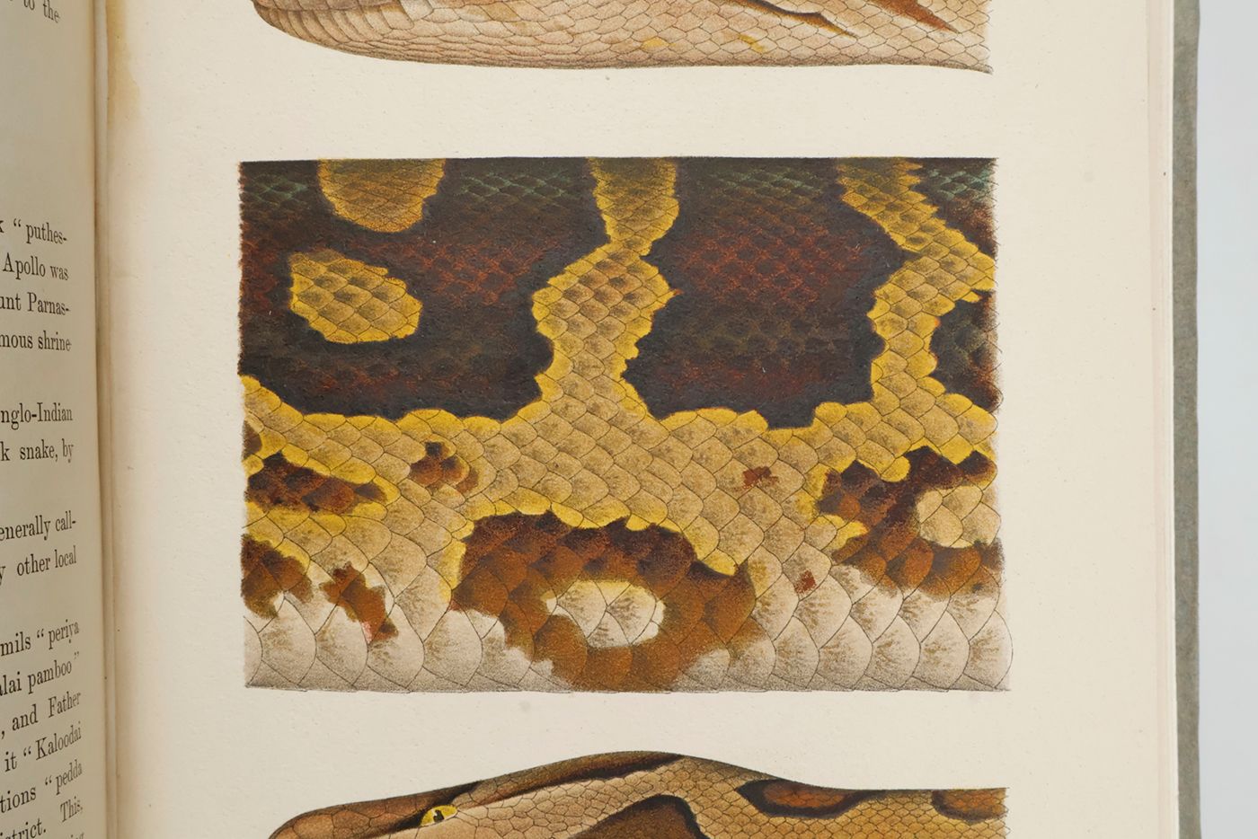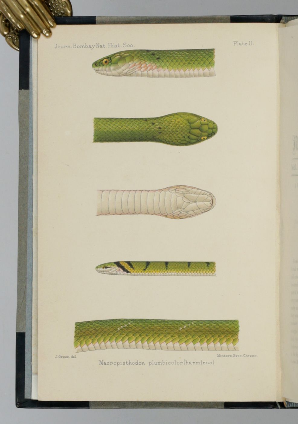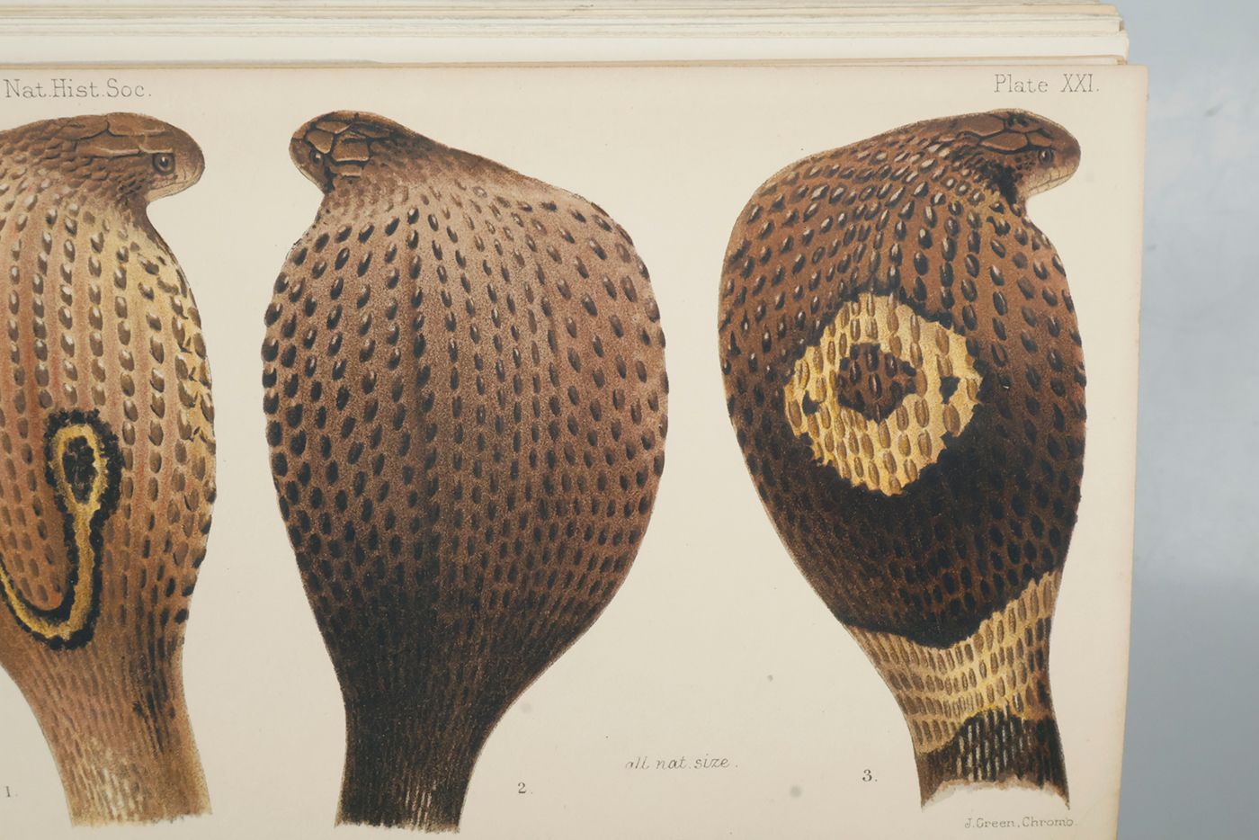 An exceedingly rare, complete copy of a paper published in 29 parts [numbered I-XXVIII, and XX continued] over a period of almost 14 years. The series contains two types of illustrations, besides a few text engravings, namely page-sized "plates" (fine, chromolithographed plates - usually tissue-guarded), and page-sized "diagrams" (engraved plates - some coloured). Both types have blank versos and are numbered separately - the full-colour plates consecutively throughout, the b/w "diagrams" only within an issue. There are three additional b/w plates, simply numbered "A" (in part XV), and A, B (in part XXI). The maps are either coloured or plain, and always with blank versos, except the one in part XIV, which, although partly coloured, is on a text page. The British naturalist Frank Wall (1868-1950) was exclusively interested in snakes. According to Adler he wrote about 215 papers over a 30-year period. "His first major work, issued in serial form, was A popular Treatise on the Common Indian Snakes. This ... unfortunately, was never reissued in book form" (Adler). Parts XXI and XXI "Continued", both on the cobra, were published before part XX, and erroneously numbered XX too. Bound in: one printed leaf of pink paper, relating to the the Cobra-section; and two printed slips relating to a delay in publishing of one of the plates. A few plates somewhat age-toned or spotted, one plate seriously restored, showing cracks, but backed with old paper. Text and plates mostly clean and unmarked. Fore and lower margins vary in size. In all a very good, complete copy of a great rarity. Adler I, pp. 71-72. Not in Nissen ZBI.