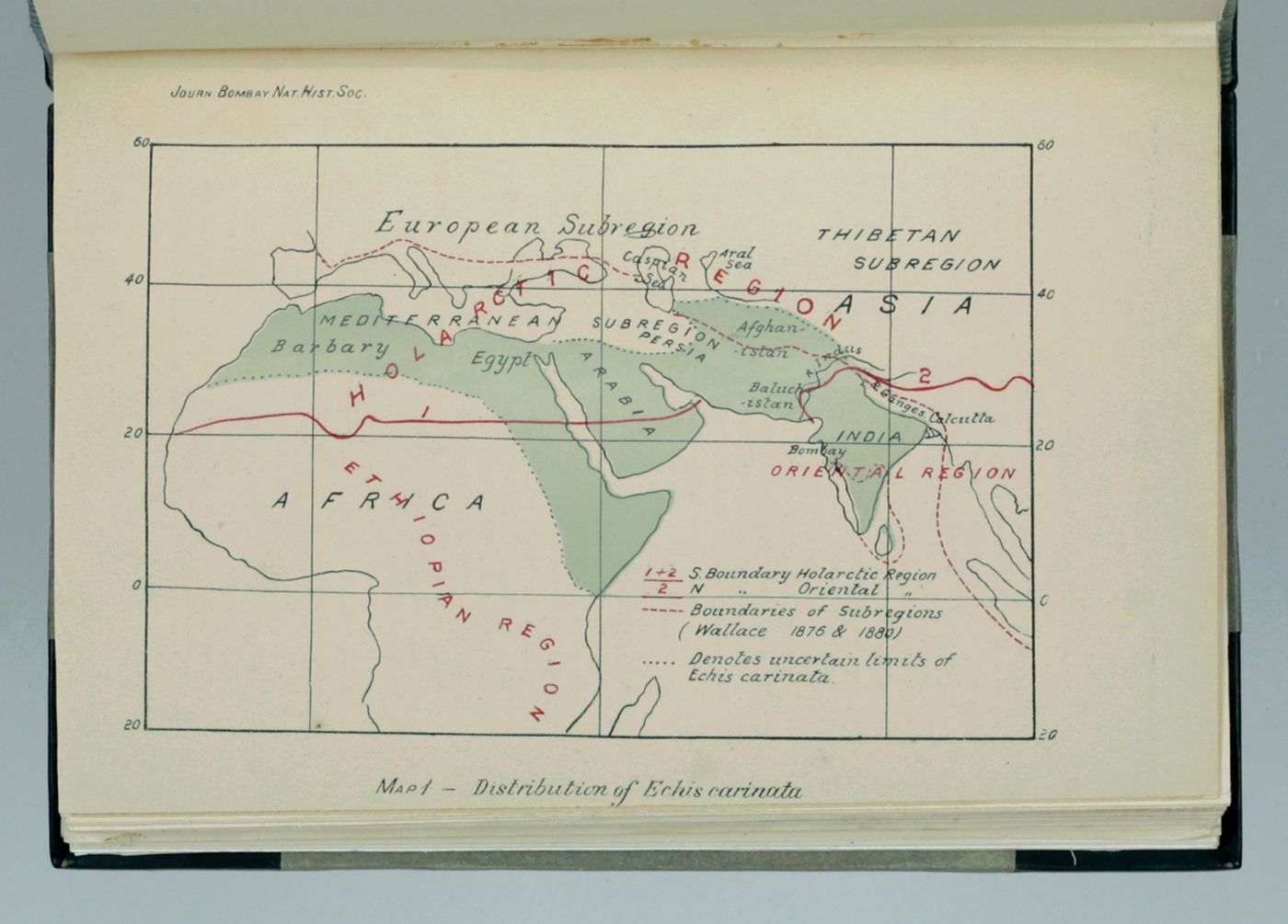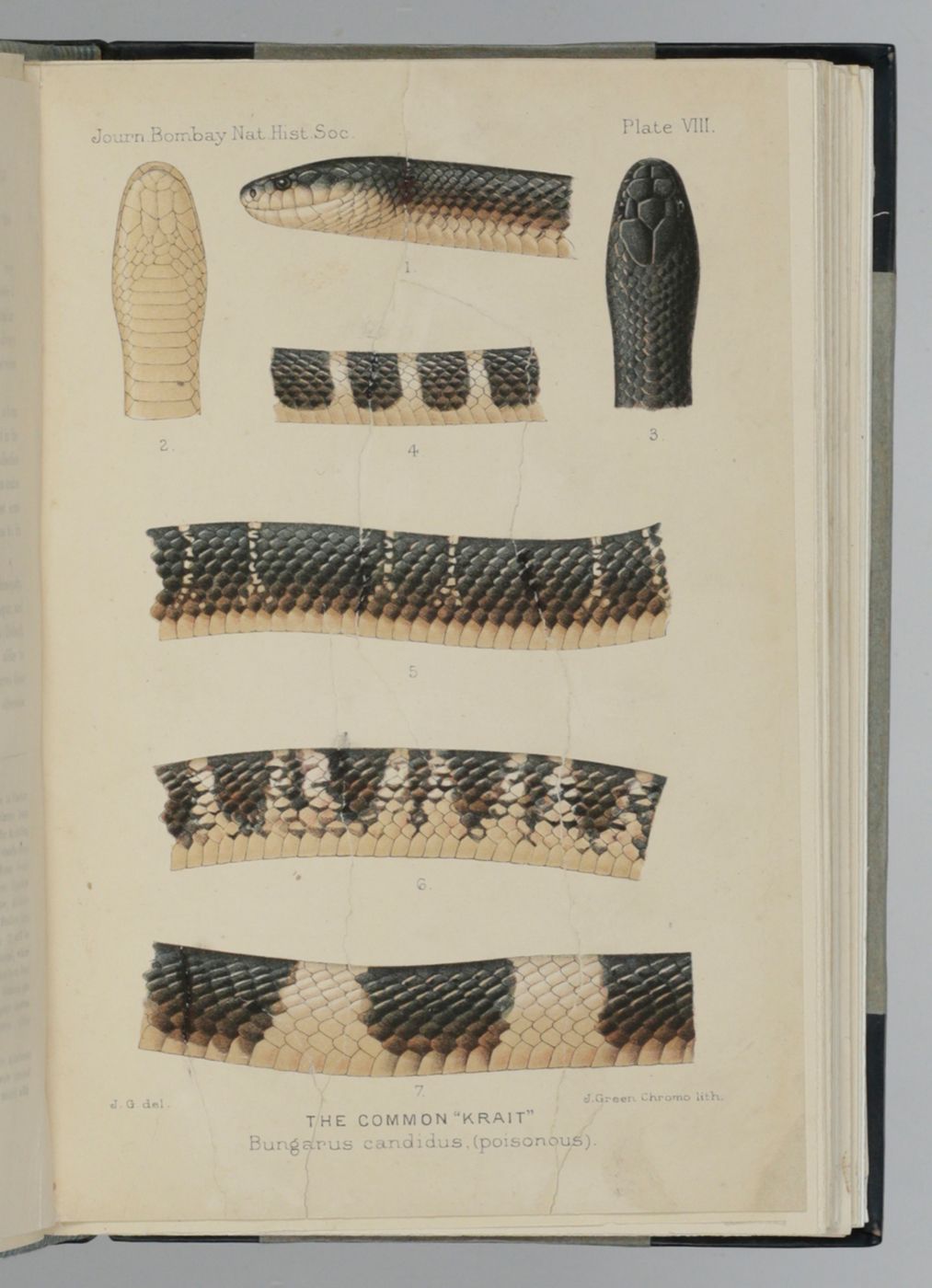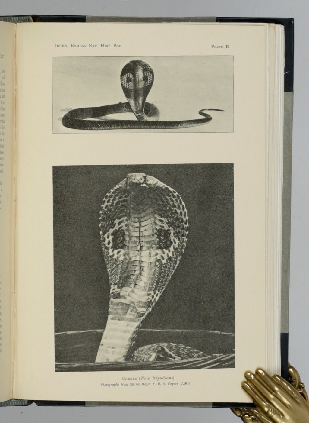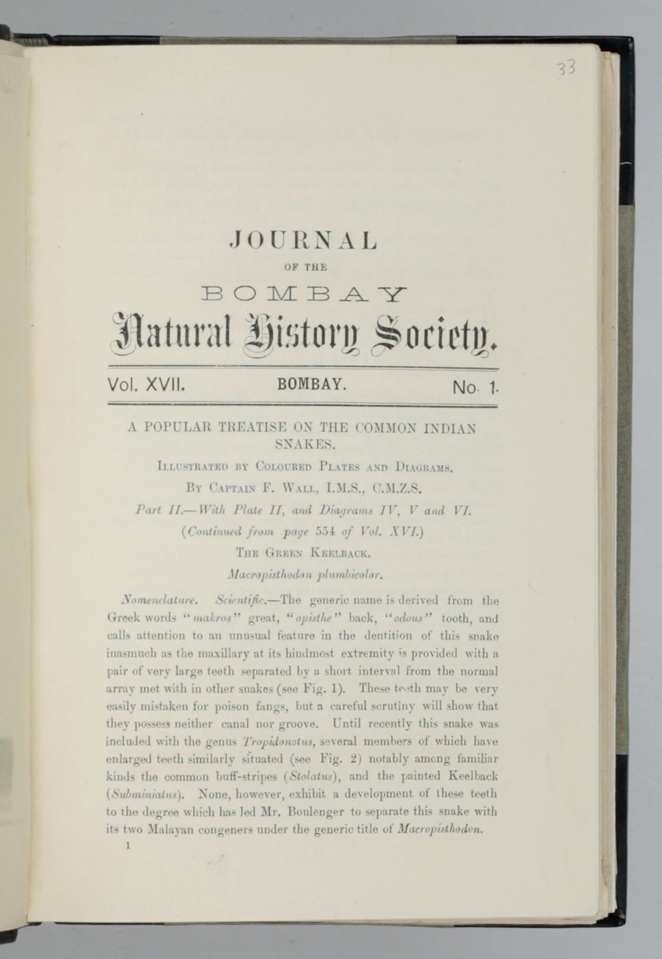 An exceedingly rare, complete copy of a paper published in 29 parts [numbered I-XXVIII, and XX continued] over a period of almost 14 years. The series contains two types of illustrations, besides a few text engravings, namely page-sized "plates" (fine, chromolithographed plates - usually tissue-guarded), and page-sized "diagrams" (engraved plates - some coloured). Both types have blank versos and are numbered separately - the full-colour plates consecutively throughout, the b/w "diagrams" only within an issue. There are three additional b/w plates, simply numbered "A" (in part XV), and A, B (in part XXI). The maps are either coloured or plain, and always with blank versos, except the one in part XIV, which, although partly coloured, is on a text page. The British naturalist Frank Wall (1868-1950) was exclusively interested in snakes. According to Adler he wrote about 215 papers over a 30-year period. "His first major work, issued in serial form, was A popular Treatise on the Common Indian Snakes. This ... unfortunately, was never reissued in book form" (Adler). Parts XXI and XXI "Continued", both on the cobra, were published before part XX, and erroneously numbered XX too. Bound in: one printed leaf of pink paper, relating to the the Cobra-section; and two printed slips relating to a delay in publishing of one of the plates. A few plates somewhat age-toned or spotted, one plate seriously restored, showing cracks, but backed with old paper. Text and plates mostly clean and unmarked. Fore and lower margins vary in size. In all a very good, complete copy of a great rarity. Adler I, pp. 71-72. Not in Nissen ZBI.