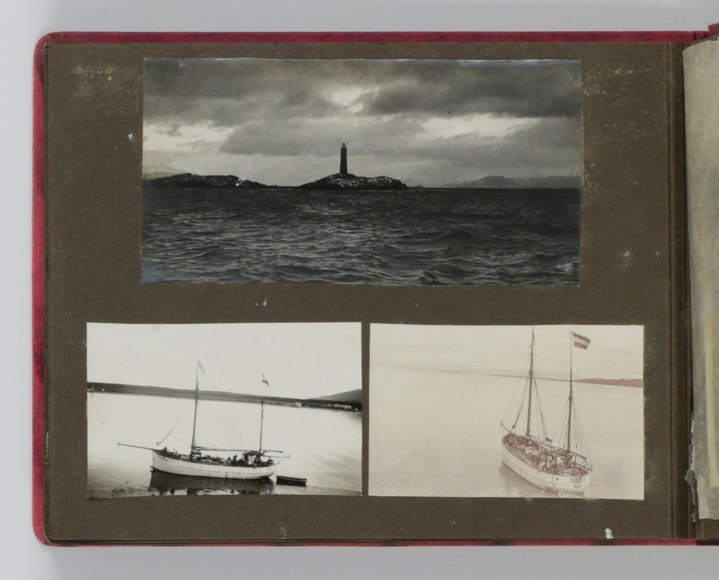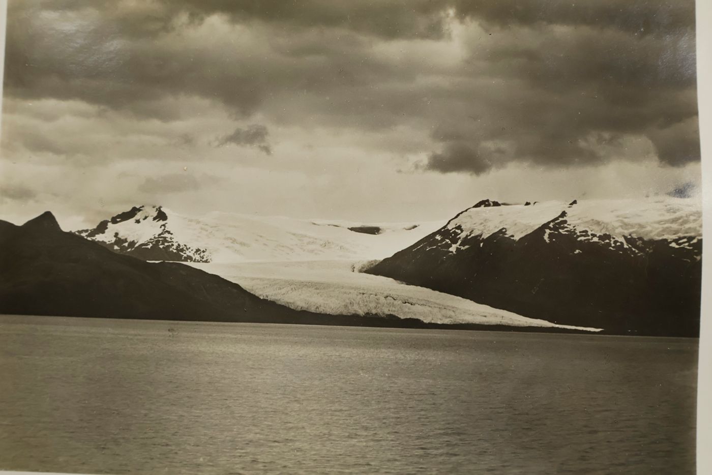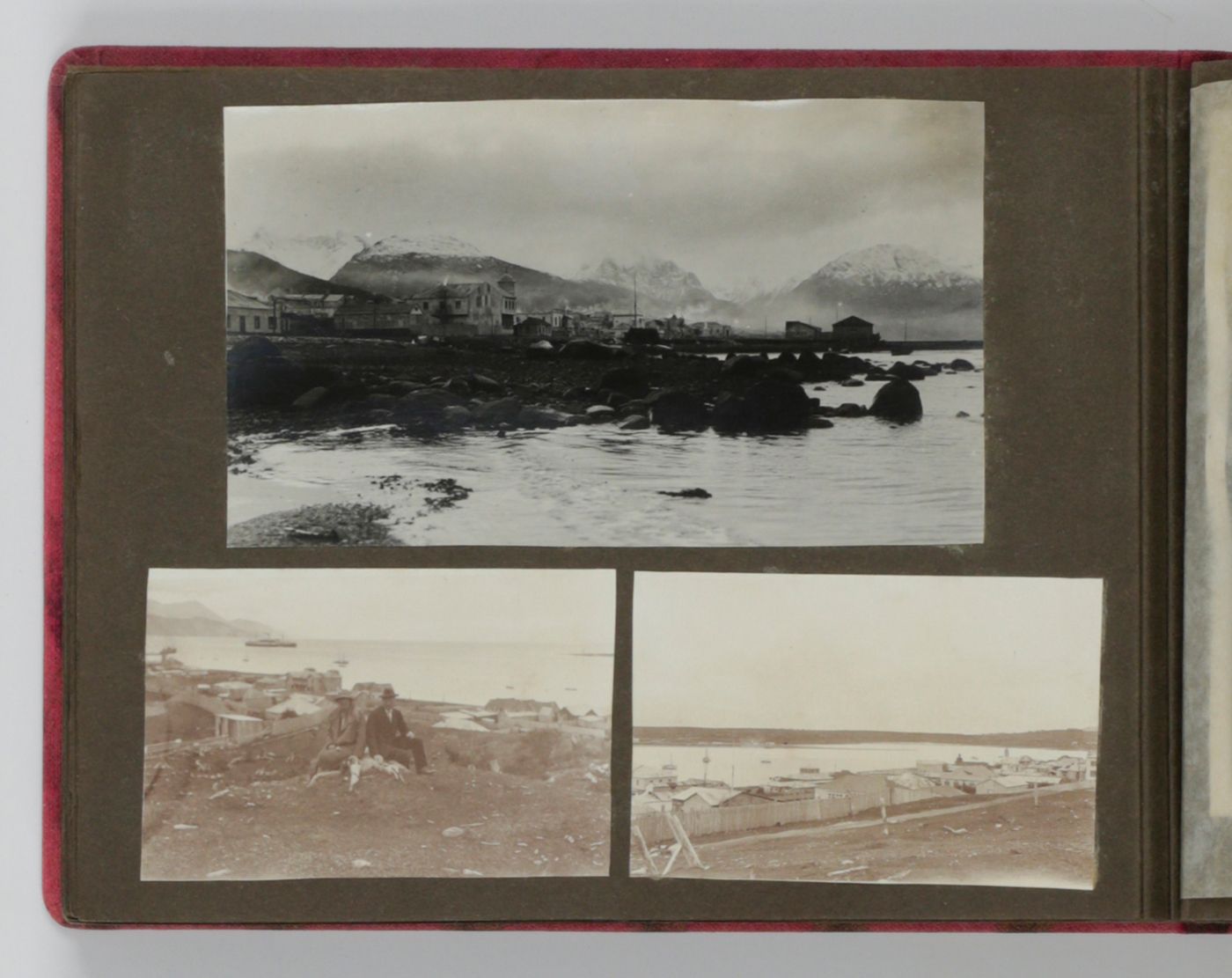 A highly interesting account, with many unique, original photos, of a cruise in southernmost South America, in particular Tierra del Fuego, by a party of German tourists. Patagonia and Tierra del Fuego have become a very popular destinations for cruises today, but this is a very early example of a cruise through this region, showing the area as it was almost one hundred years ago, and in many ways much changed since then, but, then again, with many other places hardly altered, as can be seen by comparing the photos of, e.g., Harberton, or Ushuaia, with recent photos on the internet. Views include Magallanes (Punta Arenas), "Haberton" (Harberton, on the Beagle Canal), Ushuaia, Mount Darwin, Bahia Garibaldi and the Garibaldi glacier, the steamer Antonio Delfino, the expedition ship Feuerland, etc. The Antonio Delfino "was a Hamburg South America Line steamship built 1921 at Hamburg by Vulcan Werke. The ship was built to operate on the Hamburg - South America service. In 1932 the ship was chartered to the Norddeutscher Lloyd and renamed Sierra Nevada. In 1934 she was returned to the Hamburg South American Line and the name was changed back to Antonio Delfino. In 1940 she was requisitioned by the Kriegsmarine and used as a barracks ship at Kiel, and from 1943 at Gdynia [Gotenhafen]. In 1944 she became a command ship for the Admiral of Submarines at Gotenhafen. In 1945 she was used to evacuate refugees and wounded military personnel from Gdynia, carrying a total of 20,522 people in five voyages. In May 1945 she was seized by British forces in Copenhagen. She was taken over by the Ministry of War Transport and managed by the Anchor Line. The ship was refitted as a troopship by John Brown & Co, Clydebank. and renamed Empire Halladale. On August 31, 1946, she inaugurated a troopship service between Tilbury and Cuxhaven, during which period she also transported families of UK military personnel who were to live in Germany, later serving in the Middle East and Far East. Laid up in October 1955 at Glasgow. Scrapped in February 1956 at Dalmuir, West Dunbartonshire" (Heritage Ships website). Very rare. We found no record of other copies of the printed edition. All photos in very good condition, as are the original covers.