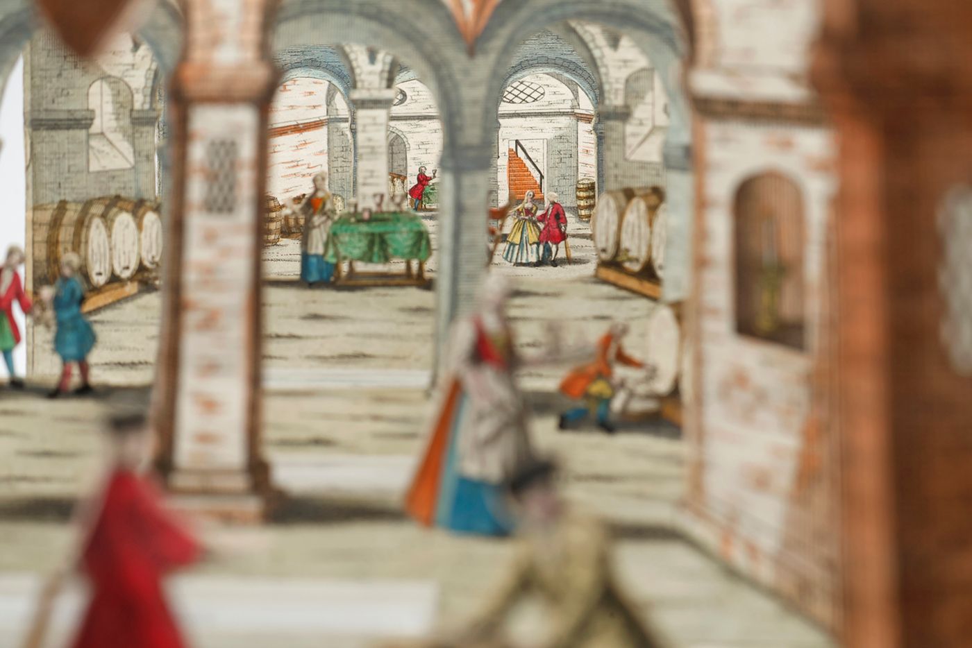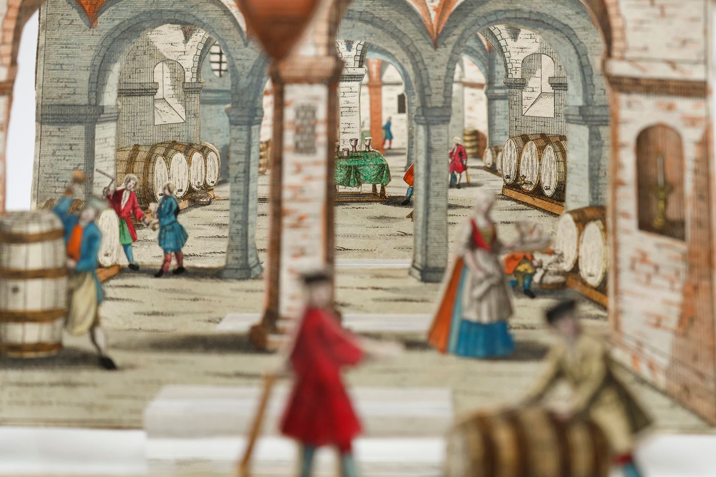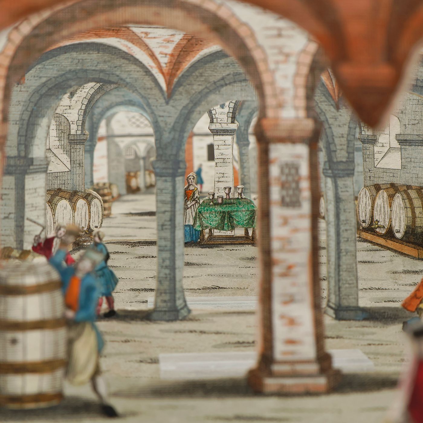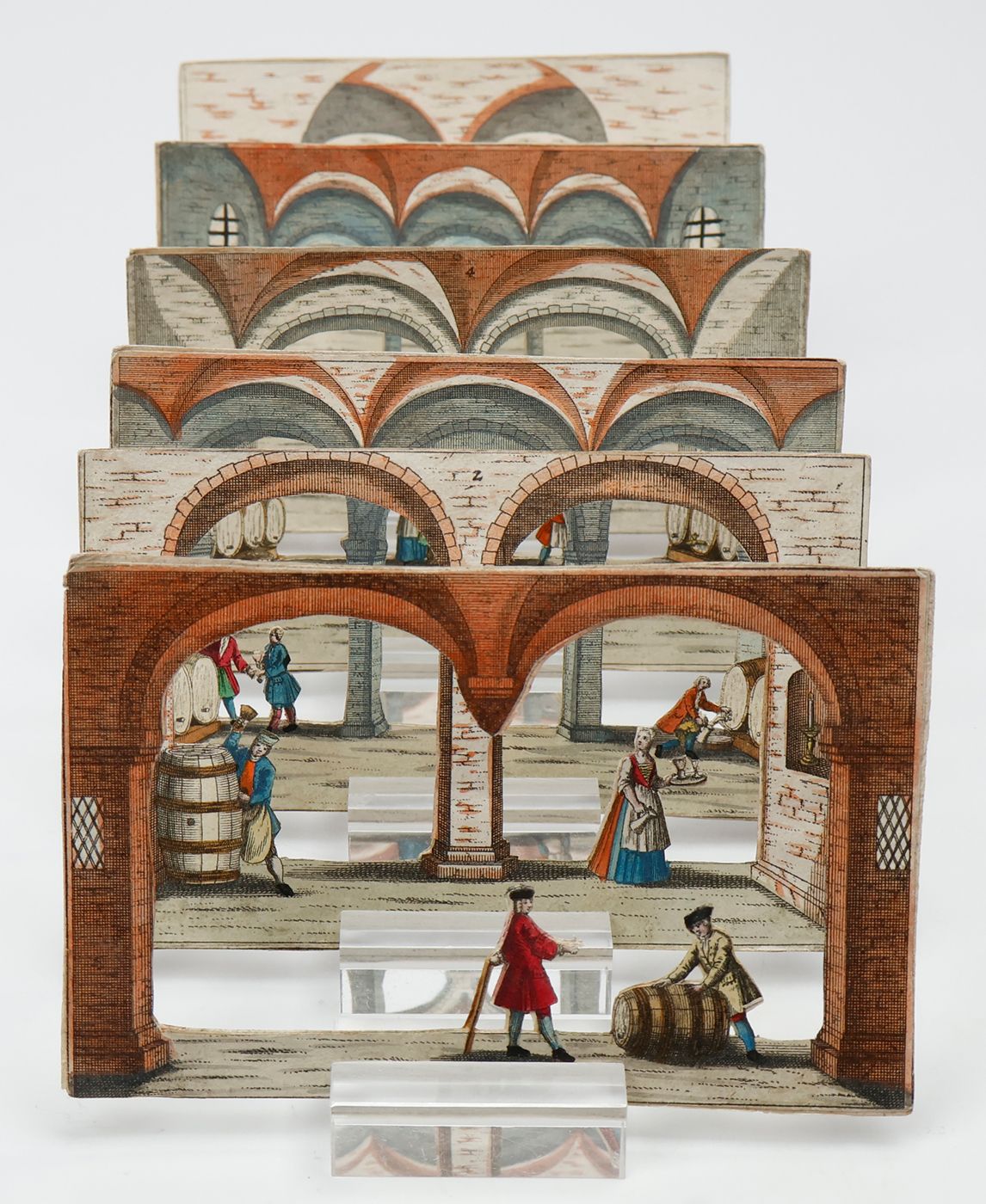 A wonderfully preserved, complete set of cards, with delicate cut-outs and hand-colouring. This peepshow consists of six cards which together form a view through a wine cellar, arguably one of the most popular subjects. Most probably produced by the Augsburg firm of M. Engelbrecht, having all the hallmarks of his quality in engravings and colouring, as well as in the choice of subjects. "Martin Engelbrecht (1684-1756), a native of Augsburg was the son of a colour merchant. He began his career as an artist by the attachment to a local publishing house but had by 1708 moved to Berlin where he was engaged in the designs after Eosander von Goethe of a the Silberbüfett im Ritterall at Berlin and of a porcelain cabinet in Charlottenberg. Returning to Augsburg he was involved in illustrating a wide variety of works after various artist mainly on subjects connected with the decorative arts. However in 1711 Engelbrecht was again in Berlin working at a fine art publishers with his older brother Christian Engelbrecht (1672-1735). They decided to start their own independent publishing house at Augsburg in 1719 where they produce a wide variety of graphic works. It was with peepshows Martin Engelbrecht excelled having the unique position of no other publishing house or place of publication to compete against him. Engelbrecht was kept busy with the many other special graphics and employed two artists, Jeremias Wachsmuth (1711-1771) and Johann David Nessenthaler (1717-1766), to produce designs for the peepshows. Wachsmuth’s work can be found as early as 1731, and those by Nessenthaler starting from 1737. With Martin Engelbrecht's death in 1756 the business continued to thrive under the management of Engelbrecht's daughters and sons-in-law, and continued on well into the nineteenth century." (Marlborough Rare Books Catalog, List XLV, 2009. pp. 33-34). The quality is certainly of the highest level. Cards 2, 4, and 6 are numbered on rectos (printed), the other three are numbered on versos, in an old hand. Very slight rubbing to the edges, otherwise very good, clean. Rare.