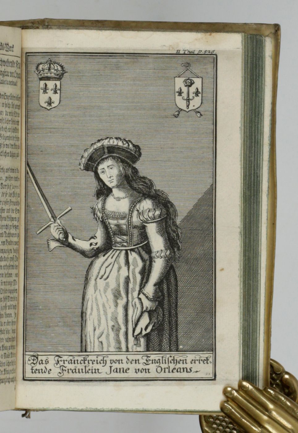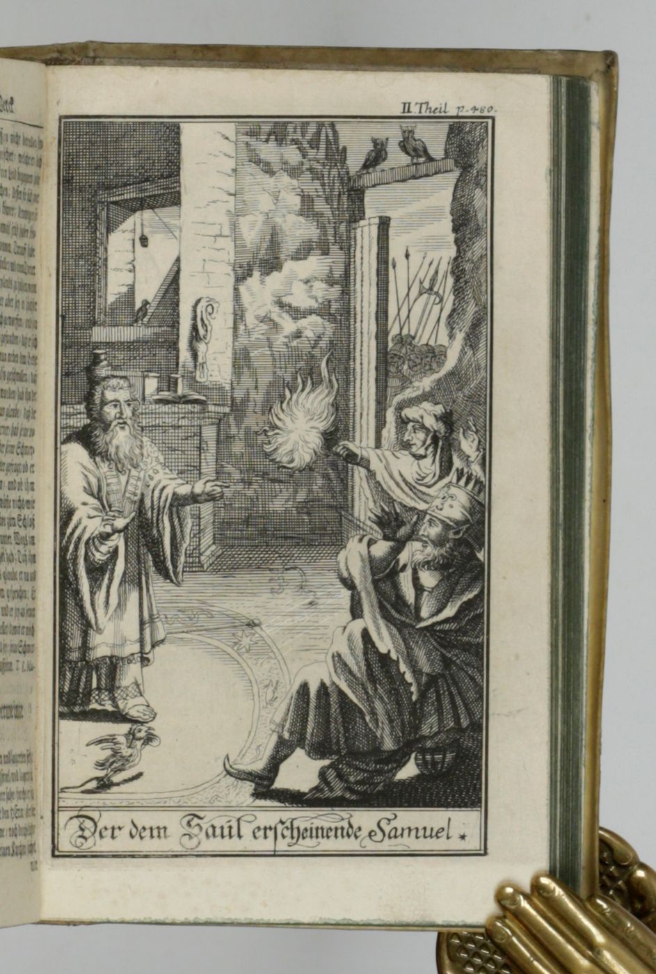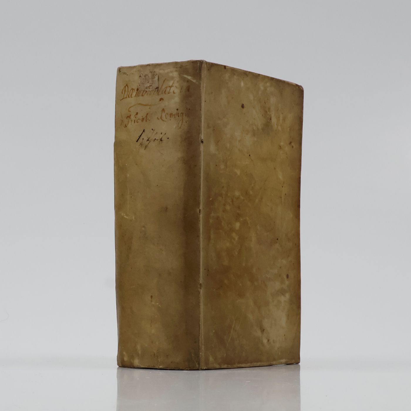 Hamburg, Thomas von Wiering, 1693. Small, thick 8vo ()16.8 x 10.6 cm). Two engraved frontispieces; three titles (first in red and black); 957 pp. (viii, 288; [vii], 544; 3-96, [xvi]); six engraved plates (for a total of eight page-sized engravings). Contemporary blind vellum. Script title in an old hand on the spine. Green edges.