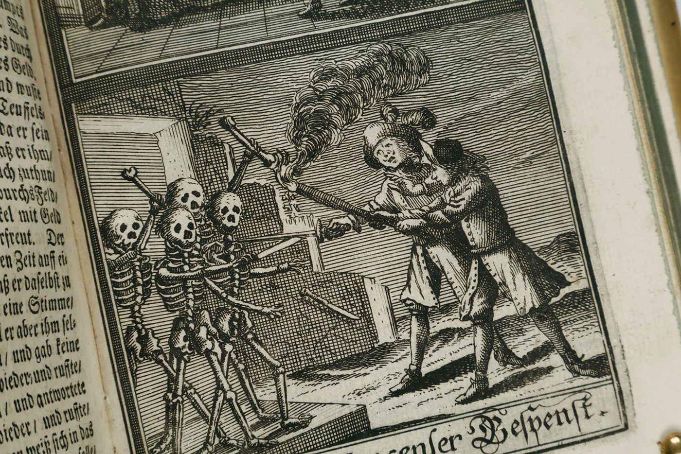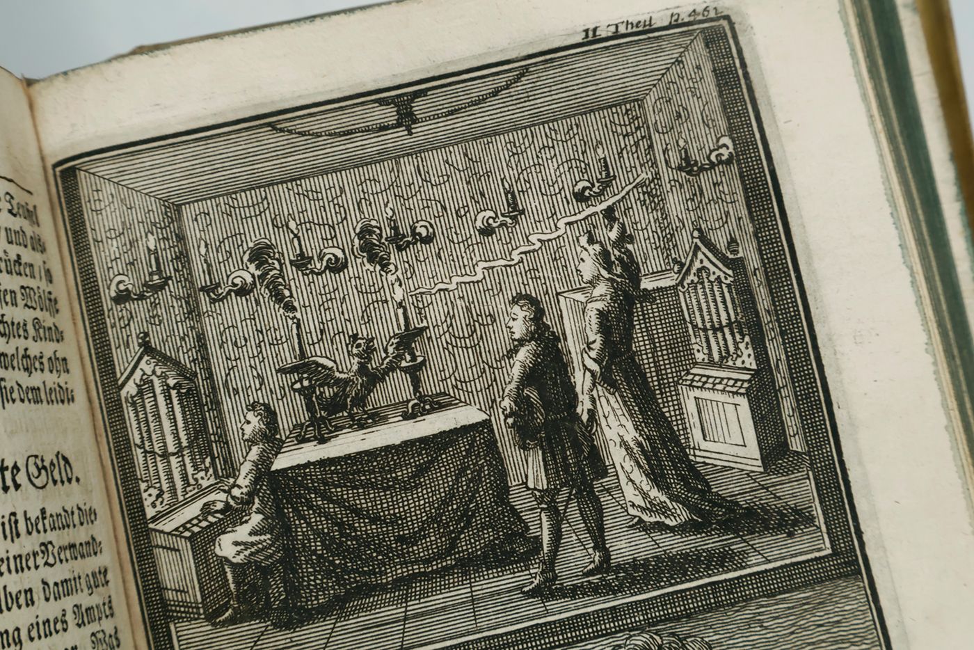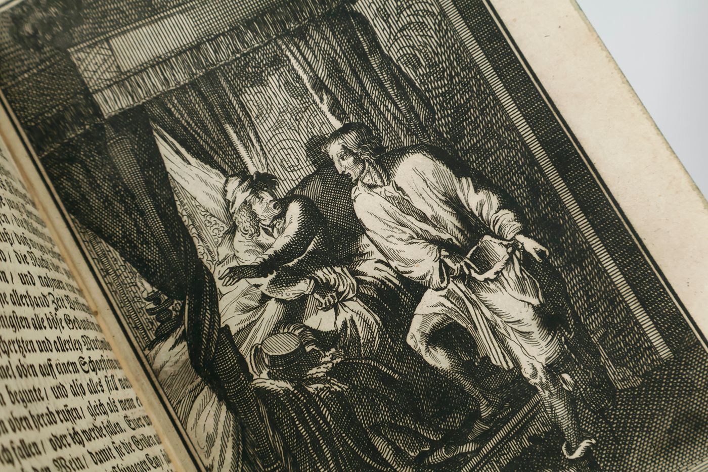 Hamburg, Thomas von Wiering, 1693. Small, thick 8vo ()16.8 x 10.6 cm). Two engraved frontispieces; three titles (first in red and black); 957 pp. (viii, 288; [vii], 544; 3-96, [xvi]); six engraved plates (for a total of eight page-sized engravings). Contemporary blind vellum. Script title in an old hand on the spine. Green edges.