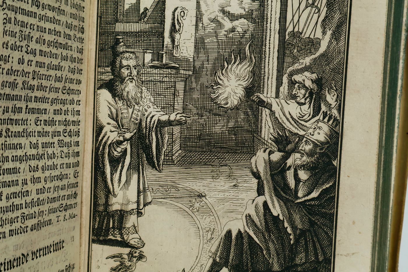 Written by the French witch hunter Nicholas Remy, or Remigius (1530-1616). German translation of the Latin 1595 original. This German edition is the first with fine and horrifying illustrations by the German engraver Diederich Lemkus. Remy "was a French magistrate who claimed in his book to have overseen the execution of more than 800 witches and the torture or persecution of a similar number. His work shows much influence from Jean Bodin. After studying law at the University of Toulouse, Remy practised in Paris from 1563 to 1570. In 1570, his uncle retired as Lieutenant General of Vosges and Remy was appointed to the post; in 1575 he was appointed secretary to Duke Charles III of Lorraine. Remy wrote a number of poems and several books on history, but is known for his Daemonolatreiae libri tres ("Demonolatry"), written in Latin and published in Lyon in 1595. The book was reprinted several times, translated into German [this work], and eventually replaced the Malleus Maleficarum as the most recognized handbook of witch-hunters in parts of Europe. According to Remy, the Devil could appear before people in the shape of a black cat or man, and liked Black Masses. Demons could also have sexual relationships with women and, in case they did not agree, rape them. He was of the Catholic faith, and wrote his Latin works with the blessings of the Church, but was not himself a priest and married at least once (possibly twice), fathering quite a few children. One of them, a favored son, was supposedly killed in a street accident at the beginning of Remy's judicial career after being cursed by an old beggar woman when Remy refused to give her any money. This incident in 1582 was the start of Remy's career as a witch-hunter. He successfully prosecuted the beggar for bewitching his son and had the woman put to death. Finding witches was very personal business for Remy. An extremely educated man for his day, he seemed to have utterly believed in what he was doing. Remy personally sentenced 900 people to death between 1581 and 1591. In 1592, Remy retired and moved to the country to escape the bubonic plague. There he compiled notes from his ten-year campaign against witchcraft into the Demonolatry"(Wikipedia). Remy's notoriety stretched into our lifetime: in the 1987 television series Werewolf, he is shown as a werewolf who has been alive since the times of the Inquisition. He used his position as a magistrate to conceal his own lycanthropy. The character was portrayed by Brian Thompson. Remy and the Daemonolatriae libri tres, are also featured in the 1999 movie The Ninth Gate. small stain to the lower margin of the first few text leaves; small, professional repair to the title near the gutter and in first blank, rear free endpaper cleaned; otherwise, a very good, clean, handsome copy. Brunet 4, p. 1217 (Latin editions); Thieme/Becker 23, p. 28 (for Lemkus).