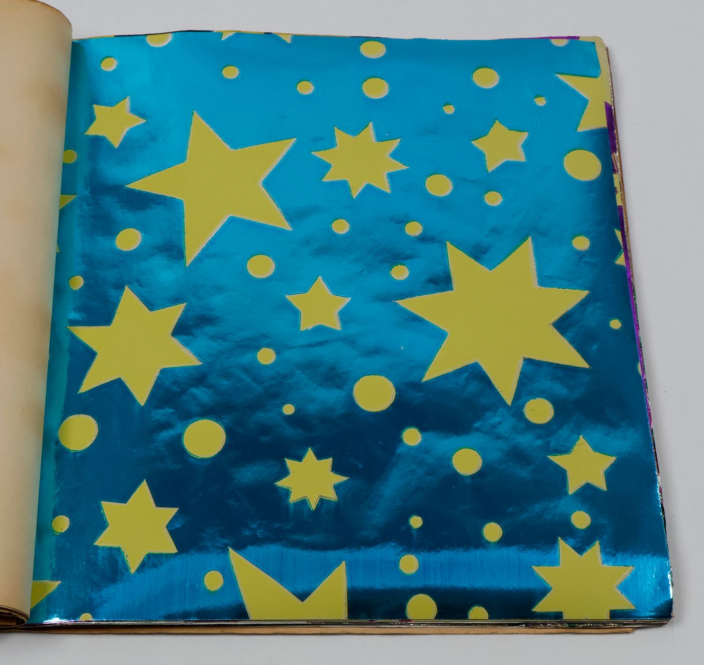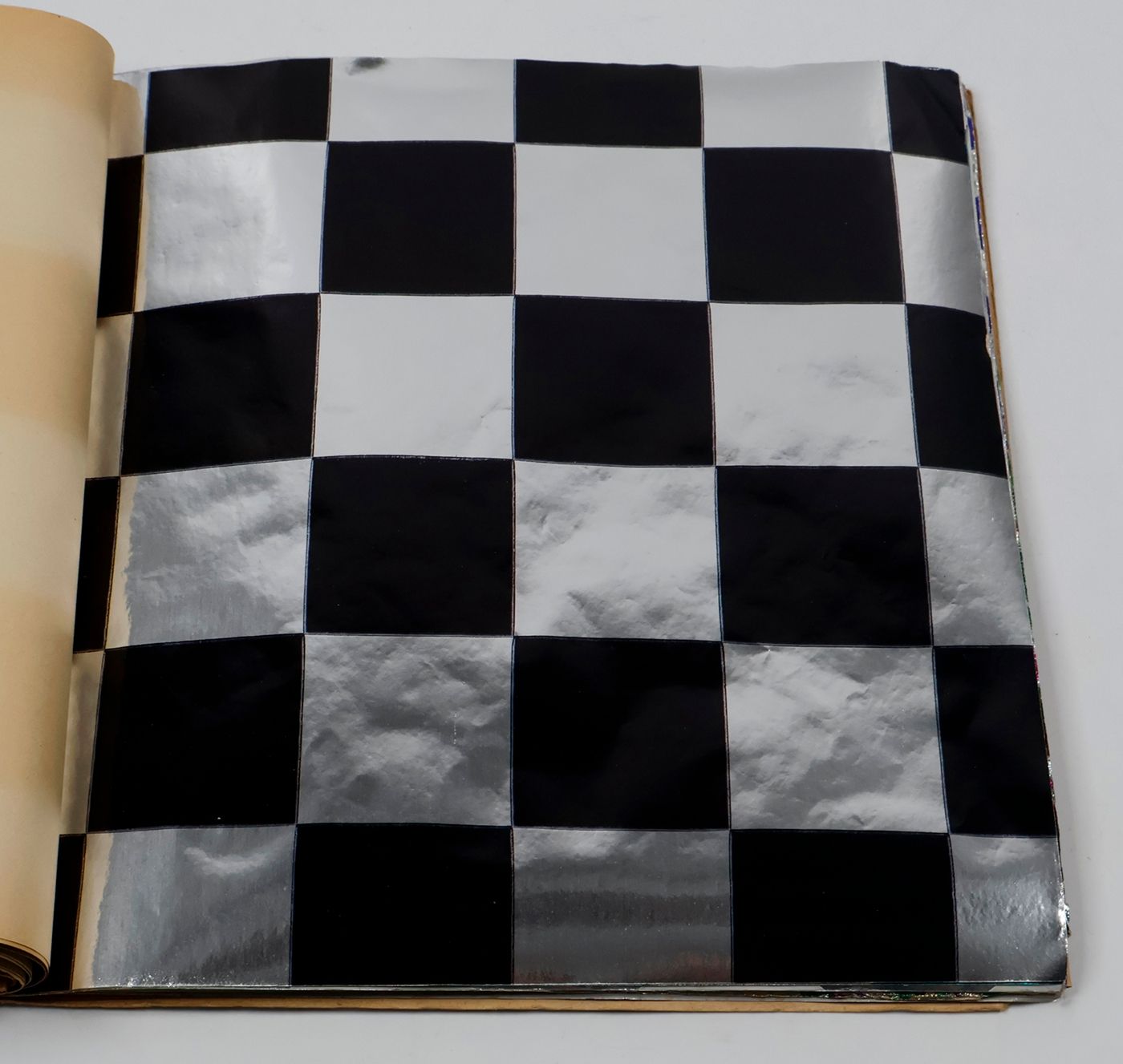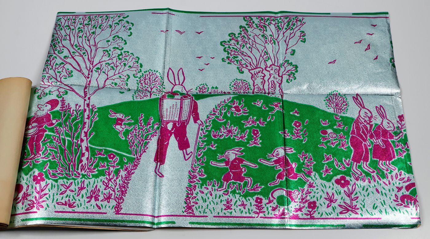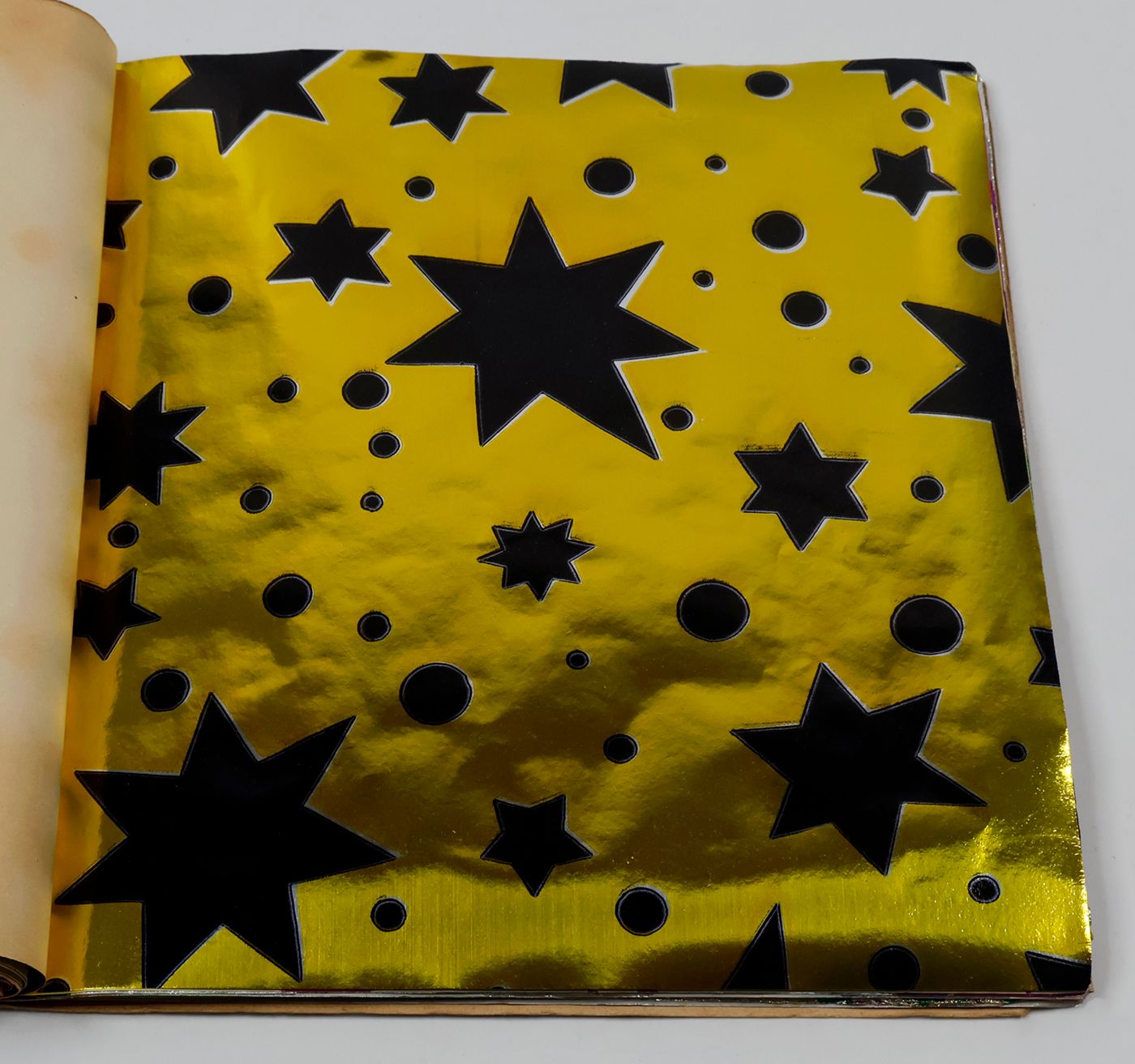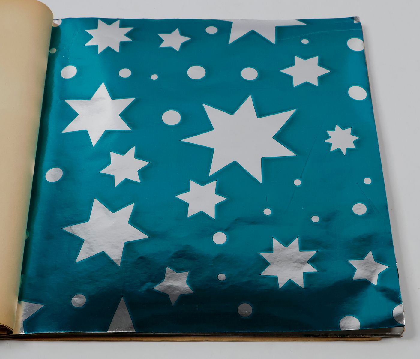 A fantastic and amazingly large-sized catalogue of aluminium or "tin" foil samples. Usually, the firm's sample catalogues are much smaller, oblong, but this one is fair and square superior, showing not just patterns (here; stars, of different sizes), but also Christmas an easter scenes, with bells and bunnies, etc. These are the gift wrappers that are a gift in themselves. Each leaf stamped on verso with a catalogue number. Edges a bit creased; the front wrapper with a very short, marginal tear; otherwise, in excellent condition. Rare.