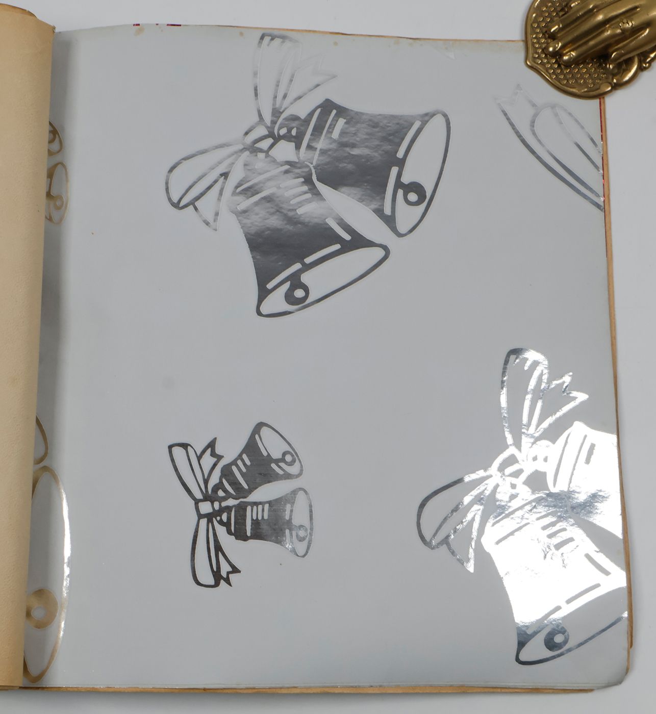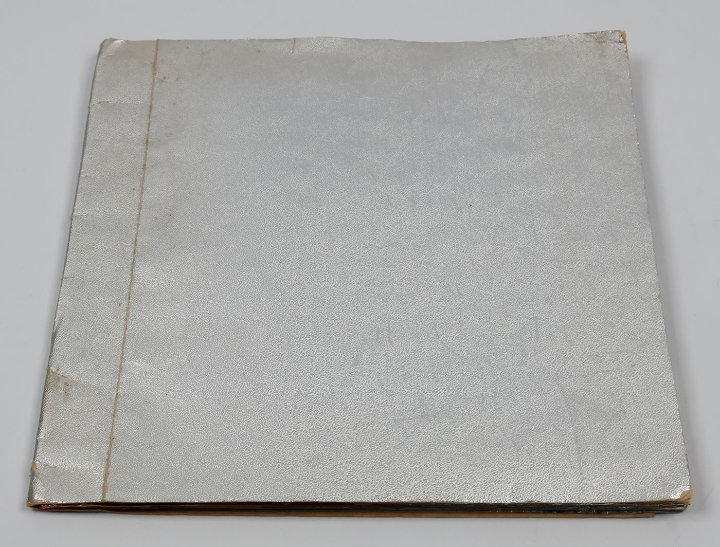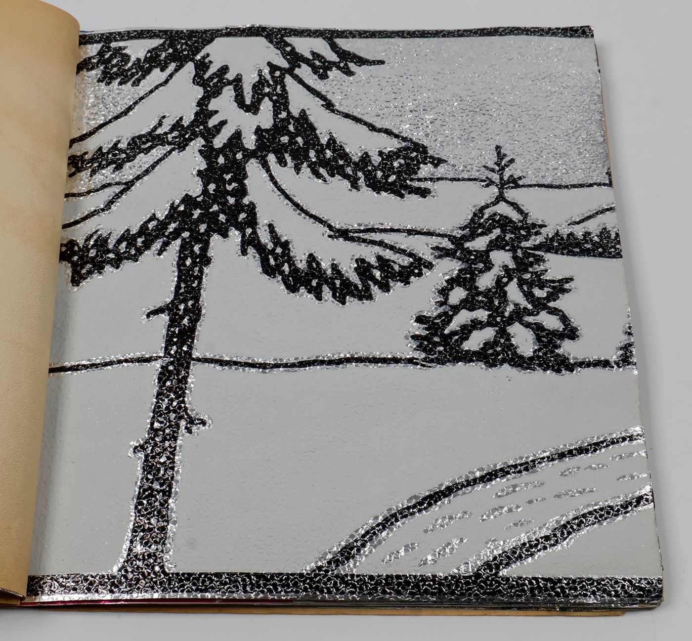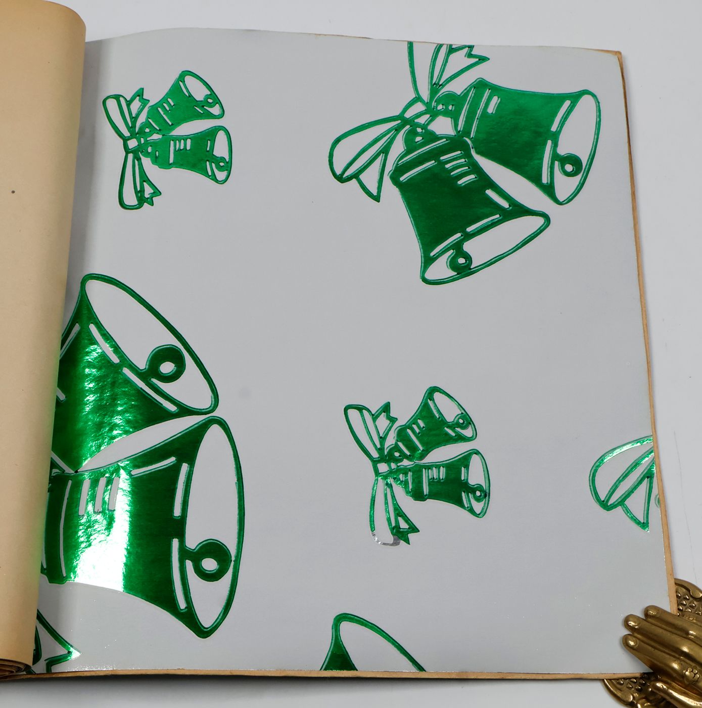 A fantastic and amazingly large-sized catalogue of aluminium or "tin" foil samples. Usually, the firm's sample catalogues are much smaller, oblong, but this one is fair and square superior, showing not just patterns (here; stars, of different sizes), but also Christmas an easter scenes, with bells and bunnies, etc. These are the gift wrappers that are a gift in themselves. Each leaf stamped on verso with a catalogue number. Edges a bit creased; the front wrapper with a very short, marginal tear; otherwise, in excellent condition. Rare.