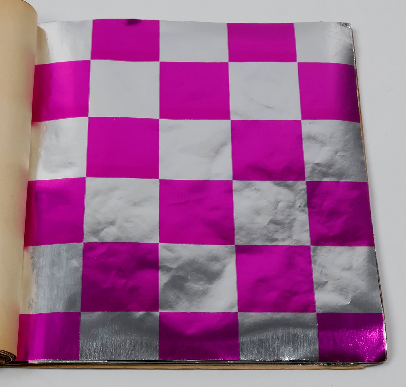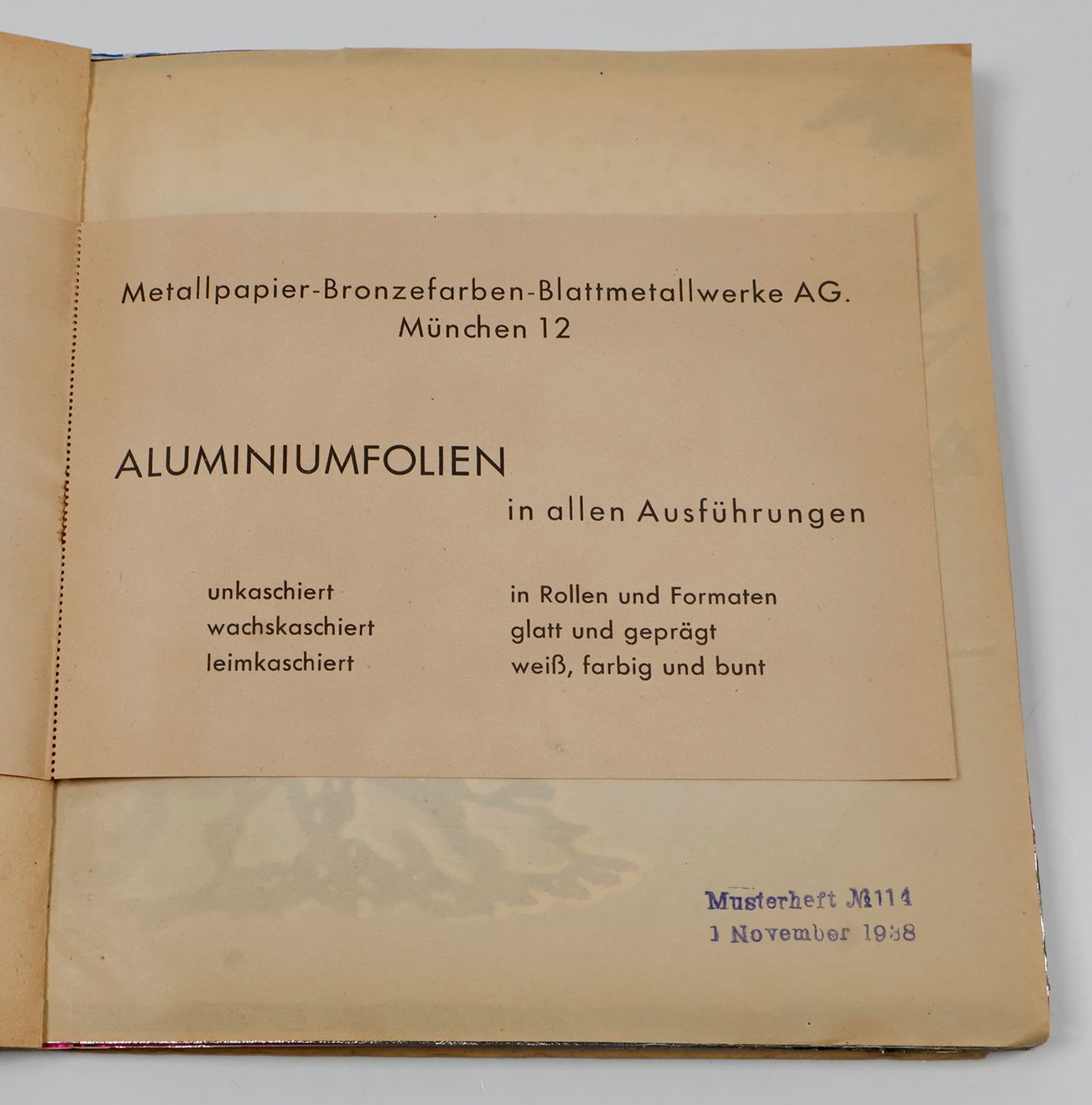 Munich, Metallpapier- Bronzefarben- Blattmetallwerke Aktiengesellschaft München, 1938. One large, square folio catalogue (24.3 x 24.2 cm). Deliberately smaller, removeable title page; translucent blank with stamp "Musterheft No. 114 / 1 November 1938"; 33 aluminium foil leaves (of which 3 folding). Each either in silver or gold, and each with a different embossing. Plain, silver, pitted wrappers.