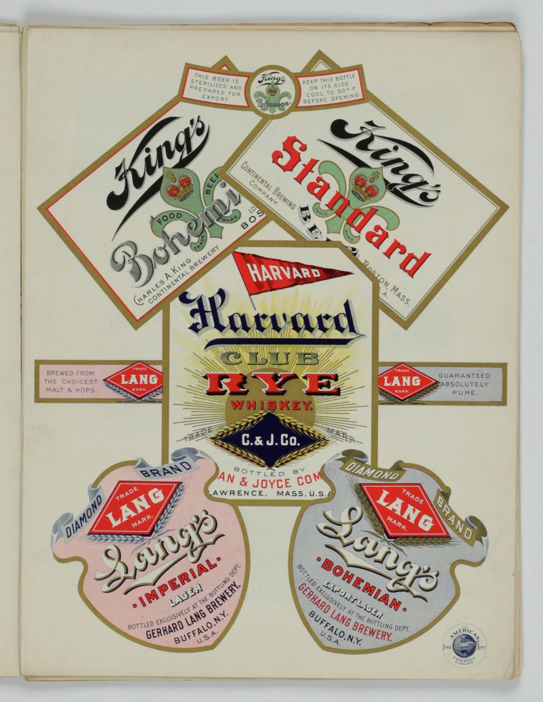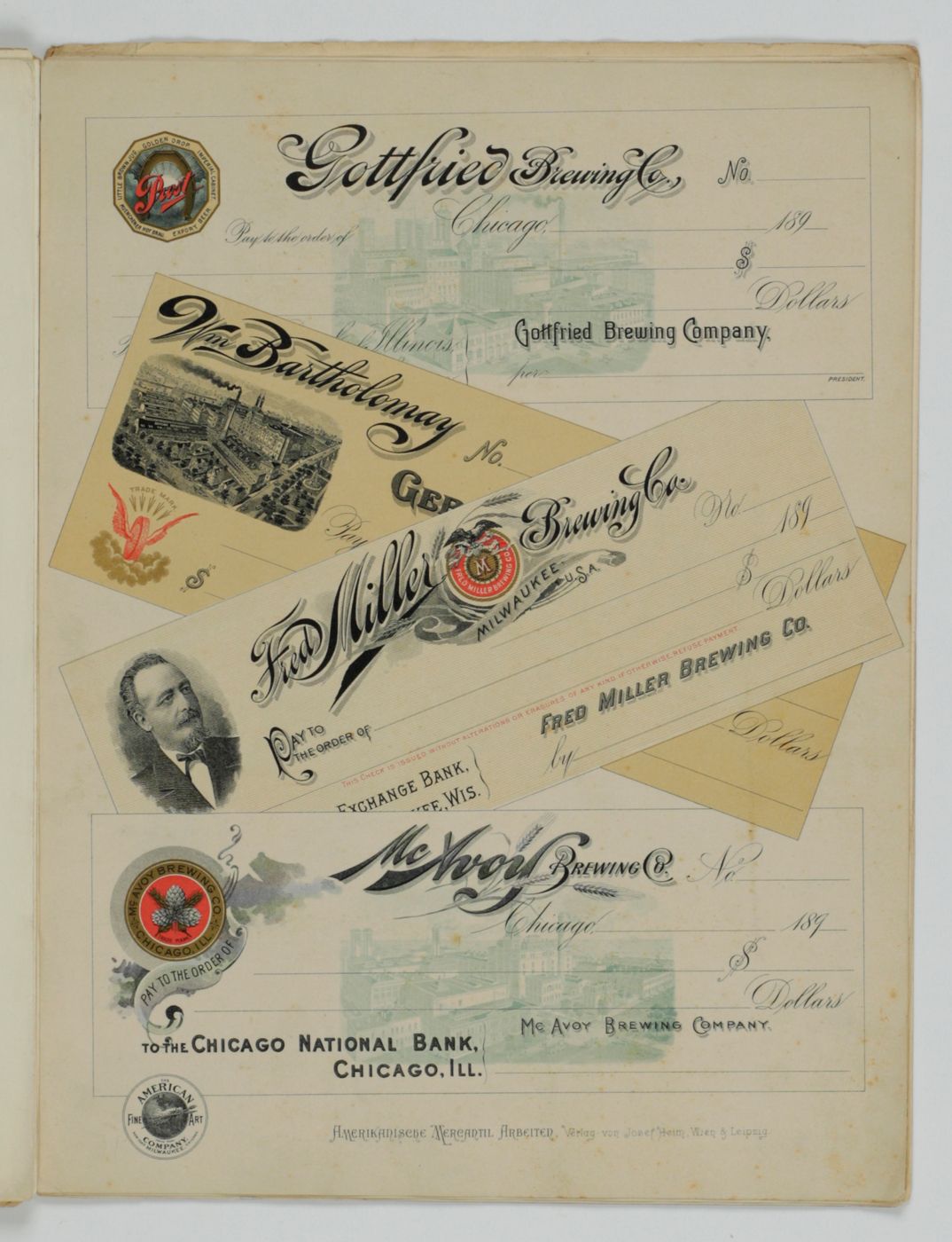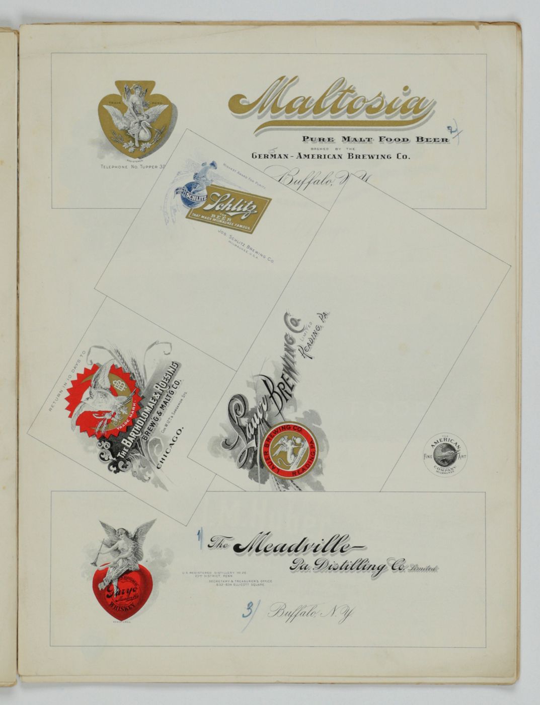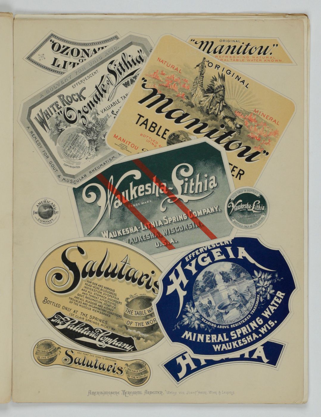 A potpourri of American advertising and label designs, meant as examples of the newest trends in commercial communication, apparently aimed at German and Austrian entrepreneurs. It is an early documentation of the growing influence of American culture on Europe, in particular on trade and commerce. Examples shown include beer and whiskey labels. The printer is the American Fine Art Company of Milwaukee (their logo on several leaves). Another, later edition, apparently titled "Second Series", and with only 24 plates, is known. Another antiquarian book-dealer stated "The only listing on OCLC is of a copy with the same pagination in St. Gallen, but with no mention of second series". Wrappers torn at fold. One leaf worn and chipped at edges, one with a short, marginal tear, otherwise very good. Exceedingly rare.