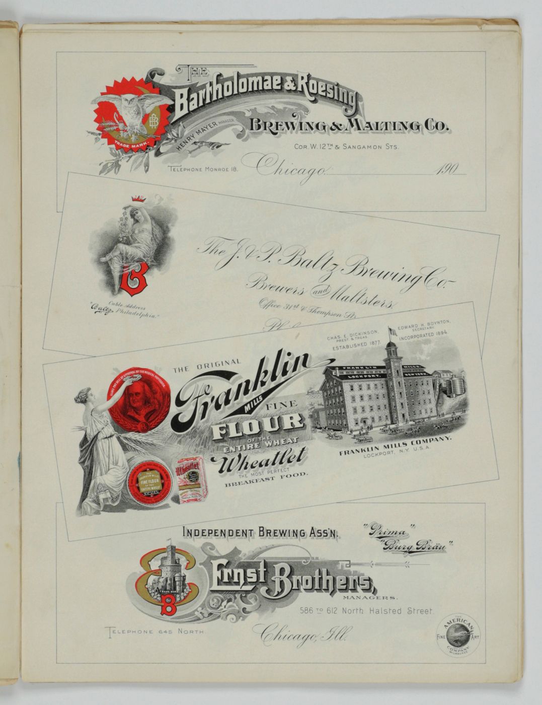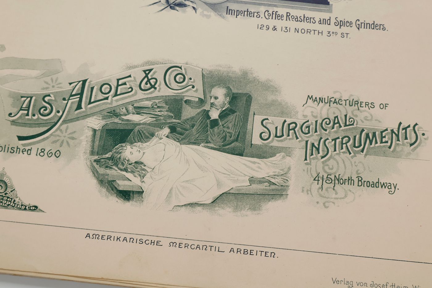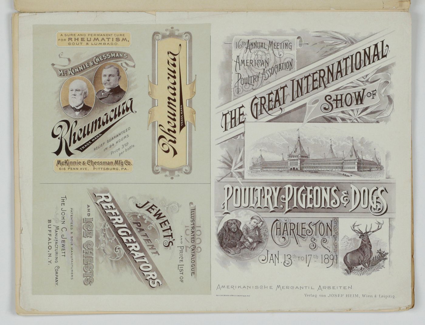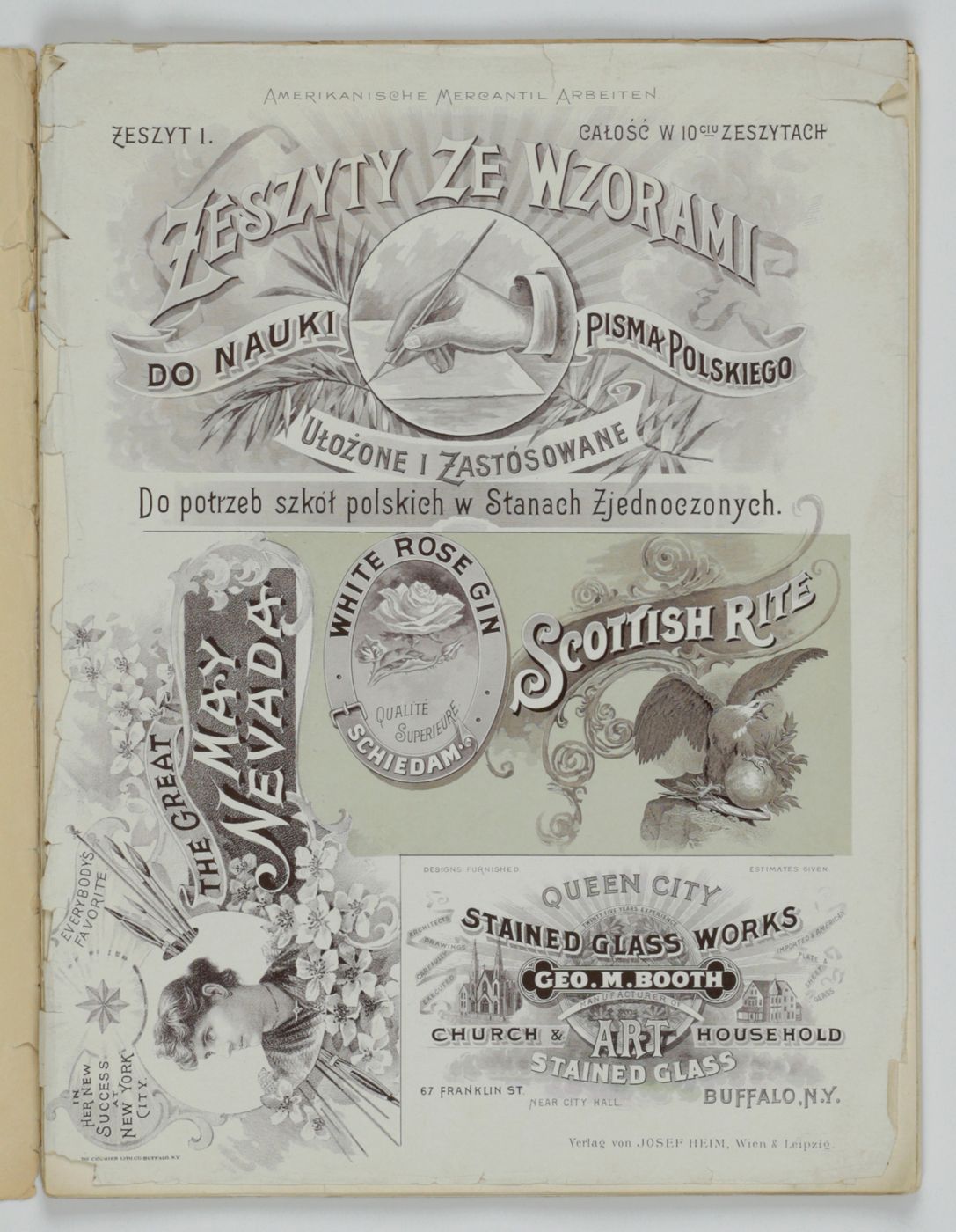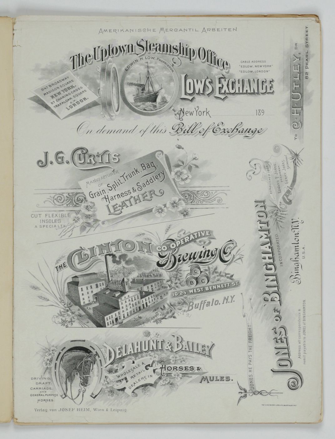 A potpourri of American advertising and label designs, meant as examples of the newest trends in commercial communication, apparently aimed at German and Austrian entrepreneurs. It is an early documentation of the growing influence of American culture on Europe, in particular on trade and commerce. Examples shown include beer and whiskey labels. The printer is the American Fine Art Company of Milwaukee (their logo on several leaves). Another, later edition, apparently titled "Second Series", and with only 24 plates, is known. Another antiquarian book-dealer stated "The only listing on OCLC is of a copy with the same pagination in St. Gallen, but with no mention of second series". Wrappers torn at fold. One leaf worn and chipped at edges, one with a short, marginal tear, otherwise very good. Exceedingly rare.