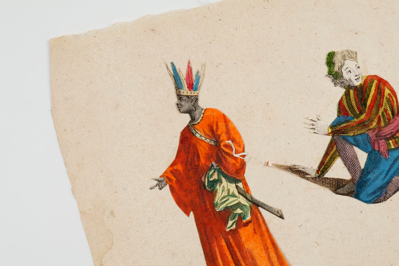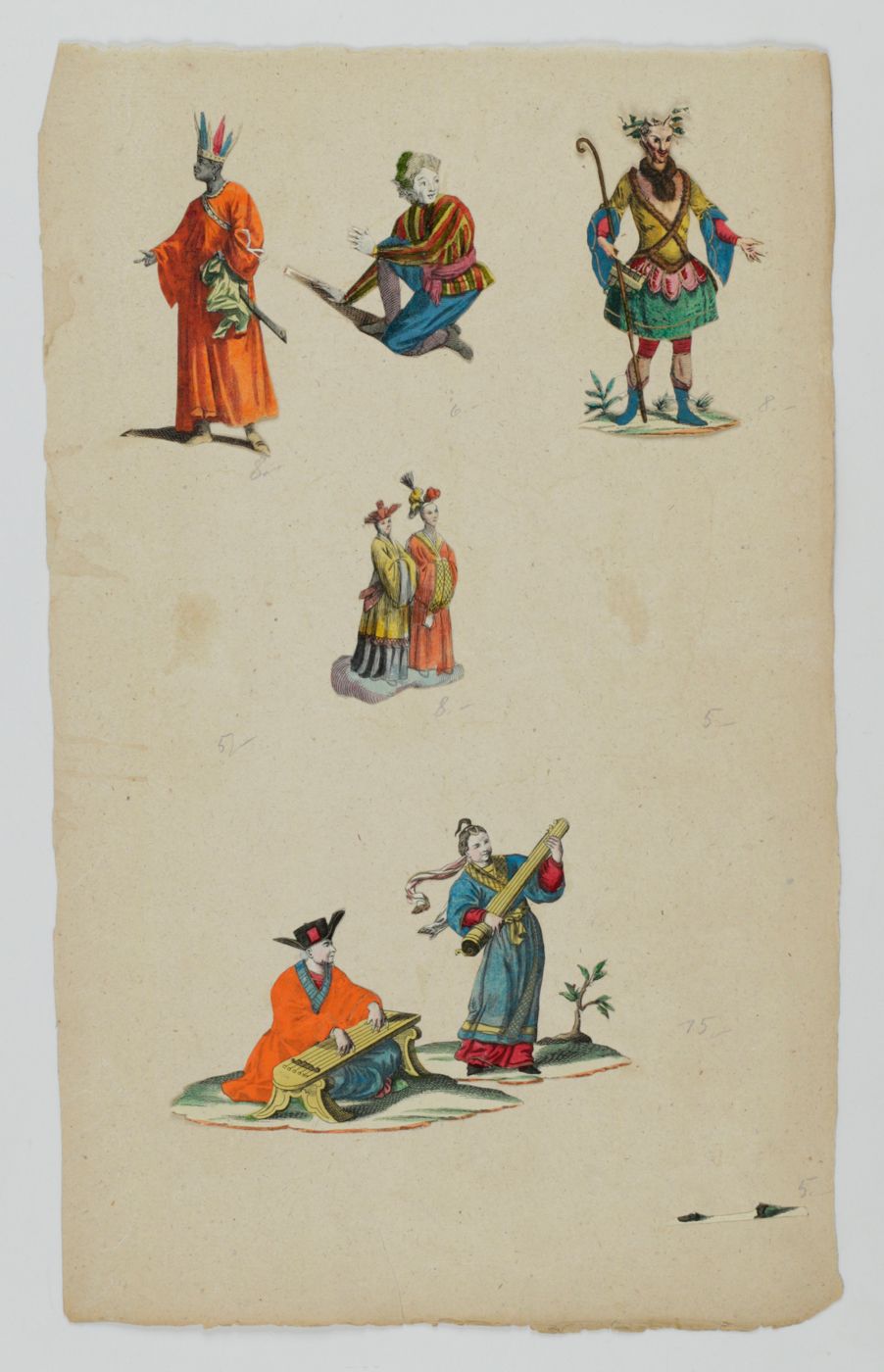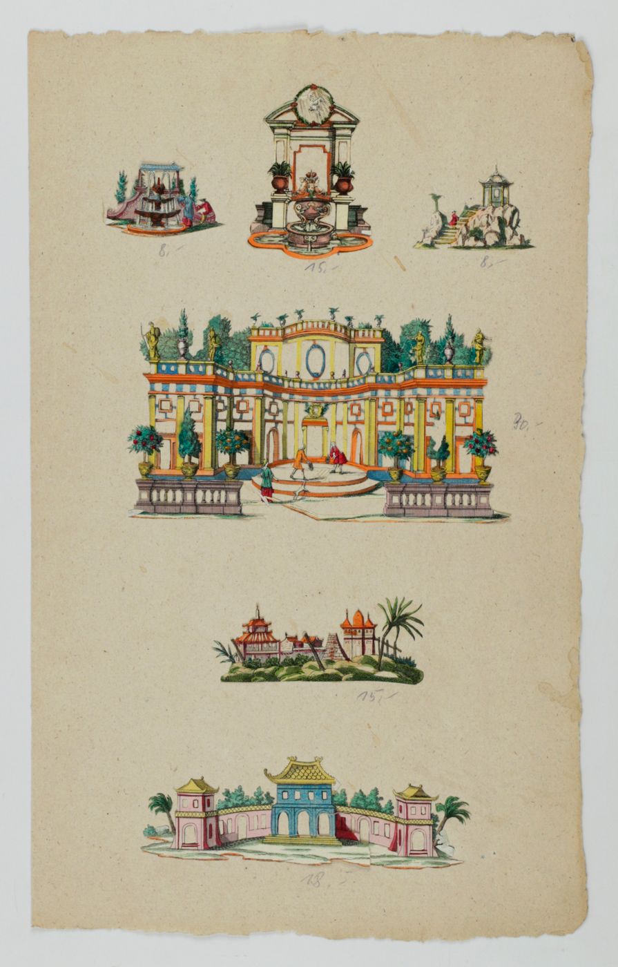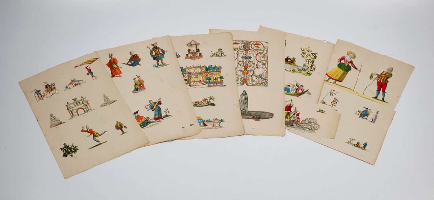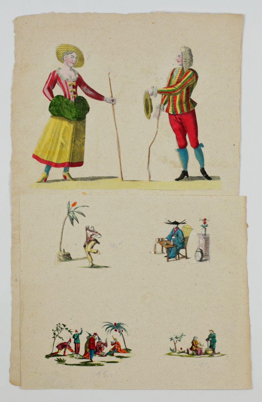 Martin Engelbrecht (1684-1756) and his brother Christian were successful German illustrators and engravers from the Augsburg School at the beginning of the 18th century. Martin Engelbrecht was probably the first to create cards specially designed for miniature theatres, portable dioramas that became highly successful in the second half of the 18th and early part of the 19th centuries, before being replaced by the magic lantern, home film and video, etc. Engelbrecht devoted entire series of these illustrations to the Italian and Chinese theatre. They were, however, also used in scrapbooks. It is rare to see so these original sheets, all, except one, without cutouts. An unusual high number show oriental, mostly Chines people, and scenery. All are in contemporary, if not original, hand-colouring. Most leaves uncut. Two blank leaves present in the rear. Paper strong and clean. Printing and colouring bright and natural. A unique item.