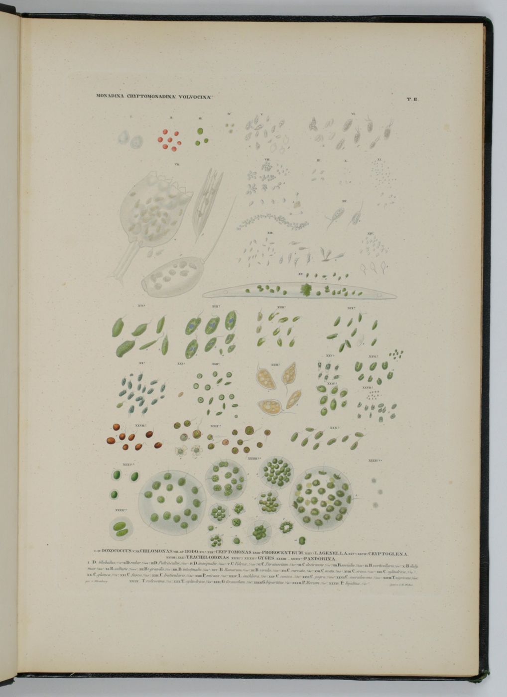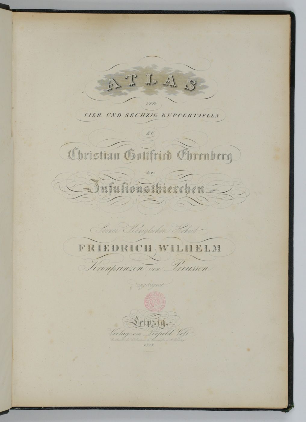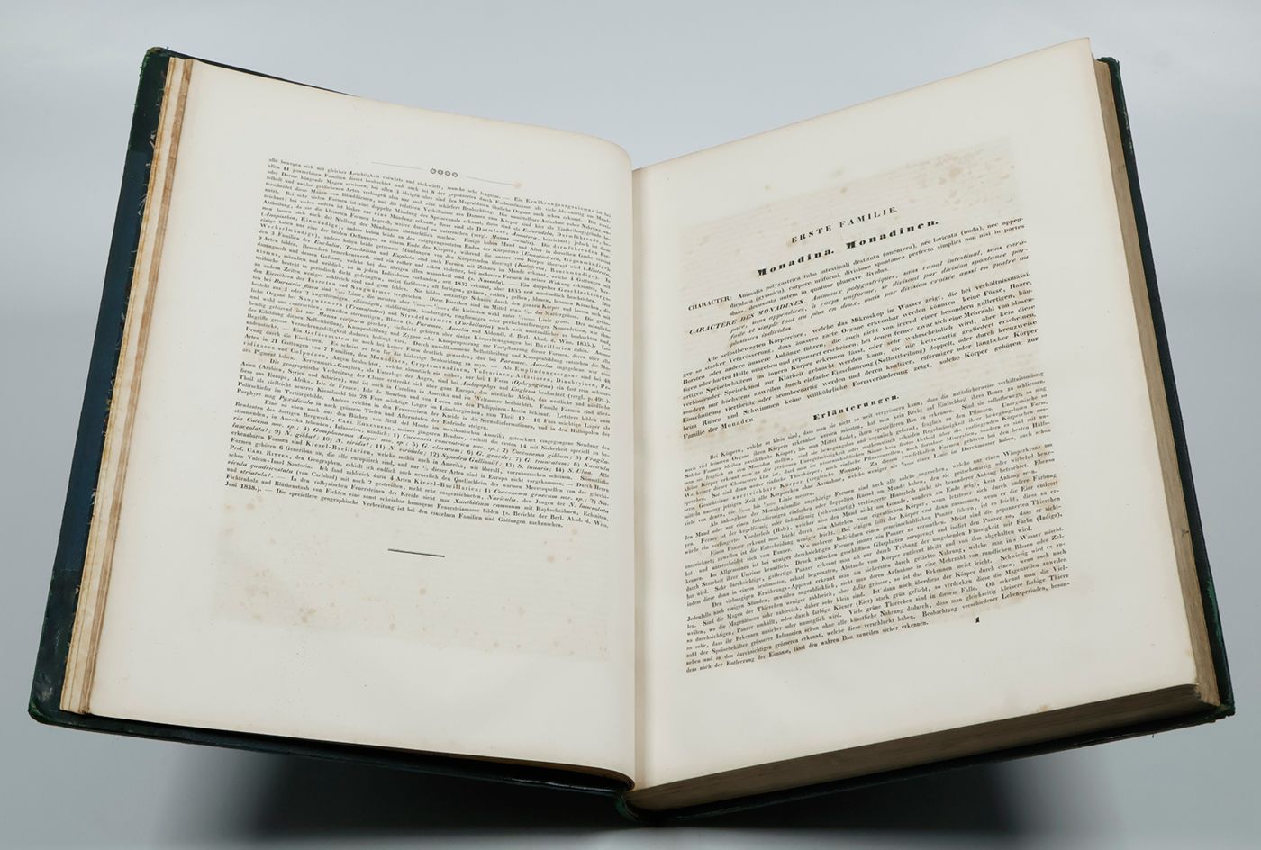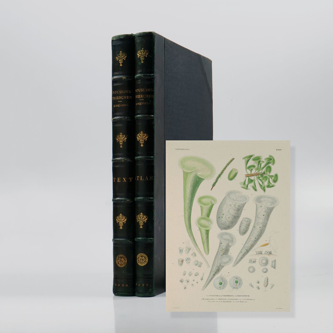 Magnum opus, introducing the systematic study of micro-organisms, and the concept that they are neither animals nor plants, of the German zoologist, explorer, and microscopist Chistian Gottfried Ehrenberg (1795-1876). The fine plates are after original drawings by Ehrenberg himself, who was an accomplished artist. "Ehrenberg was the premier microscopist for most of the 19th century, famous in his time for drawing attention to microorganisms both living and fossil. Today he is credited as one of the founders of protozoology by authoring a "truly monumental monograph", his 1838 Die Infusionsthierschen als volkommene Organismen [this work]. The monograph included an "Atlas" of 64 hand-colored plates illustrating living microorganisms. The work has been described as "the most sumptuously illustrated classic of the field" (Churchill 1989). By the late 1830's, Ehrenberg had turned his attention to studies of the remains of microorganisms in atmospheric dust, soils, minerals and sediments. He was the first to systematically investigate the remains of microorganisms, shells, skeletons, etc., and today is credited as the "Founder of Micropaleontology" (Dolan). Provenance: very small circular stamp of the Quekett Microscopical Club on both titles; a few text page margins, and on plate versos (not shining through), "Presented by Mr [illegible]" (dated 1884); gilt Club logo on spines' foot. Extremities a bit dry and worn or scuffed. Scattered foxing to the text, however, mostly clean. Some plates with minute spotting, due to the paper quality. Very rare work, most copies with more serious paper or foxing problems than here, all considered this is a very good copy. Cat. BM(NH), p. 515; Churchill, F. B. (1989). The guts of the matter: infusoria from Ehrenberg to Bütschli: 1838-1876. In: Journal of the History of Biology, 22 pp. 189-213; Dolan, J. R. (2022) The Lesser-Known Scientific Art of Christian Gottfried Ehrenberg; Nissen ZBI, 1244.