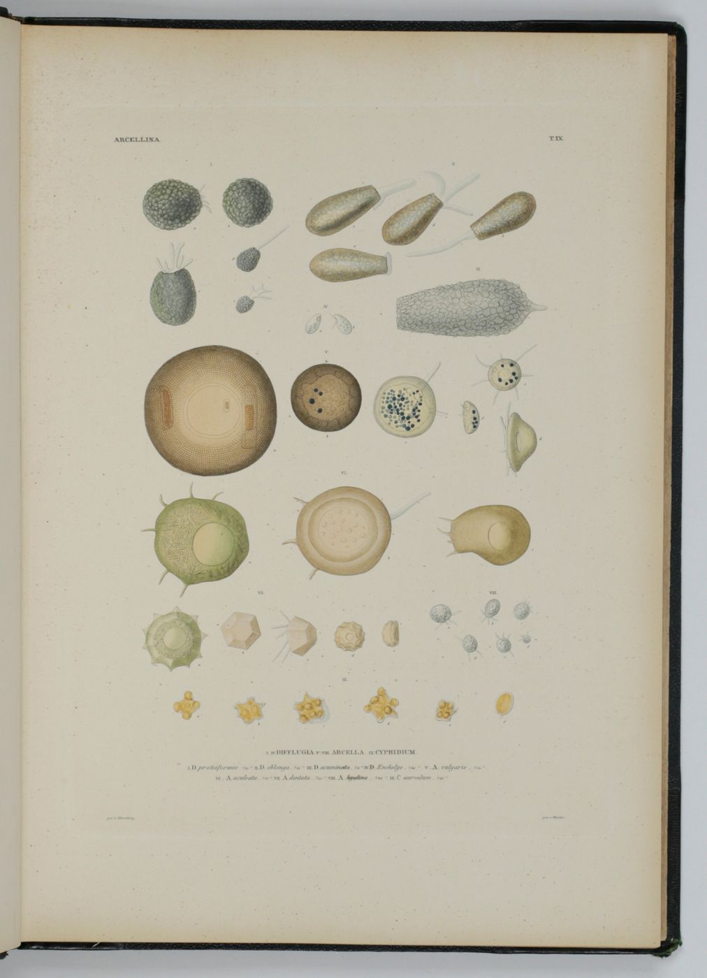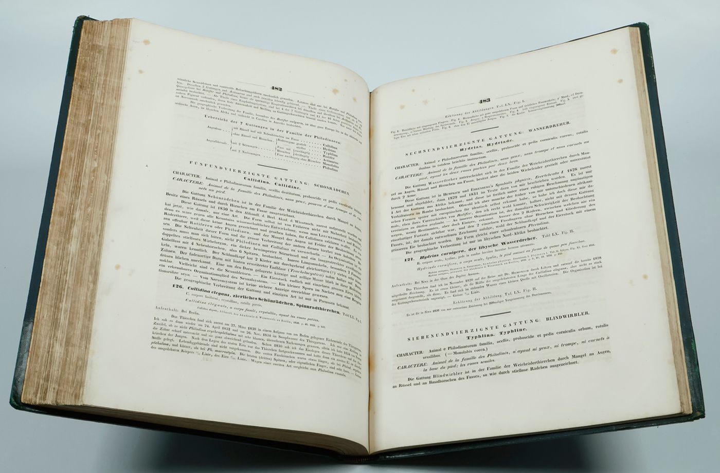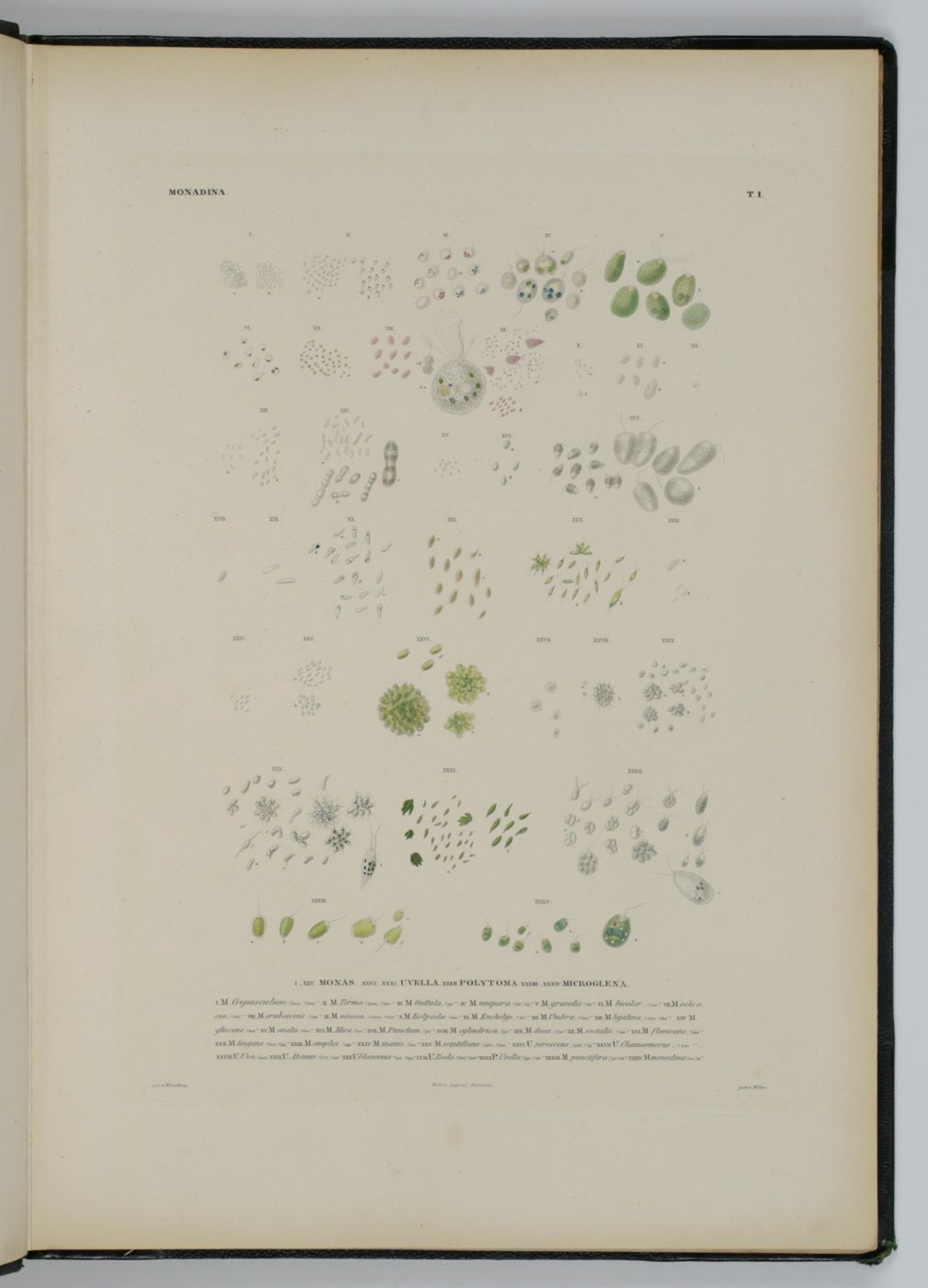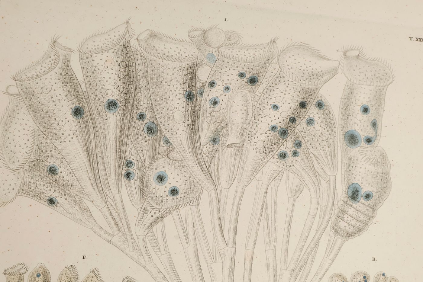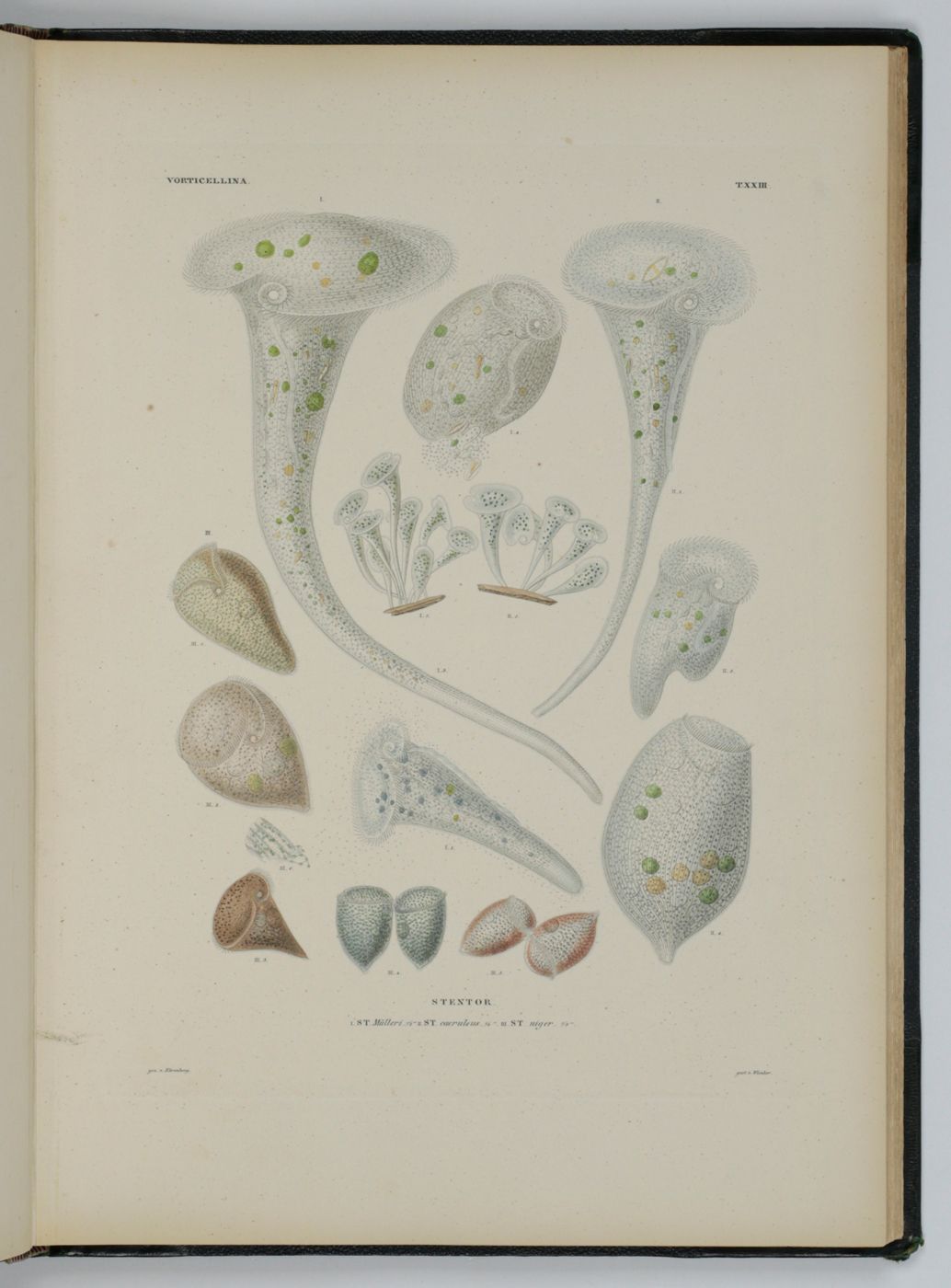 Magnum opus, introducing the systematic study of micro-organisms, and the concept that they are neither animals nor plants, of the German zoologist, explorer, and microscopist Chistian Gottfried Ehrenberg (1795-1876). The fine plates are after original drawings by Ehrenberg himself, who was an accomplished artist. "Ehrenberg was the premier microscopist for most of the 19th century, famous in his time for drawing attention to microorganisms both living and fossil. Today he is credited as one of the founders of protozoology by authoring a "truly monumental monograph", his 1838 Die Infusionsthierschen als volkommene Organismen [this work]. The monograph included an "Atlas" of 64 hand-colored plates illustrating living microorganisms. The work has been described as "the most sumptuously illustrated classic of the field" (Churchill 1989). By the late 1830's, Ehrenberg had turned his attention to studies of the remains of microorganisms in atmospheric dust, soils, minerals and sediments. He was the first to systematically investigate the remains of microorganisms, shells, skeletons, etc., and today is credited as the "Founder of Micropaleontology" (Dolan). Provenance: very small circular stamp of the Quekett Microscopical Club on both titles; a few text page margins, and on plate versos (not shining through), "Presented by Mr [illegible]" (dated 1884); gilt Club logo on spines' foot. Extremities a bit dry and worn or scuffed. Scattered foxing to the text, however, mostly clean. Some plates with minute spotting, due to the paper quality. Very rare work, most copies with more serious paper or foxing problems than here, all considered this is a very good copy. Cat. BM(NH), p. 515; Churchill, F. B. (1989). The guts of the matter: infusoria from Ehrenberg to Bütschli: 1838-1876. In: Journal of the History of Biology, 22 pp. 189-213; Dolan, J. R. (2022) The Lesser-Known Scientific Art of Christian Gottfried Ehrenberg; Nissen ZBI, 1244.