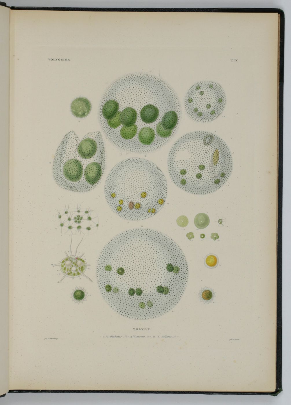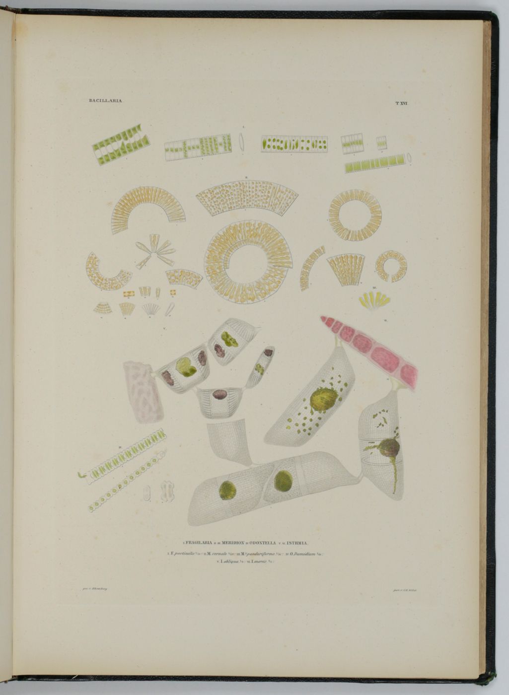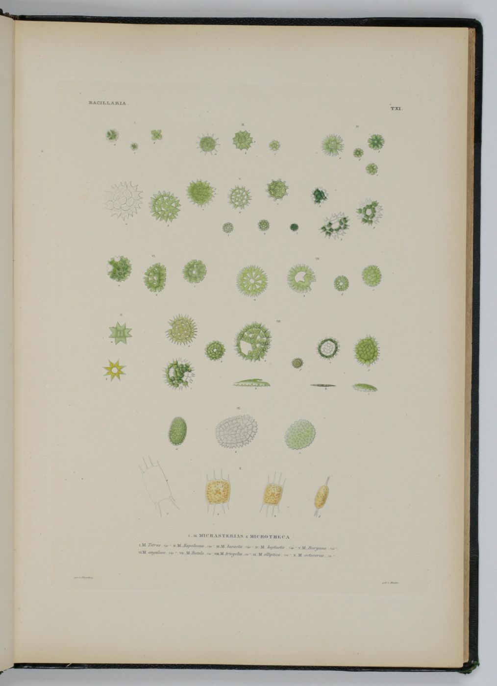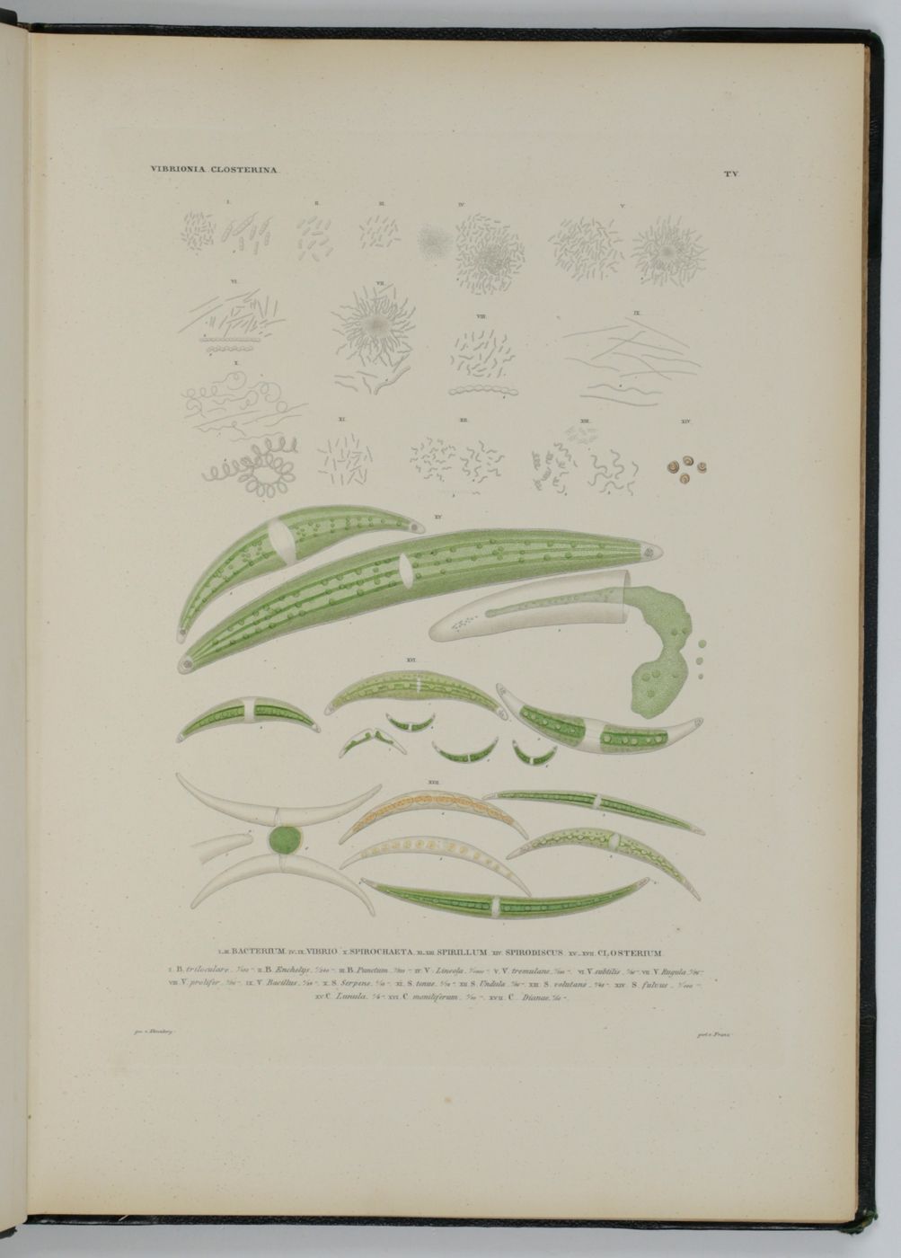 Magnum opus, introducing the systematic study of micro-organisms, and the concept that they are neither animals nor plants, of the German zoologist, explorer, and microscopist Chistian Gottfried Ehrenberg (1795-1876). The fine plates are after original drawings by Ehrenberg himself, who was an accomplished artist. "Ehrenberg was the premier microscopist for most of the 19th century, famous in his time for drawing attention to microorganisms both living and fossil. Today he is credited as one of the founders of protozoology by authoring a "truly monumental monograph", his 1838 Die Infusionsthierschen als volkommene Organismen [this work]. The monograph included an "Atlas" of 64 hand-colored plates illustrating living microorganisms. The work has been described as "the most sumptuously illustrated classic of the field" (Churchill 1989). By the late 1830's, Ehrenberg had turned his attention to studies of the remains of microorganisms in atmospheric dust, soils, minerals and sediments. He was the first to systematically investigate the remains of microorganisms, shells, skeletons, etc., and today is credited as the "Founder of Micropaleontology" (Dolan). Provenance: very small circular stamp of the Quekett Microscopical Club on both titles; a few text page margins, and on plate versos (not shining through), "Presented by Mr [illegible]" (dated 1884); gilt Club logo on spines' foot. Extremities a bit dry and worn or scuffed. Scattered foxing to the text, however, mostly clean. Some plates with minute spotting, due to the paper quality. Very rare work, most copies with more serious paper or foxing problems than here, all considered this is a very good copy. Cat. BM(NH), p. 515; Churchill, F. B. (1989). The guts of the matter: infusoria from Ehrenberg to Bütschli: 1838-1876. In: Journal of the History of Biology, 22 pp. 189-213; Dolan, J. R. (2022) The Lesser-Known Scientific Art of Christian Gottfried Ehrenberg; Nissen ZBI, 1244.